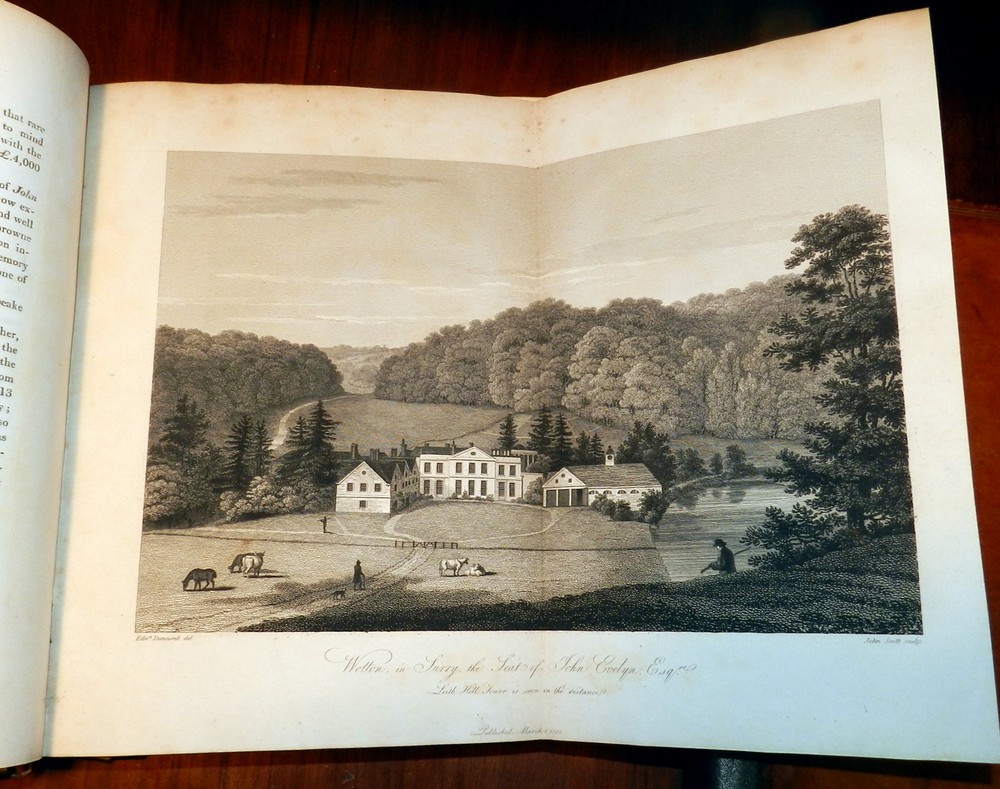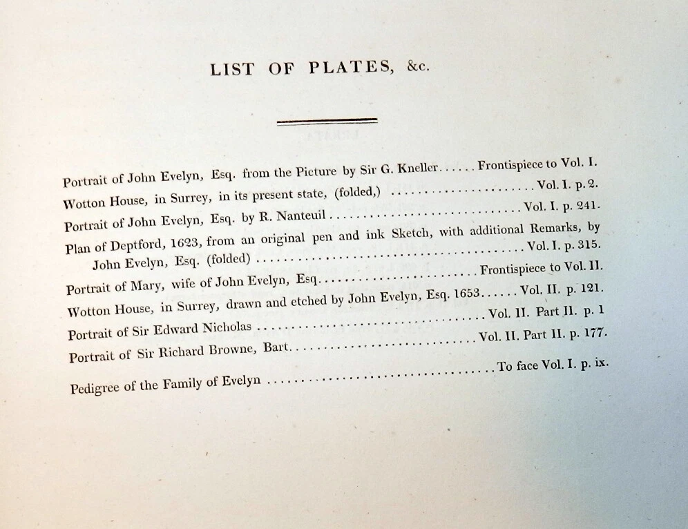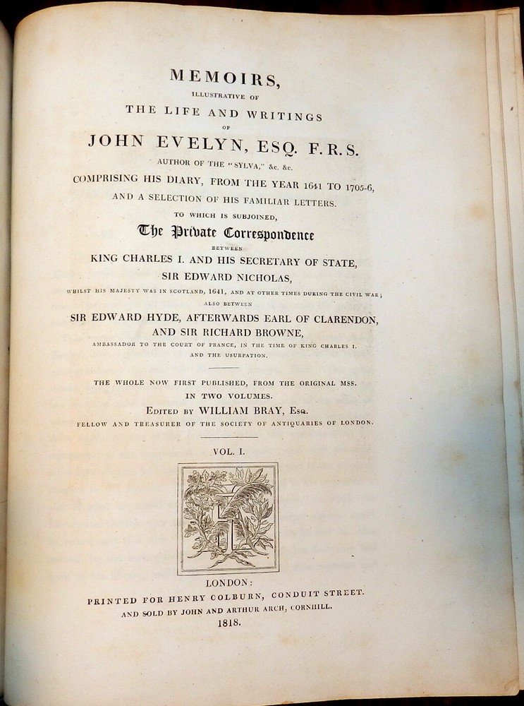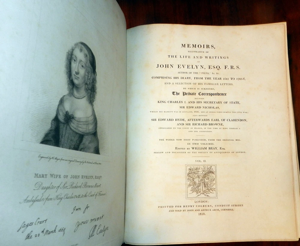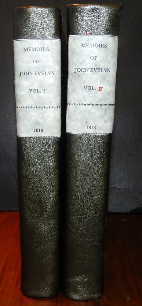 MEMOIRS OF JOHN EVELYN, 2 Vols. 1818 1st Ed. Leather, Plates. English Diarist MEMOIRS OF JOHN EVELYN, 2 Vols. 1818 1st Ed. Leather, Plates. English Diarist MEMOIRS ILLUSTRATIVE OF THE LIFE AND WRITINGS OF JOHN EVELYN, ESQ. F.R.S. Comprising his Diary, from the year 1641 to 1705-6, and a selection of his familiar letters. To which is subjoined, The Private Correspondence between King Charles I. and his Secretary of State, Sir Edward Nicholas, Whilst his Majesty was in Scotland, 1641, and at other times during the Civil War; also between Sir Edward Hyde, afterwards Earl of Clarendon, and Sir Richard Browne, Ambassador to the Court of France, in the time of King Charles I. and the Usurpation. The whole now first published, from the original mss. in two volumes Edited by William Bray, Esq. Fellow and Treasurer of the Society of Antiquaries of London London: Printed for Henry Colburn, 1818. First Edition. Two volumes. Hardcovers. Full leather, original polished calf boards with gilt rulings, later leather spine and spine labels, marbled page edges. Large quartos (11.9 inches tall). Volume I: xxiii, [1], 620 pages + portrait frontis + 2 plates (1 folding) + 1 genealogical table (folding) + 1 plan of Deptford (folding). Volume II: viii, [4], 366, [1], [1], 335, [1] pages + portrait frontis + 3 plates. Armorial book plate of early owner (E. Herbert Litchfield) on front pastedowns as well as a second bookplate of Francis Turreff. John Evelyn FRS (31 October 1620 – 27 February 1706) was an English writer, gardener and diarist. John Evelyn's diary, or memoir, spanned the period of his adult life from 1640, when he was a student, to 1706, the year he died. He did not write daily at all times. The many volumes provide insight into life and events at a time before regular magazines or newspapers were published, making diaries of greater interest to modern historians than such works might have been at later periods. Evelyn's work covers art, culture and politics, including the execution of Charles I, Oliver Cromwell's rise and eventual natural death, the last Great Plague of London, and the Great Fire of London in 1666. Evelyn's posthumously "rival" diarist, Samuel Pepys, wrote a different kind of diary, covering a much shorter period, 1660–1669, but in much greater depth, within the same era. Over the years, Evelyn's Diary has been overshadowed by Pepys's chronicles of 17th-century life. Evelyn's Diary remained unpublished as a manuscript until 1818. It is in a quarto volume containing 700 pages, covering the years between 1641 and 1697, and is continued in a smaller book – which brings the narrative down to within three weeks of its author's death. Despite entries going back to 1641, Evelyn only actually started writing his diary much later, relying on almanacs and accounts of other people for many of the earlier events. A selection from this was edited by William Bray, with the permission of the Evelyn family, in 1818, under the title of Memoirs illustrative of the Life and Writings of John Evelyn, comprising his Diary from 1641 to 1705/6, and a Selection of his Familiar Letters. CONDITION: Good Covers. / Very Good+ Contents. (Covers have edge and corner wear, rubbing and soil, some erosion of gilt rulings. Original spines are replaced by later leather spines and title labels. The tightly bound Contents are complete and intact with some offsetting and foxing of title pages and other pages adjacent to the plates, occasional marginal foxing spots of text pages, light or moderate foxing spots on the margins of the plates.) Check our other auctions and store listings for additional unusual items Check our other auctions and store listings for additional unusual items Listing and template services provided by inkFrog