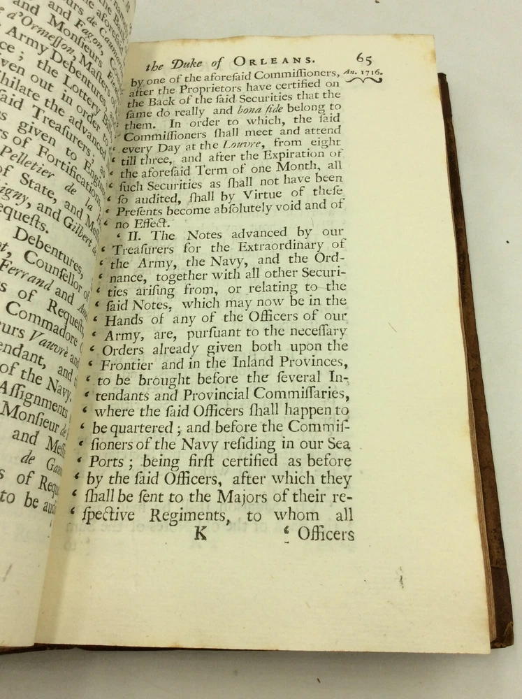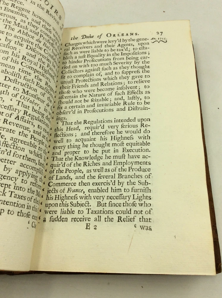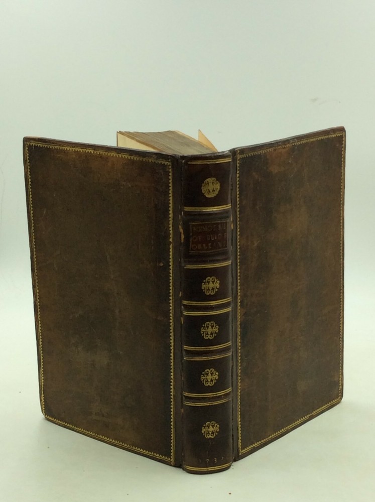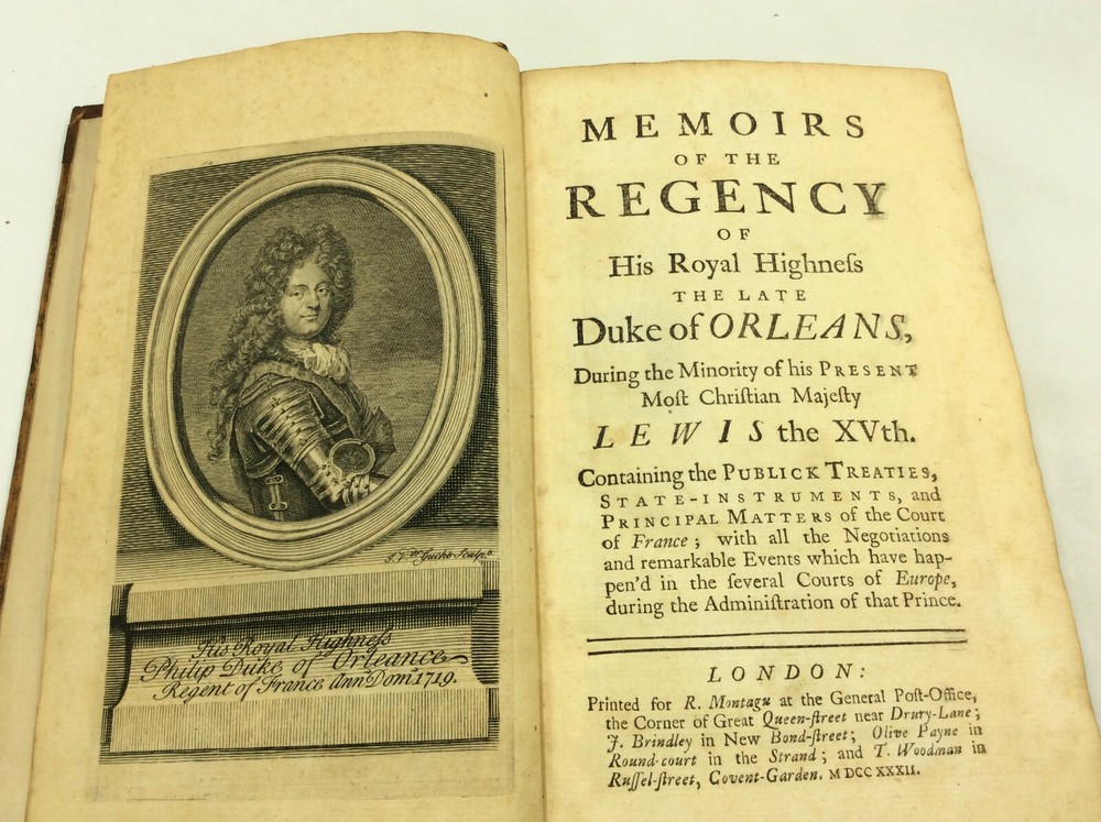 [Chevalier de Piossens] MEMOIRS OF THE REGENCY OF HIS ROYAL HIGHNESS THE LATE DUKE OF ORLEANS, during the Minority of His Present Most Christian Majesty Lewis the XVth. Containing the Publick Treaties, State-Instruments, and Principal Matters of the Court of France; with All the Negotiations and Remarkable Events Which Have Happen'd in the Several Courts of Europe, during the Administration of that Prince. London: R. Montagu; J. Brindley; Olive Payne; T. Woodman, 1732. 1st Edition. Leather. 428p. A hardcover book bound in full brown leather, likely rebound sometime in the 19th century but retaining the original spine label. Very good condition overall. The edges are scuffed, and the leather on the spine has a faintly crackly appearance. Some tanning and foxing on the endpapers and main pages, most heavily on and around the plates. Otherwise, text unmarked and binding secure. Item #177058 A scarce life of Philippe II, Duke of Orleans, who was Regent of France from 1715-1723. Issued in France in 1729; this edition was published in 1732. This copy contains the bookplate of John Sneyd (1734-1809), a British landowner and agriculturalist from Staffordshire.