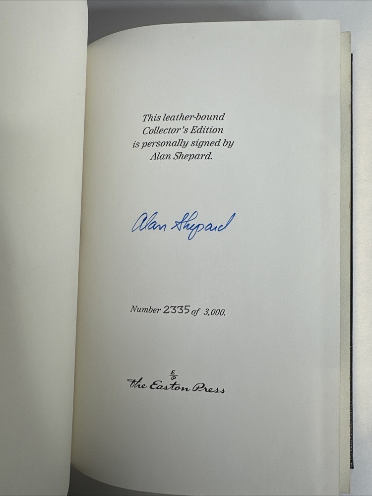 The product is a signed leather-bound edition of "Moon Shot" by Alan Shepard, published by Easton Press in 1996 as part of the Astronauts Library series. This collectible book, written in English, focuses on the topics of science and psychology. With a Certificate of Authenticity, this edition would be a valuable addition to any collector's library, particularly for those interested in space exploration and the work of Alan Shepard.