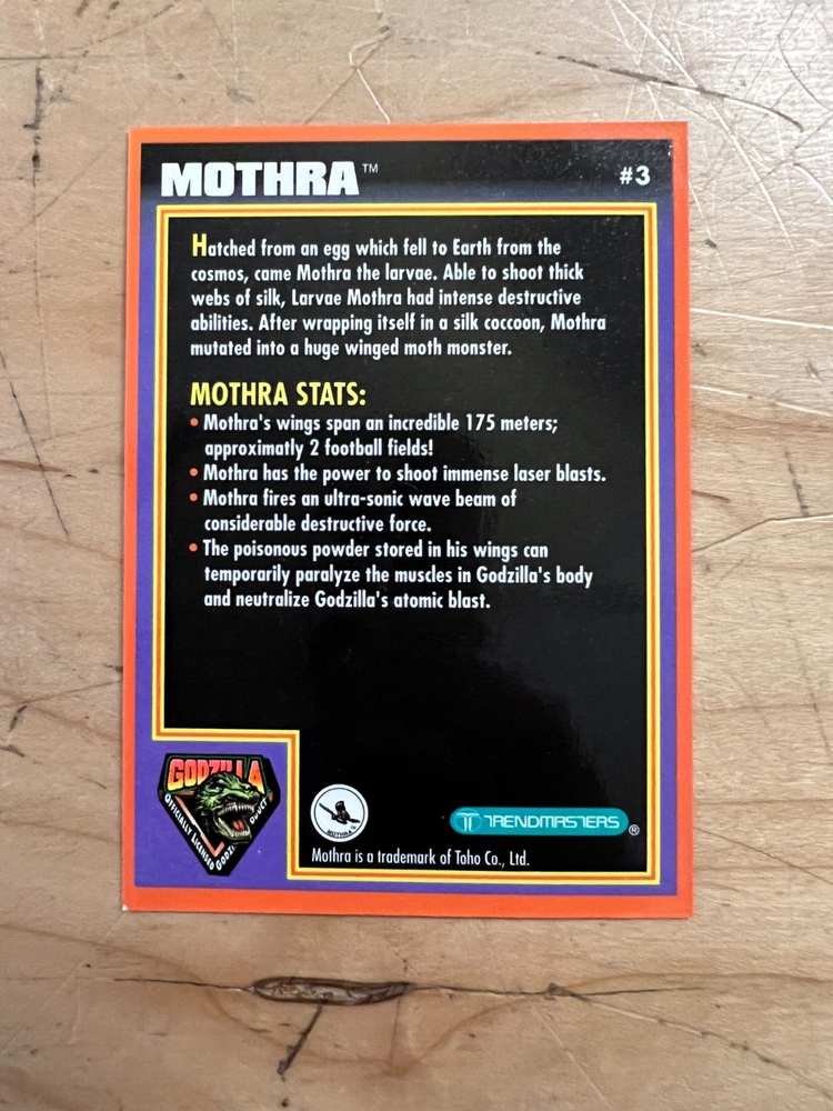 This listing is for a rare, 1994 Mothra from Godzilla King of the Monsters trading card #3 from Trendmasters. It's in really good shape. Great display piece. This is a must-have for any Godzilla fan! Buy now before it's too late and this is on it's way to someone else's home. Check the pictures for a better description. Thanks for looking at my auction, I have other items listed that may interest you. All items listed can be picked up in Chicago at my shop for free - Toy de Jour 2532 W Fullerton Chicago, IL 60647 Just notify me when you purchase something and I'll add a free shipping option for you to use when paying.