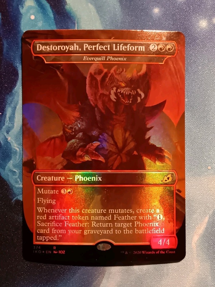 This MTG Everquill Phoenix card is a rare and highly sought-after item for collectors and players alike. It features a red-colored image of a phoenix with beautiful foil finish and belongs to the Ikoria: Lair of Behemoths - Variants set. With a cost of 2 and attack power of 4, it is a valuable addition to any Magic: The Gathering collection. This card is made of high-quality card stock material and is in excellent condition, with a card condition number of 400010 and a condition type of 4000. It is a standard-sized card with a defense/toughness of 4 and is suitable for players aged 13 and above. The card name is Everquill Phoenix and the illustrator is JOZ. It is manufactured by Wizards of the Coast and belongs to the creature card type. This card also has a card number of 374 and is in English language.