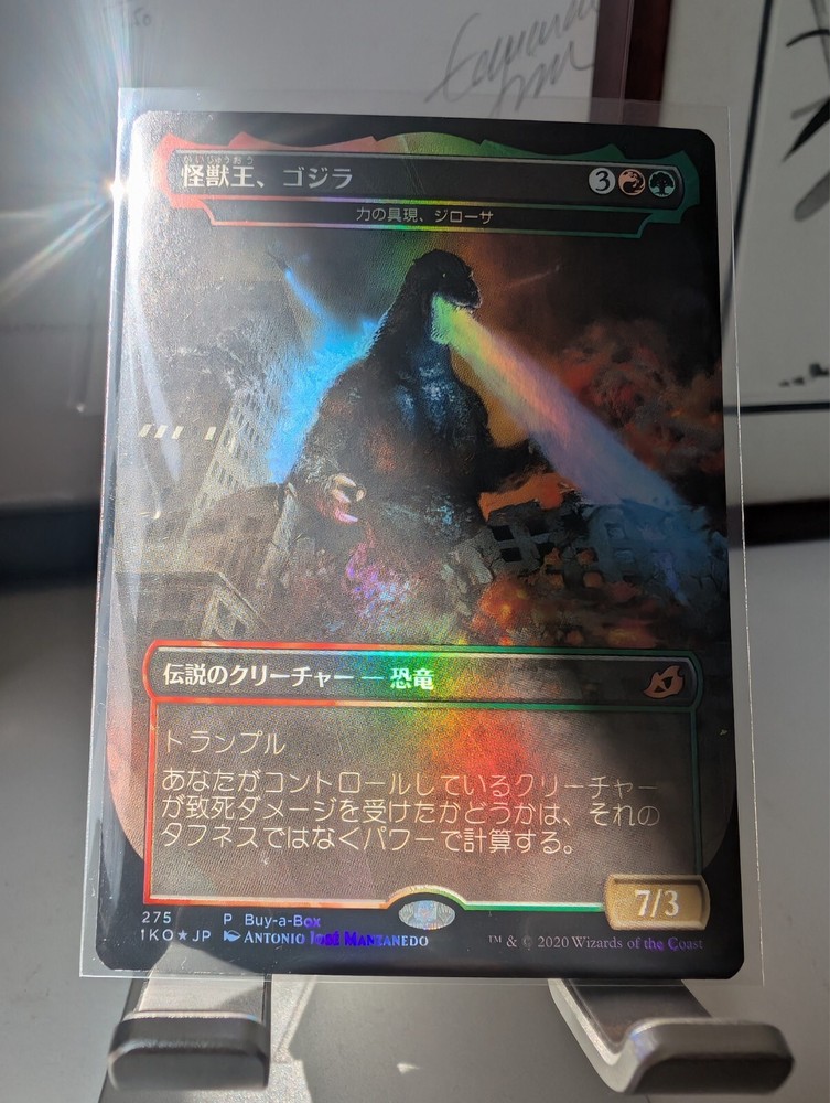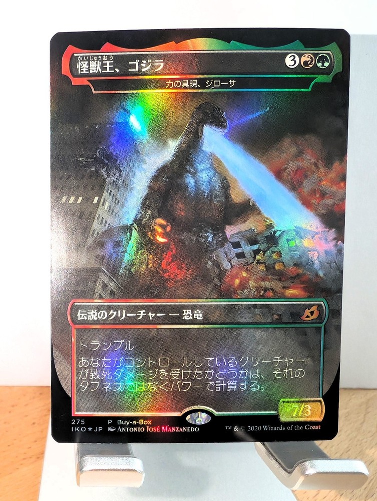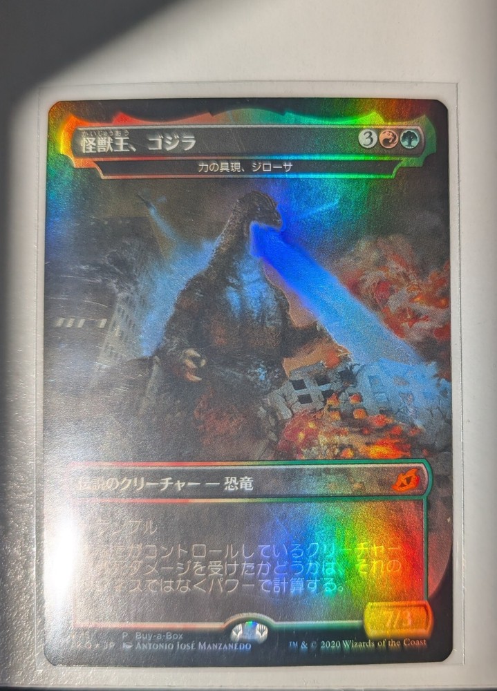 This foil Japanese promo of MTG's Godzilla, King of the Monsters is absolutely stunning—vibrant colors and crisp details make it a must-have! Zilortha’s unique trample ability and legendary Dinosaur typing add serious power to any deck. The near-mint condition ensures it’s ready to shine in battles or a collector’s display. An incredible pull for Godzilla fans and MTG players alike!