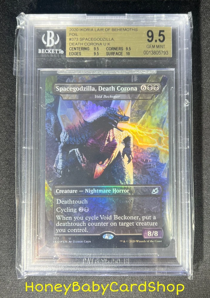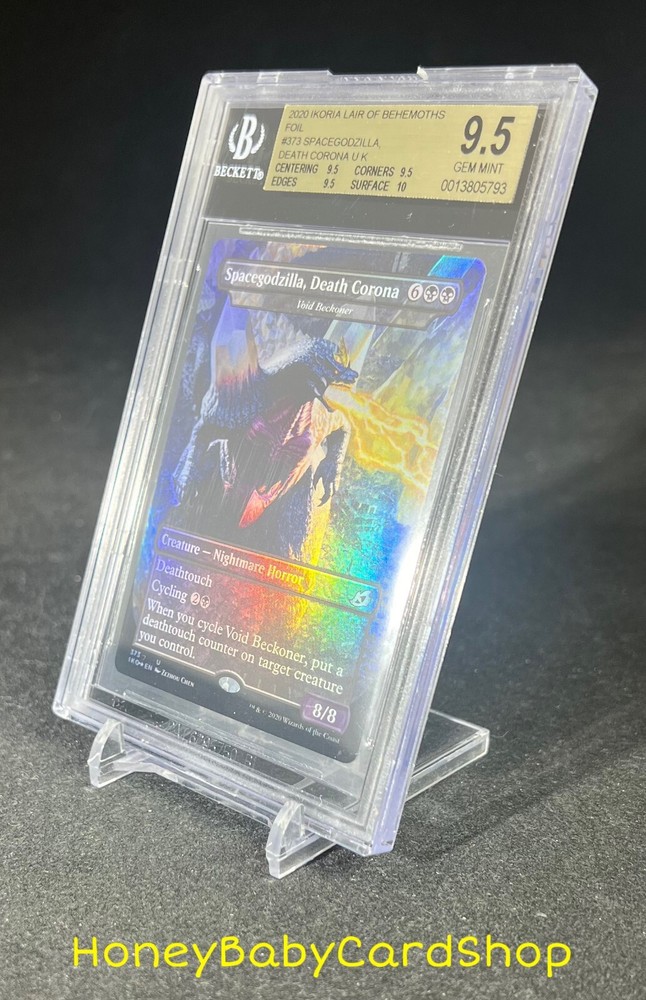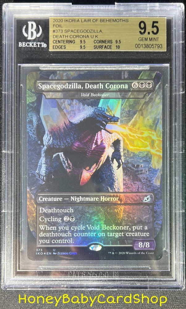 Magic The Gathering Ikoria: Lair of Behemoths 2020 -- Spacegodzilla, Death Corona Foil BGS 9.5Q+ (TRUE QUAD 9.5 x 3, SURFACE 10) -- GEM MINT English IKO Full Art Box-Topper Foil Chase Card! #HLY From Magic The Gathering - IKO Ikoria: Lair of Behemoths Booster Packs This card was traded for as a collector's item, and the condition is GEM MINT, graded by Beckett Grading Services. Be prepared with every card for your duels, whether they be on the kitchen countertop, or the finals of the Mythic Championship! We have served thousands of eBayers for various cards for the past year, and all of them have been satisfied with our service and diligence. As is our tradition at HoneyBabyCardShop, all Magic: The Gathering and Injustice Arcade purchases will come with bonus card(s). The bigger the purchase, the greater the bonus! You are getting the exact item pictured; all cards Near Mint or better, fresh from the booster pack, and have never been part of anyone's deck. We select the highest quality cards of the best condition for you collectors out there. We always ship each card in durable and sleek card sleeves. Lightning fast shipping within 24 hours of payment, free of charge, shipped USPS First Class with tracking and combined shipping available. Please look at the photos above carefully and feel free to ask any questions before you bid or purchase!