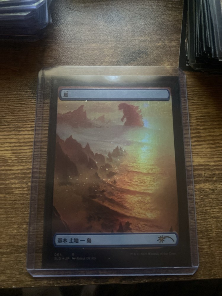 The product is a rare Magic: The Gathering card from the Secret Lair Drop set. It is a foil basic land card with the illustration of an Island by artist Jonas De Ro. This specific card is number 064 in the set and features a Godzilla foil treatment. The card has been graded by PSA as an 8, indicating its condition. It is a collectible card game item suitable for enthusiasts and collectors of Magic: The Gathering cards.