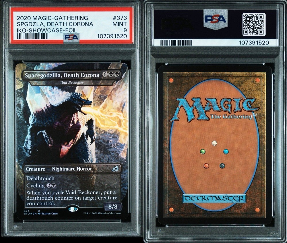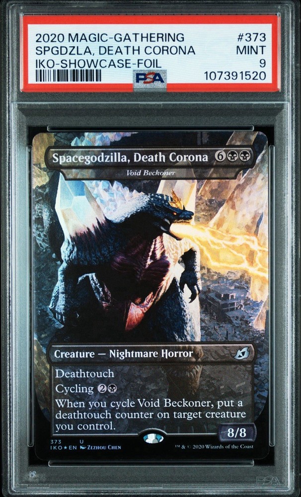 The product is a PSA 9 graded MTG Space Godzilla, Death Corona Showcase FOIL card from the set Ikoria: Lair of Behemoths. This black Creature card, named Void Beckoner, illustrated by Zezhou Chen, is a rarity in the game Magic: The Gathering. It features the Showcase design and is in English language, manufactured by Wizards of the Coast in the United States. The card is part of the standard size and made of card stock, suitable for players aged 13 and above.