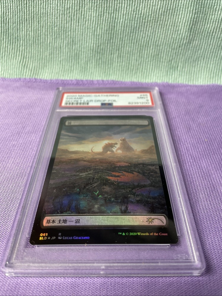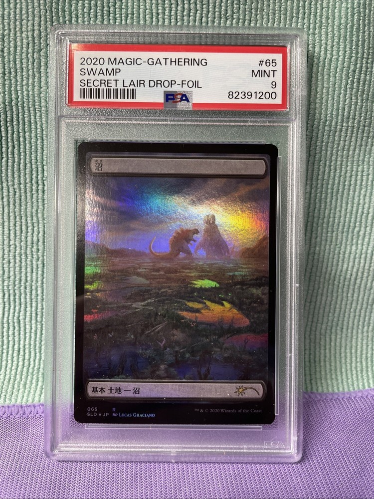 The product is a rare foil Swamp card from the Magic: The Gathering Secret Lair Drop set, featuring artwork by Lucas Graciano. This basic land card has a unique Godzilla theme and is numbered 065 in the set. The card has a PSA 9 Mint grade, making it highly sought after by collectors. Perfect for fans of Magic: The Gathering looking to add a special and limited edition card to their collection.
