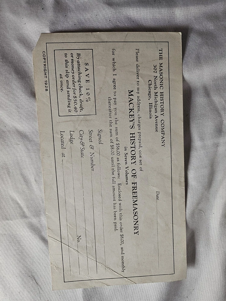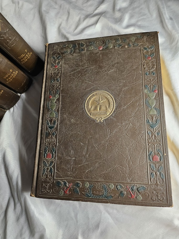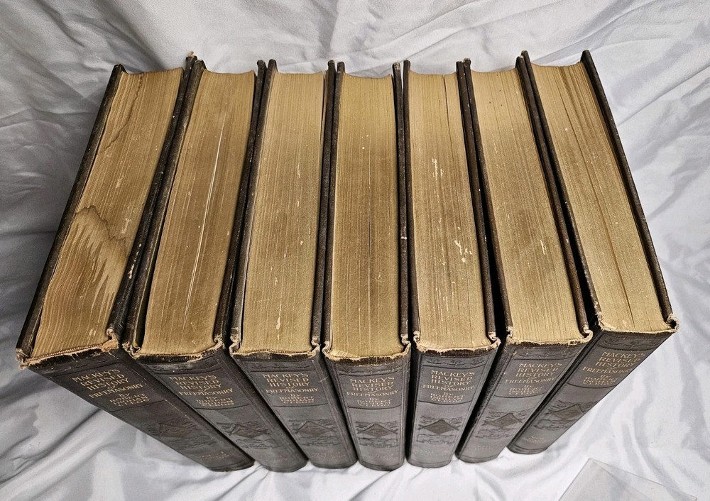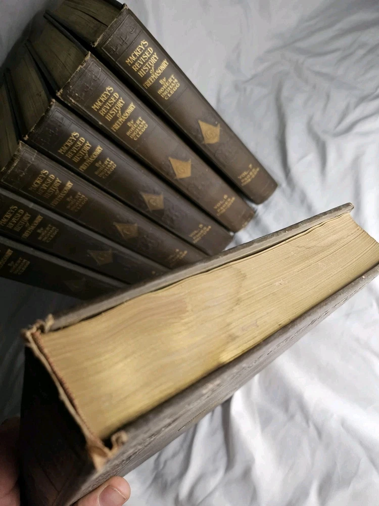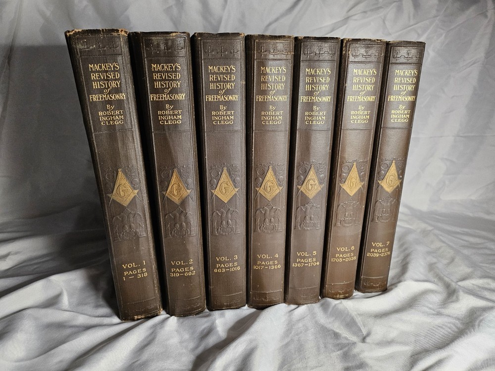 This set of seven volumes of "Mackey's History of Freemasonry" edited by Robert Ingham Clett is a valuable collection for anyone interested in the history and spirituality of Freemasonry. The books were printed in 1921 by The Masonic history company and are bound in leather with illustrated covers. Very good condition other than a small out of what looks like water damage to volume 1 (see photos) The set includes encyclopedias and histories of Freemasonry, with topics ranging from the history of the organization to its spiritual teachings. The books are in their original form and are not personalized or signed. This set is a great addition to any collection of religious and spiritual literature.