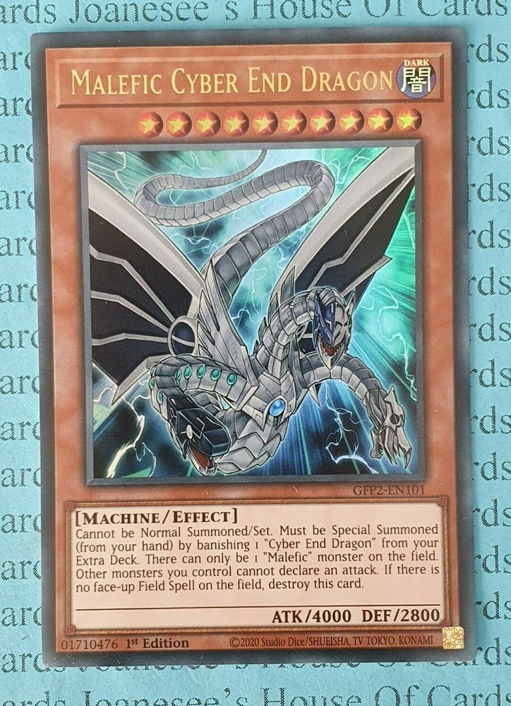 This is an Ultra Rare Holo Dark Machine Malefic Cyber End Dragon 10 Stars ATK/4000 DEF/2800 Card text: Cannot be Normal Summoned/Set. Must be Special Summoned (from your hand) by banishing 1 "Cyber End Dragon" from your Extra Deck. There can only be 1 "Malefic" monster on the field. Other monsters you control cannot declare an attack. If there is no face-up Field Spell on the field, destroy this card. GFP2-EN101 1st Edition English Mint/NMint Condition Totally Original Konami (or your money back!) I will deliver in safe packaging to keep it in perfect condition. Ideal for players and collectors alike. Check out my other items! I will combine postage costs for multiple purchases. Sign up for my email newsletters by adding my eBay Shop to your favourites