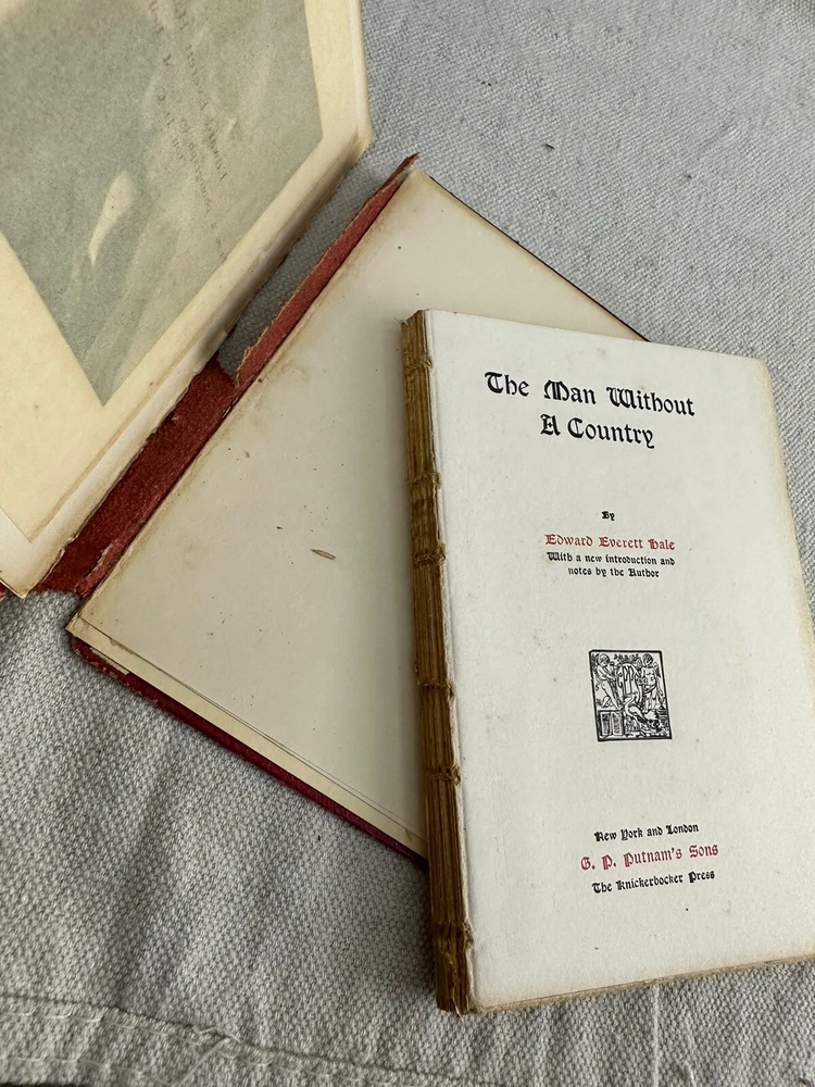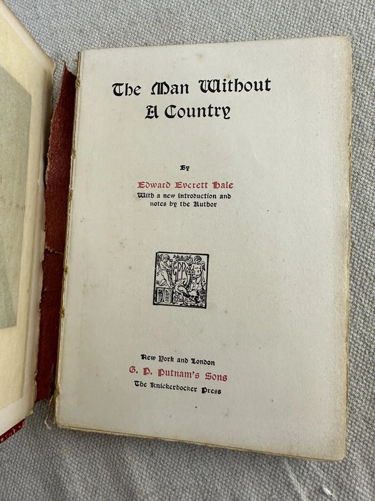 The book has become separated from the covers. This antique book from 1904, titled "Man Without a Country" by Edward Everett Hale, is a beautifully crafted piece of history. Published by Knickerbocker Press. The book is written in English and covers a fascinating topic in historical biography and autobiography. It was published by G.P. Putnam's Sons in 1904, making it a true collector's item. This book will make a great addition to any collection of antiquarian and collectible books.