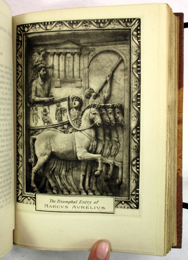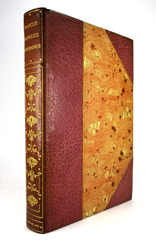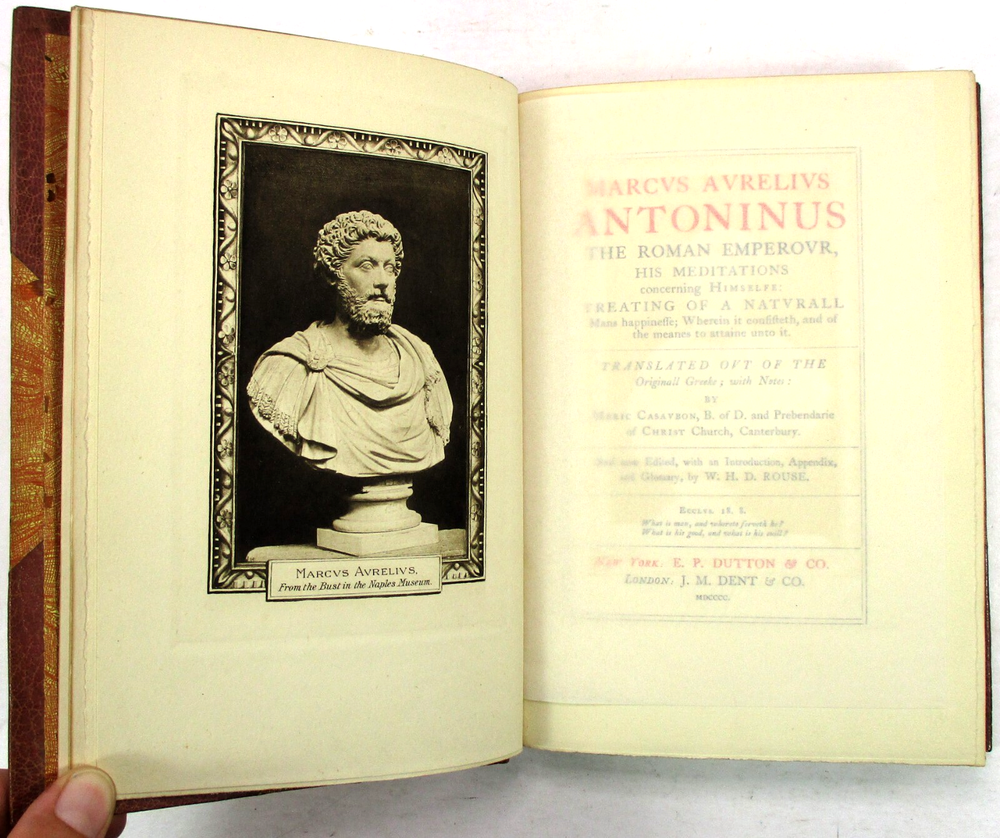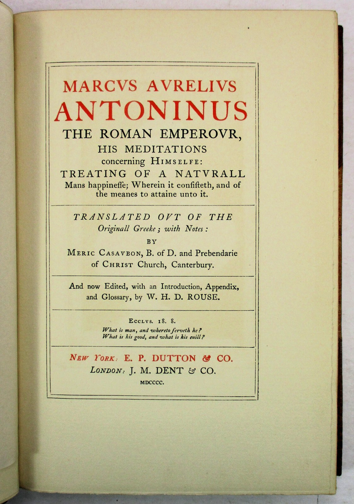 Very Good+ condition quarter-bound leather hardcover copy of Marcus Aurelius Antoninus, The Roman Emperor, His Meditations, translated into English by Meric Casavbon, edited and appended by W. H. D. Rouse. P ublished 1900 by E. P. Dutton & Co., NY. Quarter-bound in dusty mauve leather and textured cloth, with gold foil lettering and decoration to spine, gilt head of textblock, and illustrated in black and white. Binding is sound and pages are unmarked. Boards are clean and square with minor sunning to spine and very minor shelf wear. Please see photos for condition detail. L-411