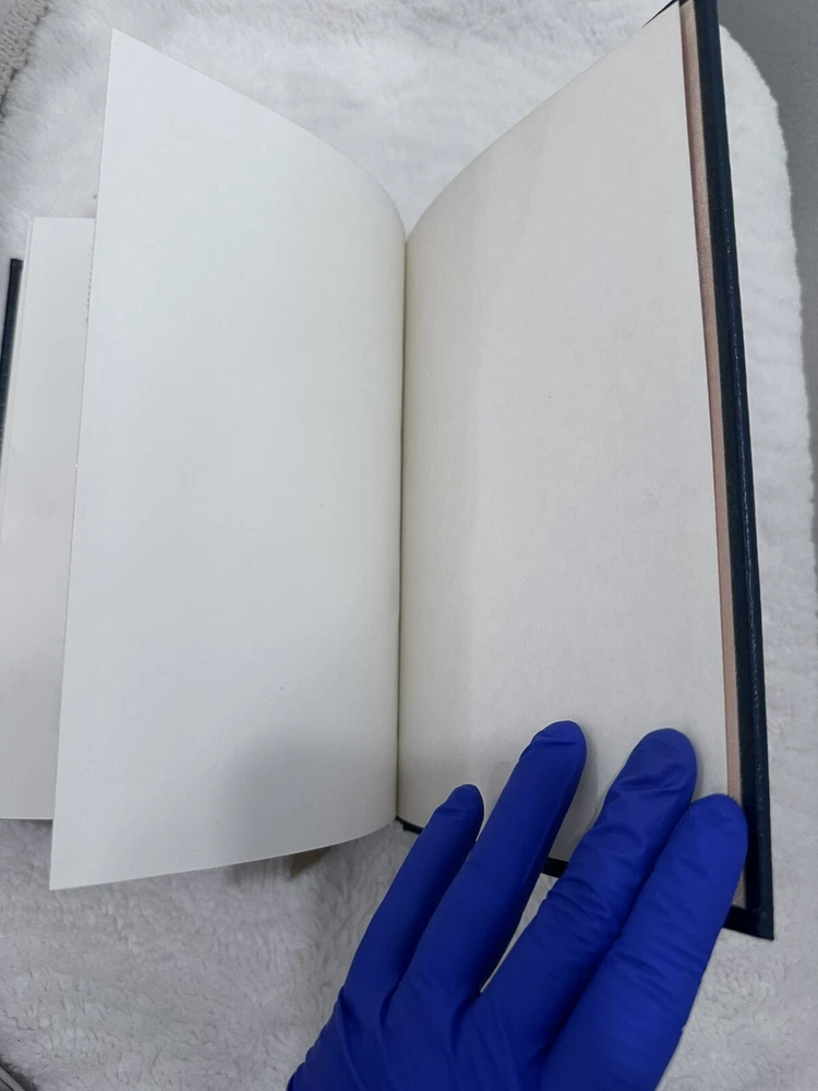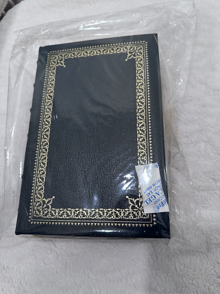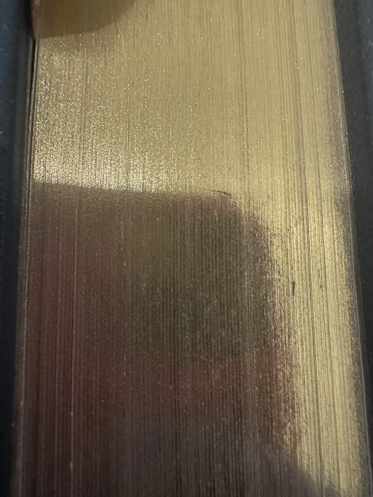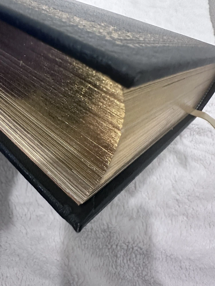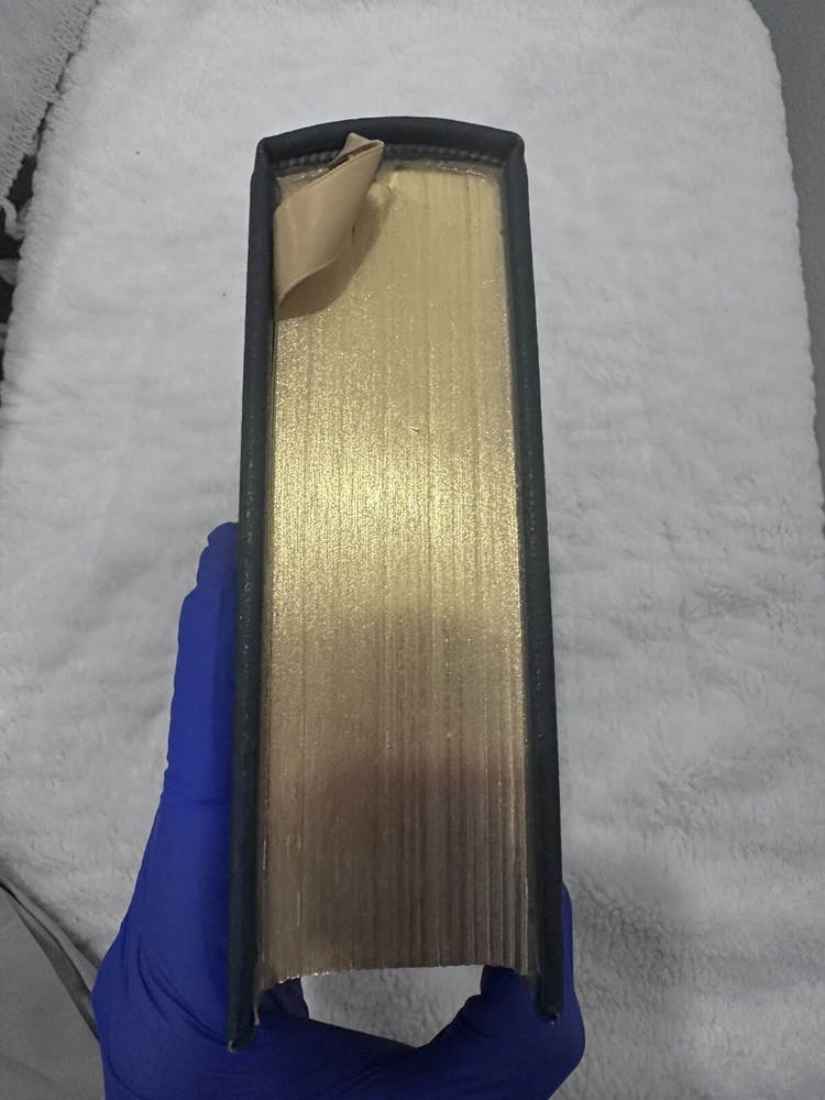 This book had been stored in a plastic wrapper with one of those moister packs. I’ve switched out the original moister pack with a new one and replaced the plastic protector. The book appears to have been never read. A few minor imperfections on the gold pages when the book is closed, see photos. There is some discoloration on that pink inside sleeve cover thing. The discoloration looks to be due to age see photos.