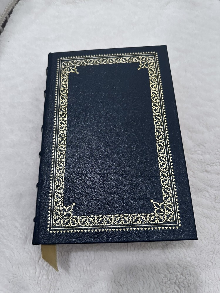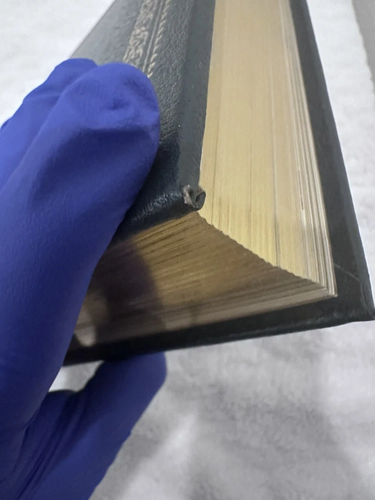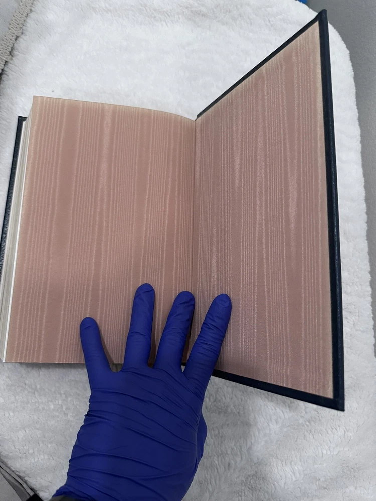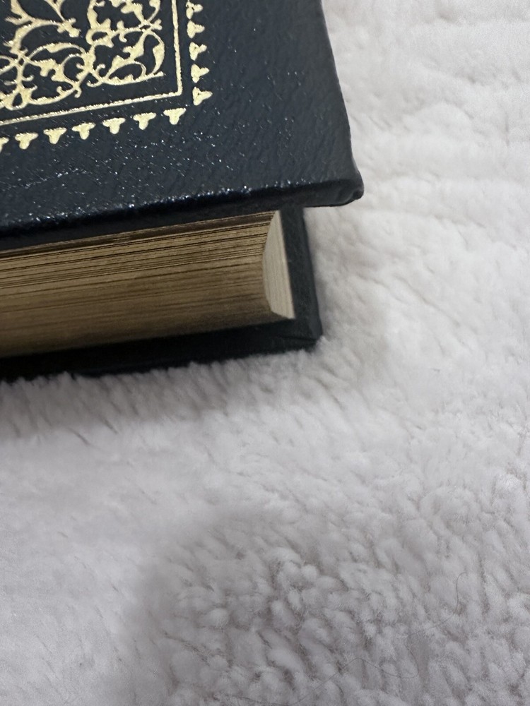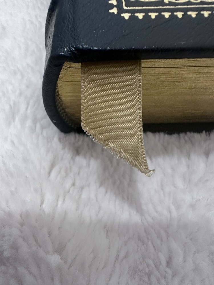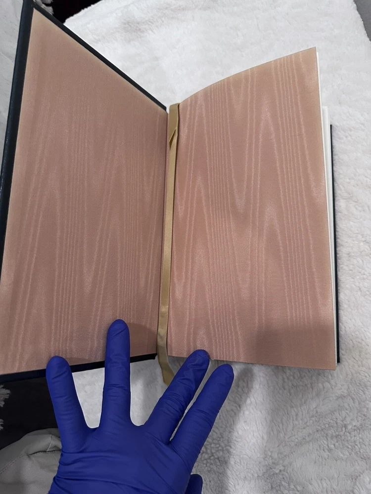 This book had been stored in a plastic wrapper with one of those moister packs. I’ve switched out the original moister pack with a new one and replaced the plastic protector. The book appears to have been never read. A few minor imperfections on the gold pages when the book is closed, see photos. There is some discoloration on that pink inside sleeve cover thing. The discoloration looks to be due to age see photos.