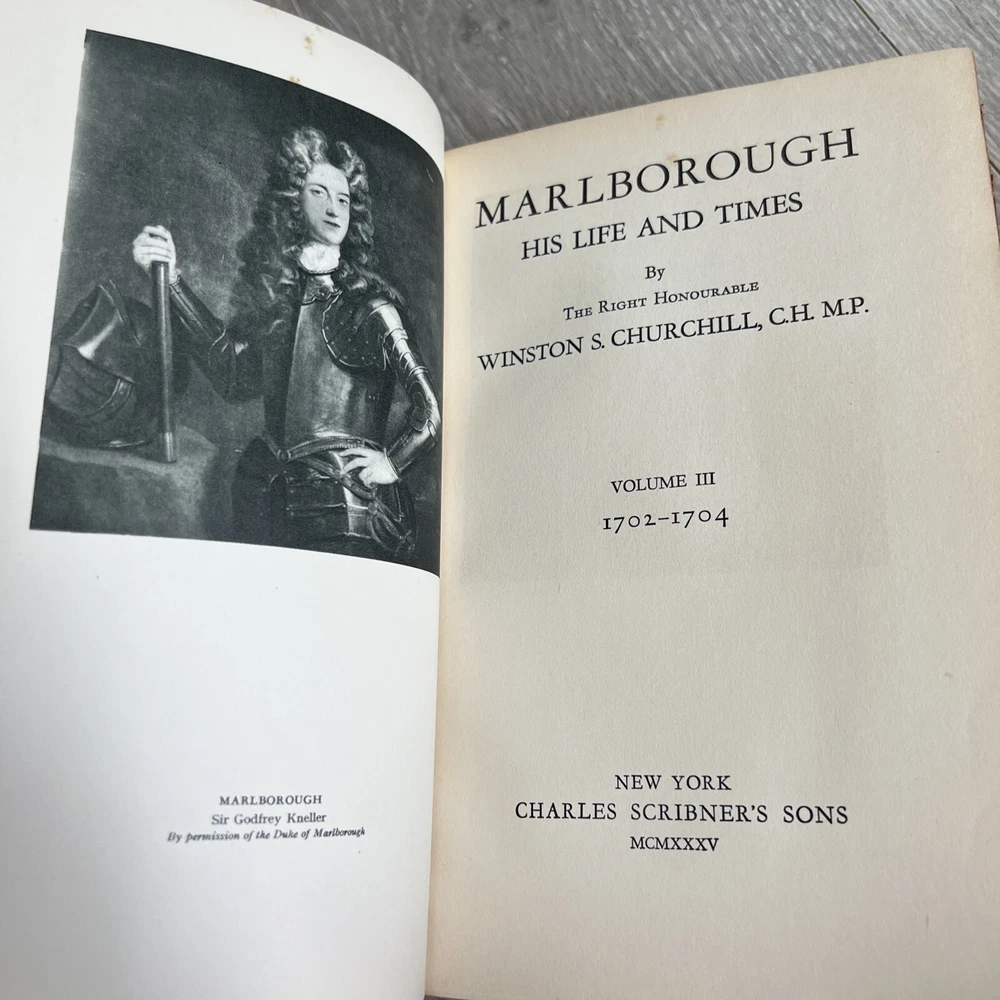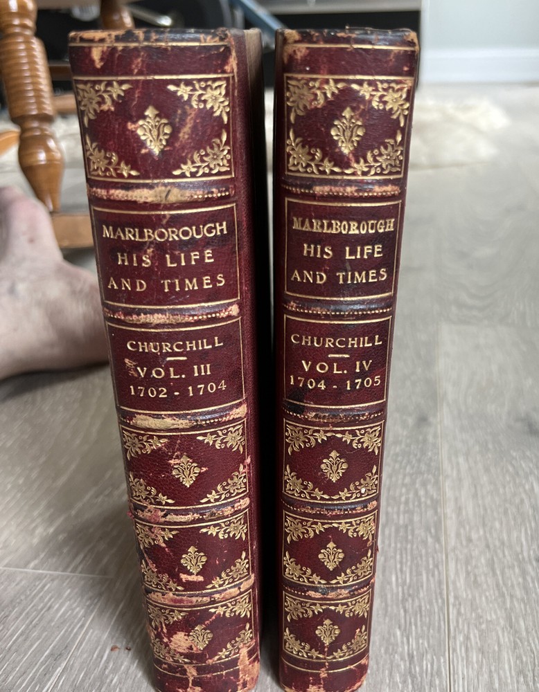 Marlborough His Life and Times Churchill 1st American "A" Printing Vol III & IV Very Rare Set of 2 finely bound First U.S. Printing Volumes from Marlborough His Life and Times. * Volumes III and IV from a set of four volumes. * First American edition, "A" first printing * Winston Churchill (English). * New York: Charles Scribner's Sons, 1935 * Illustrated foldout plates. * Bound by Asprey in half red morocco, ribbed gilt decorated spines, deckle long text block edge, marbled pastedowns and endpapers. Acid spots throughout both volumes. Wear around the edges consistent with age and use. Please see all photos for details.