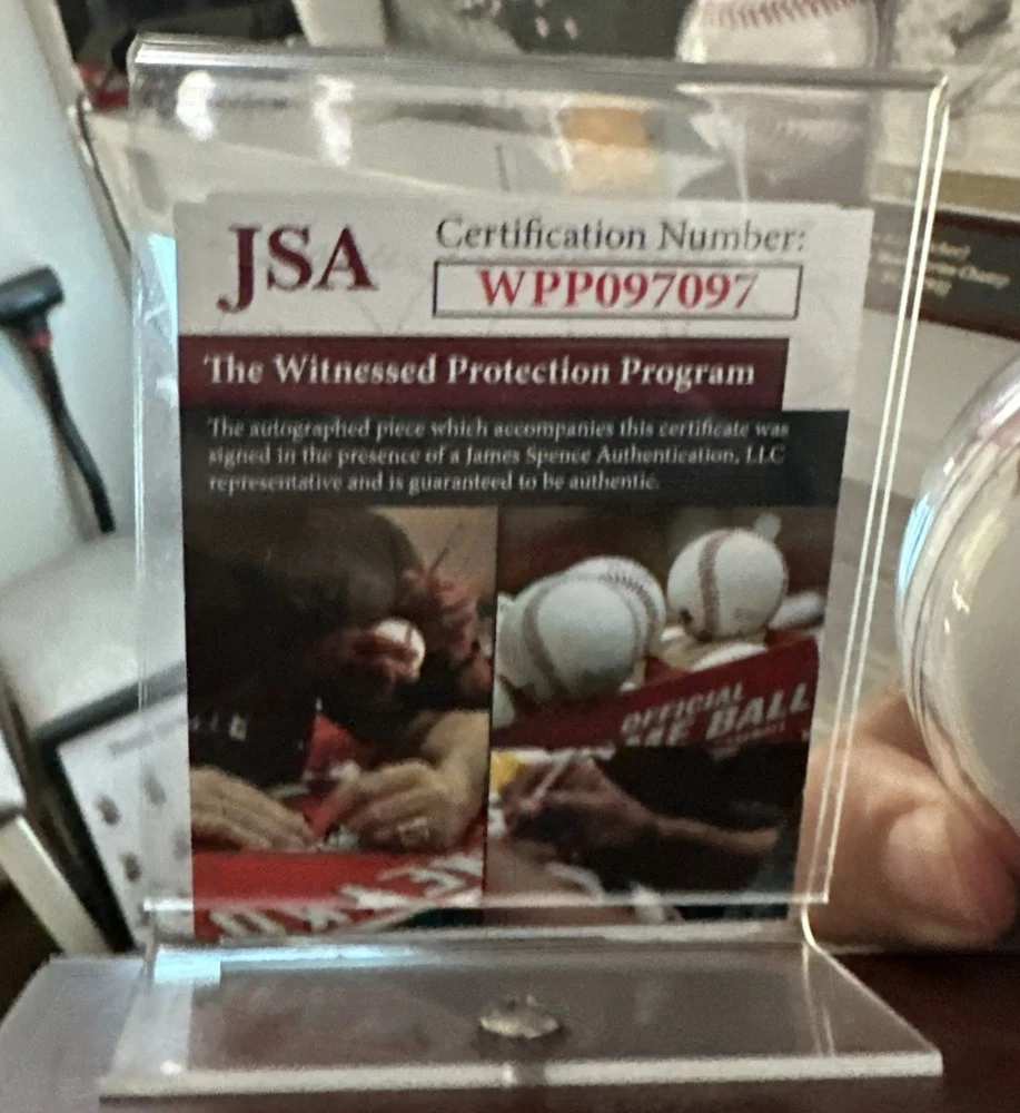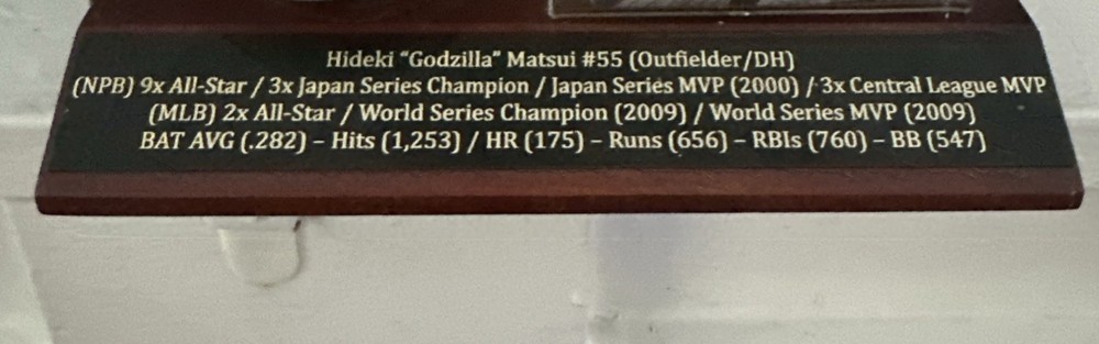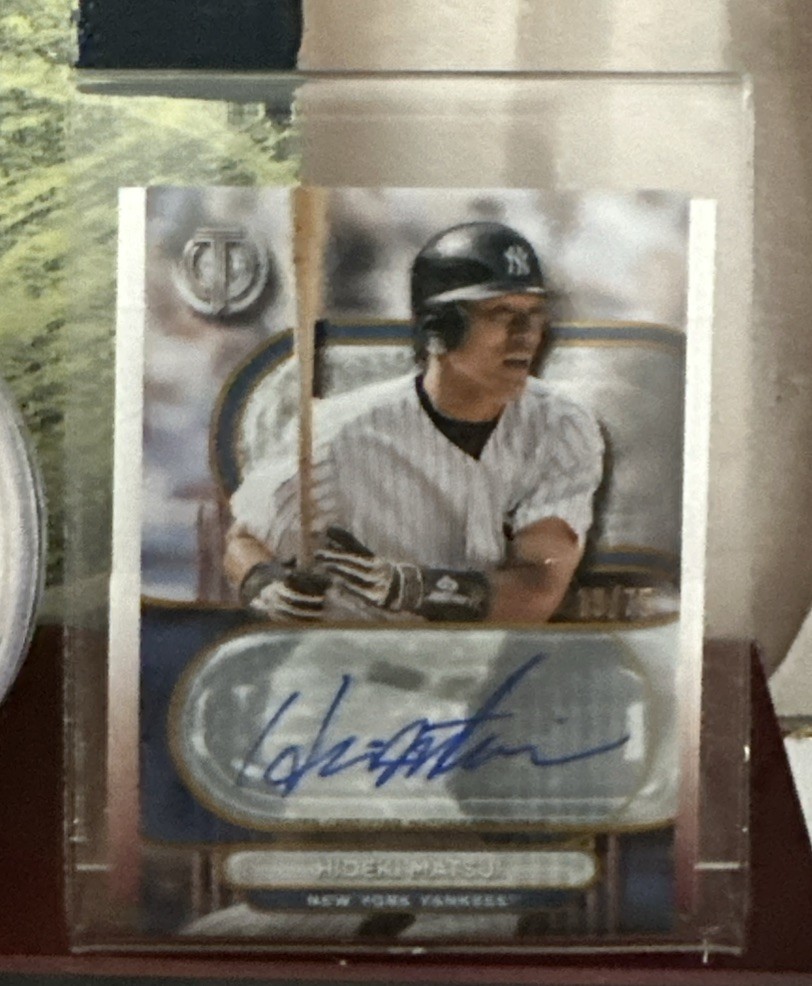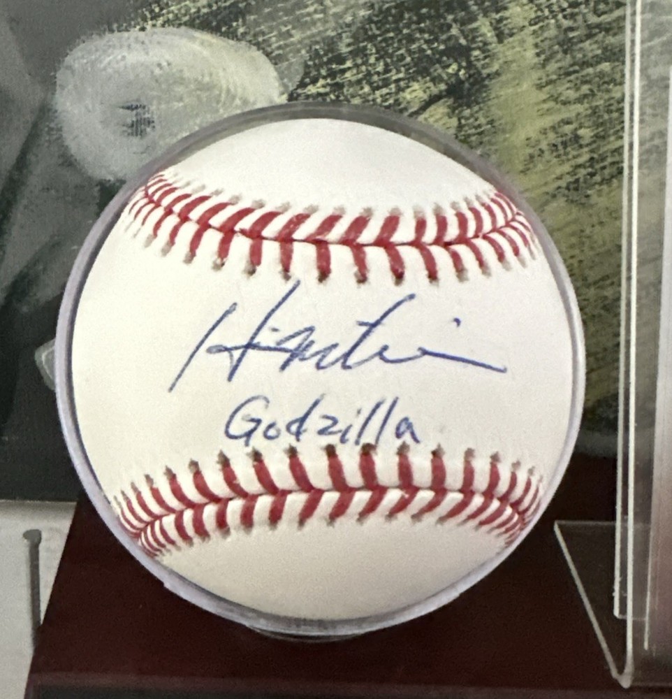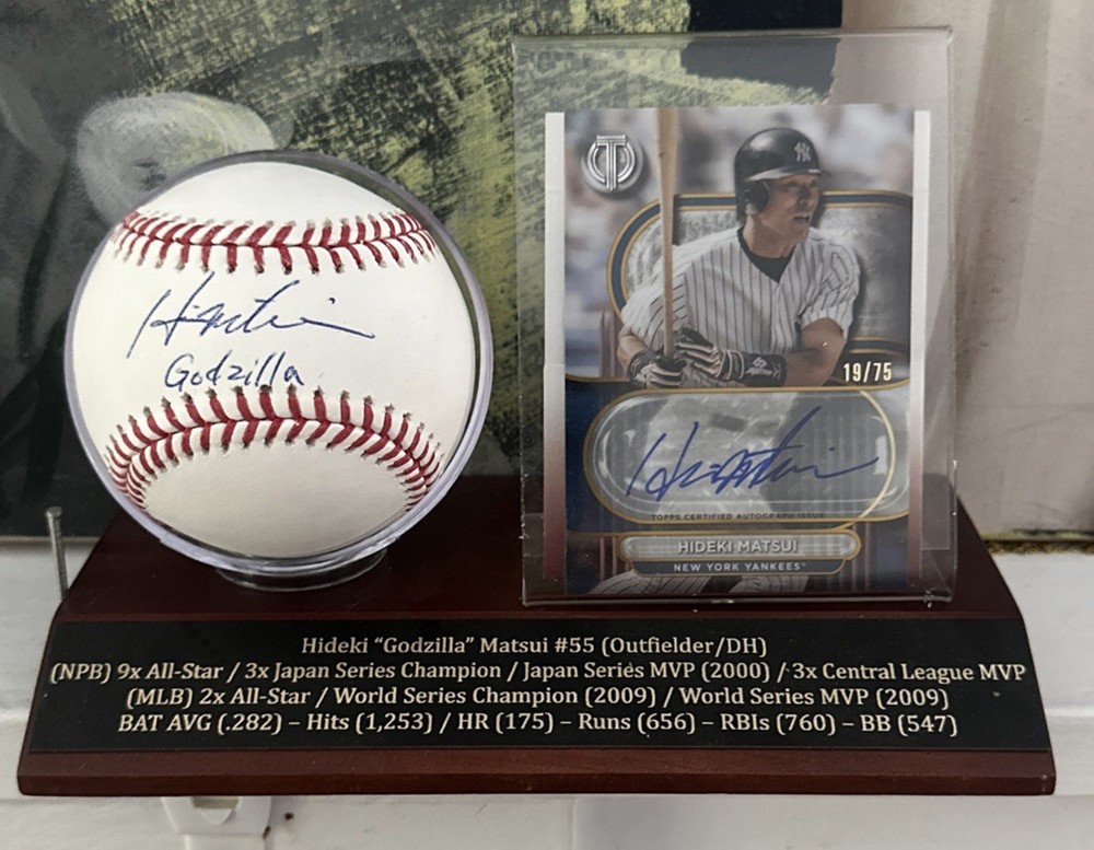 Matsui Signed Yankees Godzilla MLB Ball JSA COA & 2024 Topps Auto Card w/ Case Category Sports Mem, Cards & Fan Shop > Autographs-Original > Baseball-MLB > Balls Condition Used (Excellent condition, like new, displayed in case) Item Specifics • Sport: Baseball-MLB • Player: Hideki Matsui • Team: New York Yankees • Autograph Authentication: JSA (James Spence Authentication) • Original/Reprint: Original • Product: Baseball, Autographed Card, Display Case • Signed: Yes Description Up for auction is an exceptional Hideki Matsui autographed Official Major League (OML) baseball, signed by the New York Yankees legend and inscribed with “Godzilla”, his iconic nickname. This baseball comes with a JSA Certificate of Authenticity (COA), ensuring the signature’s legitimacy, making it a prized piece for Yankees fans and collectors. This listing also includes: • A 2024 Topps Tribute Hideki Matsui Autographed Gold Card (#19/75), a rare and highly sought-after card, numbered to only 75 copies. The card is signed in bold ink and in pristine condition. • A premium ball and card display case, UV-protected to preserve both autographs. The case is acrylic with a red wood base, in excellent condition, perfect for showcasing this set. Item Details: • Baseball: Official Major League Baseball (Rawlings), signed by Hideki Matsui with “Godzilla” inscription on the sweet spot in blue ink. • Authentication: Baseball comes with a JSA COA • Card: 2024 Topps Tribute Hideki Matsui Autographed Gold Parallel, serial numbered #19/75, signed in black ink. Card is in mint/near-mint condition, stored in a protective sleeve. • Display Case: High-quality acrylic case designed to hold both the baseball and card, free of scratches or damage. Condition: The baseball, card, and display case are in excellent condition, carefully stored and displayed. The signatures are bold and unfaded, with no smudging. The baseball shows minimal toning, typical for its age, and the card is pristine. The display case is clean and undamaged. See photos for details. Authenticity: The baseball is authenticated by JSA, with a matching COA included. The 2024 Topps Tribute card is guaranteed authentic as issued by Topps, a trusted manufacturer. Why Buy? This is a rare opportunity to own a piece of Yankees history from World Series MVP Hideki Matsui. The combination of a JSA-authenticated signed “Godzilla” baseball, a limited-edition 2024 Topps Tribute autographed card (#19/75), and a premium display case makes this set a standout for any MLB or Yankees collection. Perfect for display in your home or office! Shipping & Handling • Shipped securely via USPS with tracking and insurance. • Packaged in a padded box with bubble wrap to protect the display case and items. • Shipping to the U.S. only: $10.00 • International shipping via eBay Shipping International • Combined shipping available—contact me before bidding. Payment • Accepted via eBay Managed Payments (PayPal, credit cards, etc.). • Payment due within 3 days. Returns • No returns accepted unless the item is not as described. Buyer pays return shipping. • Please review photos and description carefully • Buy It Now: $225.00 Seller Notes • 100% positive feedback seller—bid with confidence! • Message me with questions or for additional photos. • Check out my other MLB memorabilia listings for more collectibles! Tags #HidekiMatsui #Yankees #Godzilla #SignedBaseball #AutographedCard #ToppsTribute #MLBCollectibles #SportsMemorabilia #JSA