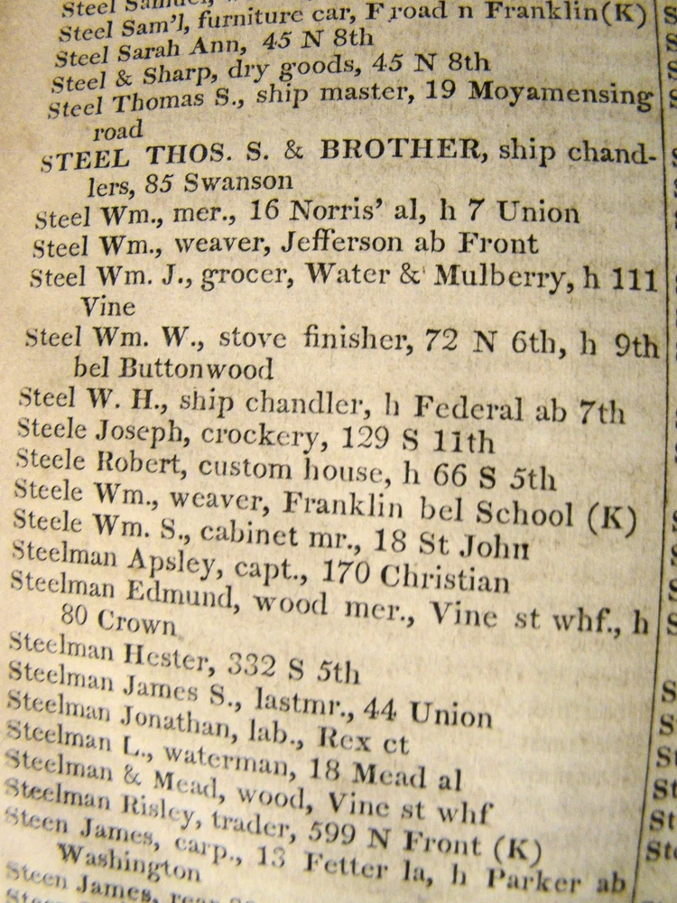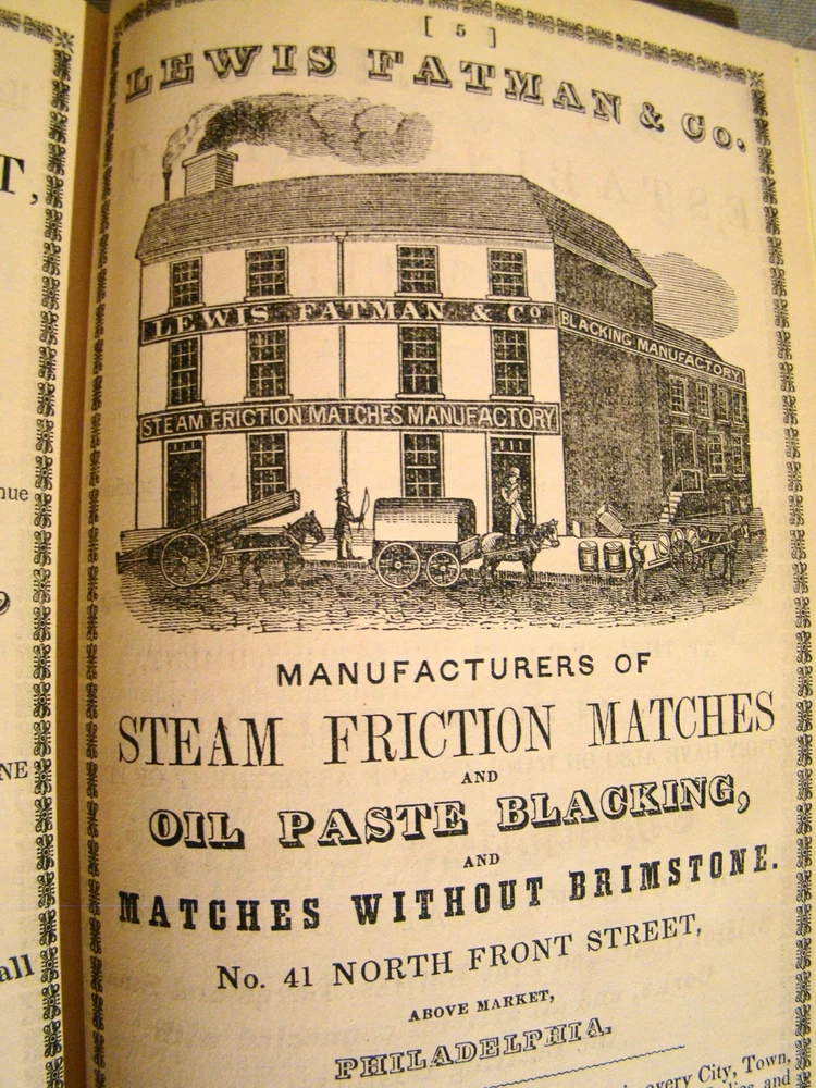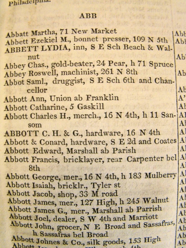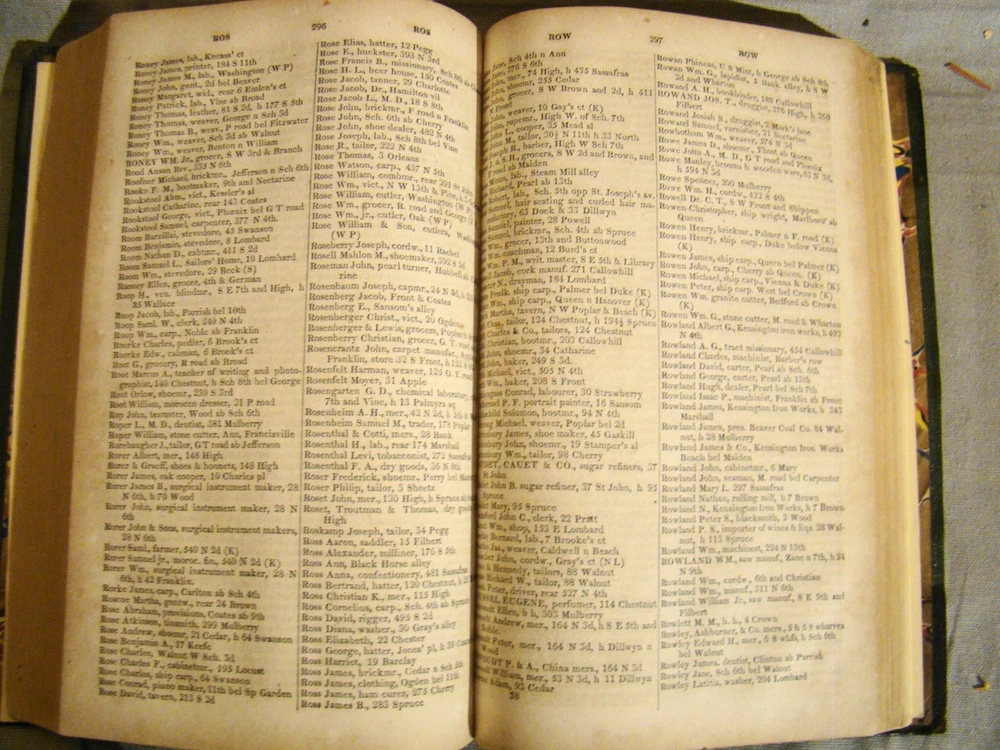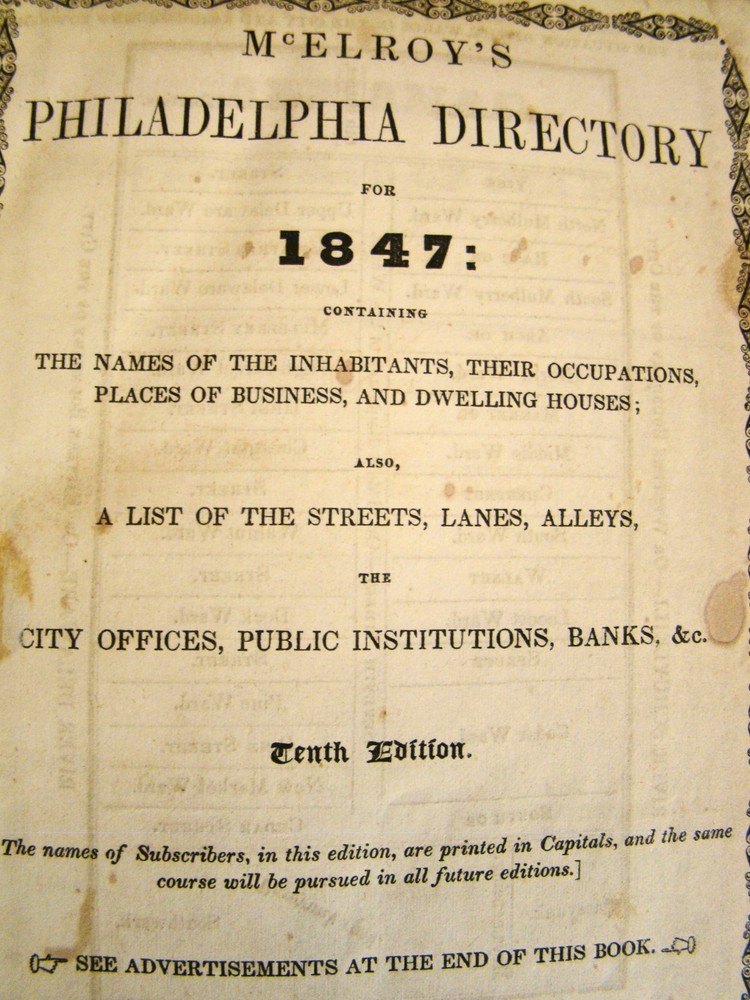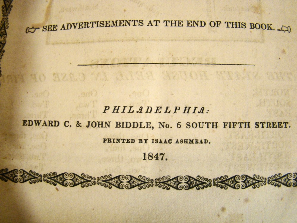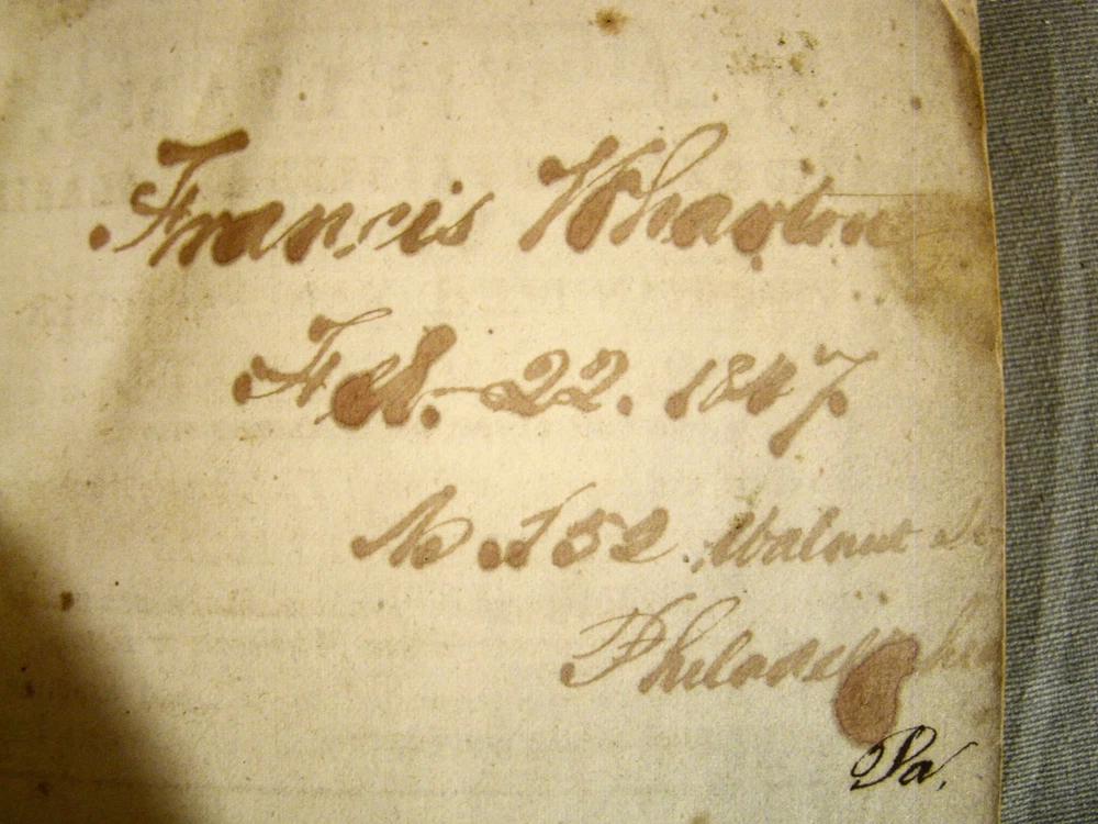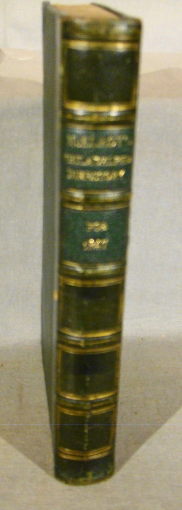 McElroy's Philadelphia Directory for 1847: Containing the Names of the the Inhabitants, their Occupations, Places of Business and Dwelling Houses; Also, A List of the Streets, Lanes, Alleys, the City Offices, Public Institutions, Banks, &c. McElroy, A. Philadelphia: Edward C. & John Biddle, 1846. Tenth edition, 8vo (8 ½” x 5 ½”), pp. (4), (1), 2-428, 18 adv on color stock with some wood engravings of Philadelphia businesses. Contemporary half green calf & green cloth, back in six gilt paneled compartments, green morocco gilt lettering pieces in the second & third, five raised bands, gilt filleted sides & corners. Very good+ clean copy with minor wear to the calf, sheets with natural age toning, clean, complete. Provenance: Signed “Francis Wharton/ Feb 22, 1847/ No. 252 Walnut St./ Philadelphia/ Pa.” on front free endpaper. WHARTON, FRANCIS (1820-1889), American legal writer and educationalist, was born in Philadelphia, Pennsylvania, on the 7th of March 1820. He graduated at Yale in 1839, was admitted to the bar in 1843, became prominent in Pennsylvania politics as a Democrat, and in Philadelphia edited the North Ameri-can and United States Gazette. (Encyclopedia Britan-nica, 1911, vol 28. H7797