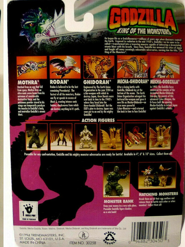 You are buying a brand new, factory sealed Trendmasters Mecha-Godzilla King of the Monsters Wind-up Walker toy . Mecha Godzilla's mouth, arms and legs move as he walks! Includes a collectible trading card as a Bonus. This Mecha-Godzilla is approximately 5" tall and was manufactured in 1994. This item is factory sealed, never been displayed and will be pulled from a factory case. "In 1992, the Godzilla Force recovered the remains of the decimated Mecha-Ghidorah. Learning the secrets of this advanced Cyber-weapon, the G-Force built the amazing Mecha-Godzilla to defend Japan against Godzilla's attacks." This item is factory sealed, never been displayed and will be pulled from a factory case. mwoffbackwallblueshlvs1 PAYMENT & SHIPPING TERMS Payment is expected 1-3 days after the close of the transaction. We may elect to cancel the transaction and re-list this item if payment is not made within that time frame US BUYERS pay $12.99 for insured shipping within the 48 states. California residents please add sales tax. International shipping for this item is higher than shipping within the US. International buyers please make sure to inquire about shipping options to your address before making your purchase. INTERNATIONAL BUYERS . Shipping to international addresses costs more than shipping within the US. Please make sure to inquire about shipping costs before you make any purchase. We use insured priority airmail as our default shipping method. Customs duties and fees may or may not apply to imports to your country and may add an additional cost to the buyer for this item. These costs, if any, are the responsibility of the buyer. Please check with your individual country for any customs or duties. PAYMENT OPTIONS & TERMS: We accept PAYPAL. Please check our other items at our Ebay Store at: American Icons Collectibles We have many great items at our eBay store and we have hidden some real bargains for your viewing and shopping enjoyment. You can buy this item or many other great items now from our eBay store at: American Icons Collectibles Check out our other eBay auctions! Add Me to Your Favorite Sellers American Icons Collectibles selling Collectibles Since 1989 OUR BUSINESS HOURS ARE M-F 11-7 PST Closed Weekends & Holidays Search For Items At American Icons Collectibles Search titles and descriptions