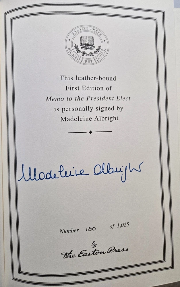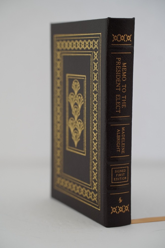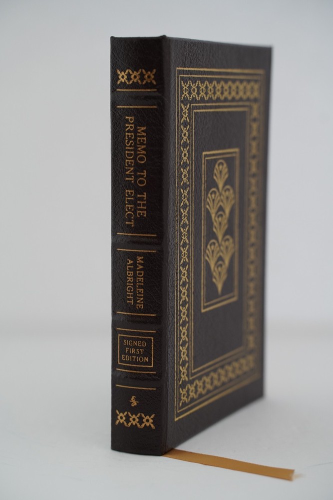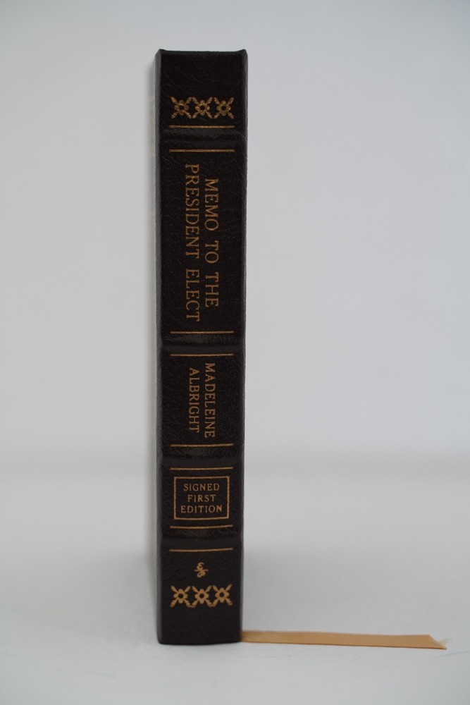 Memo to the President SIGNED Madeline Albright Easton Press FIRST EDITION Book features: Easton Press Full Genuine Leather Hubbed Spine Accented With 22 kt. Real Gold Satin Ribbon Page Marker Distinctive Cover Design Gilded Page Edges to Protect Against Humidity High-Quality Acid - Free paper Smyth-Sewn Pages Silk-Moire End eaves Make sure to see my other auctions as I have dozens of Easton Press signed First editions!