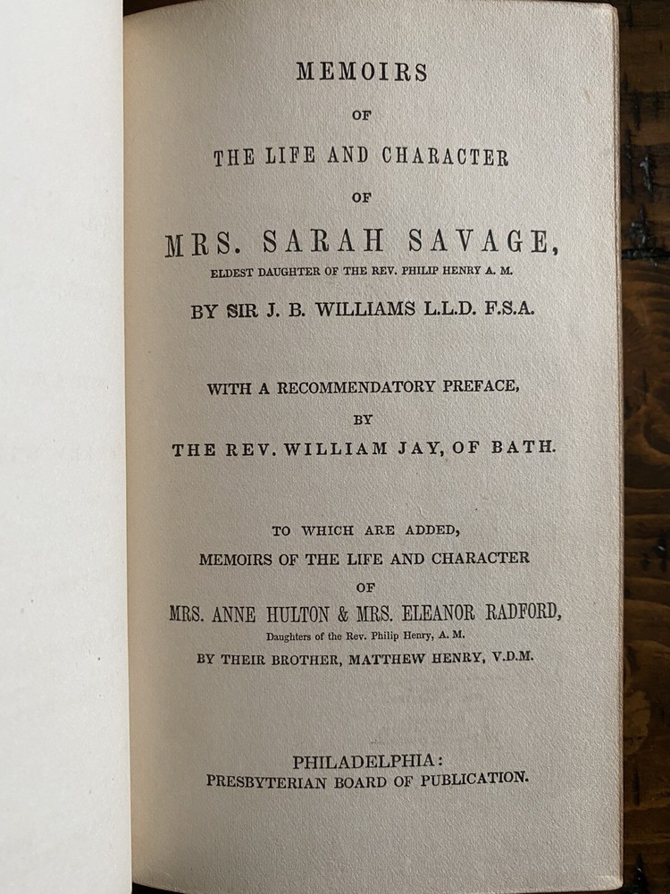 Memoirs of the Life and Character of Mrs. Sarah Savage Edited by Sir J. B. Williams with Memoirs of the Life and Character of Mrs. Anne Hulton and Mrs. Eleanor Radford Philadelphia: Presbyterian Board of Publication (1818?) Full leather binding with gilt tooling and page edges 360 pages - 6 1/4 inches x 4 inches Mild rubbing/wear to boards and spine; contents clean; binding solid Thank you for looking!