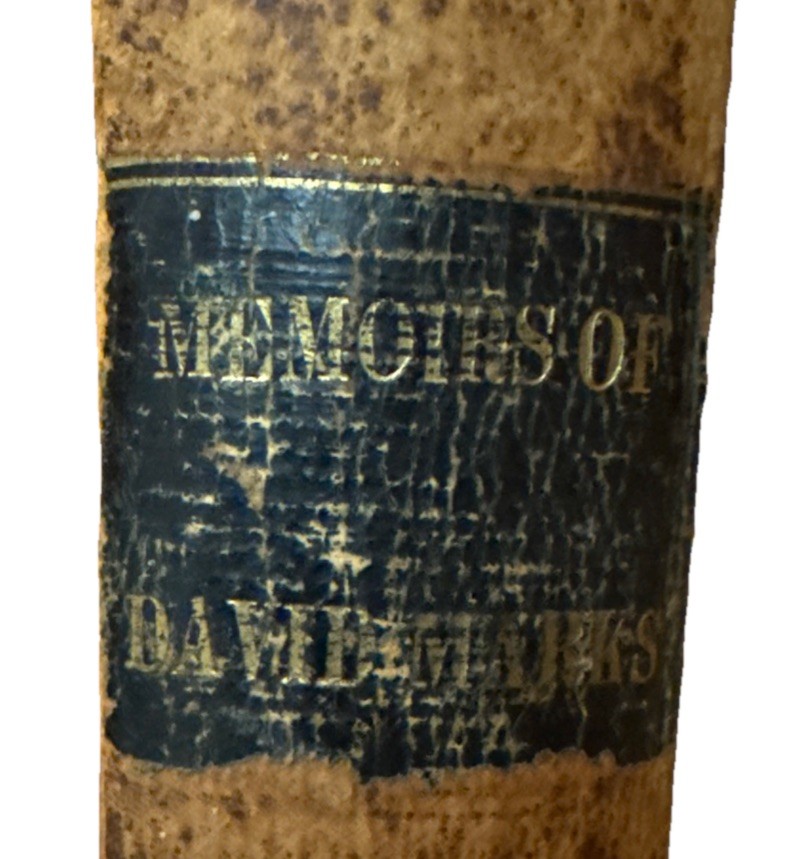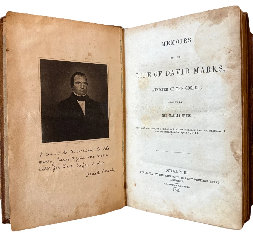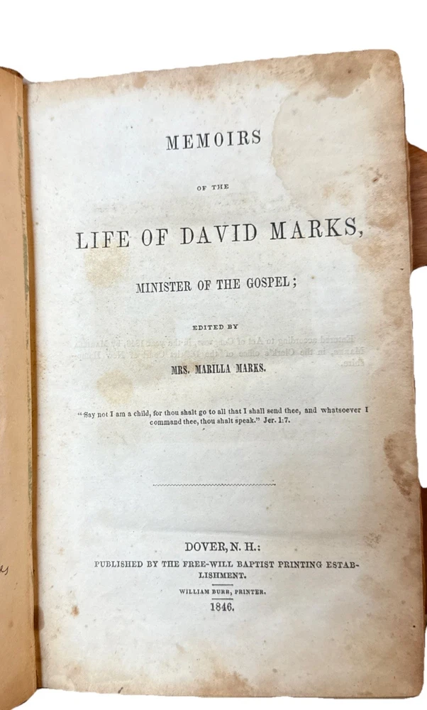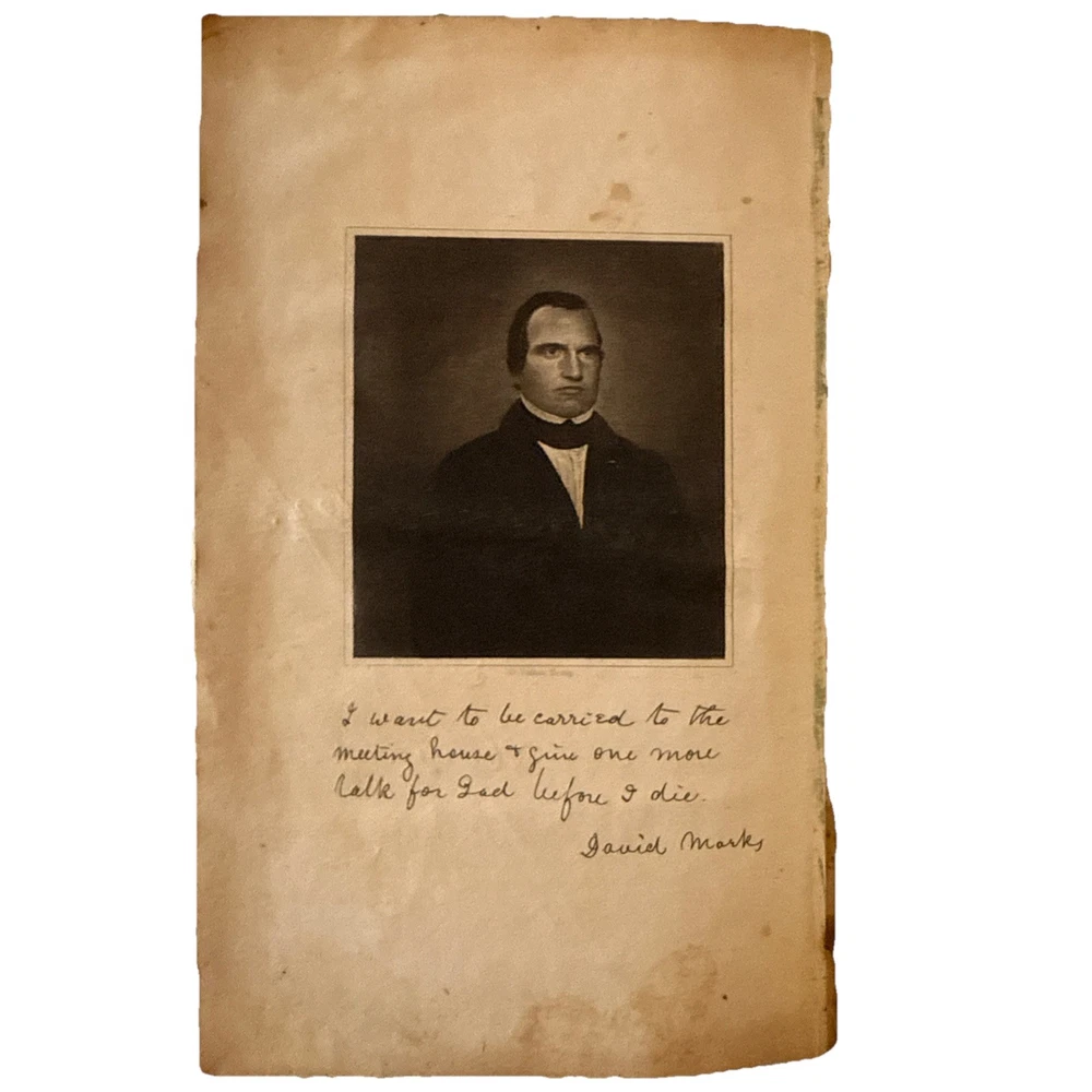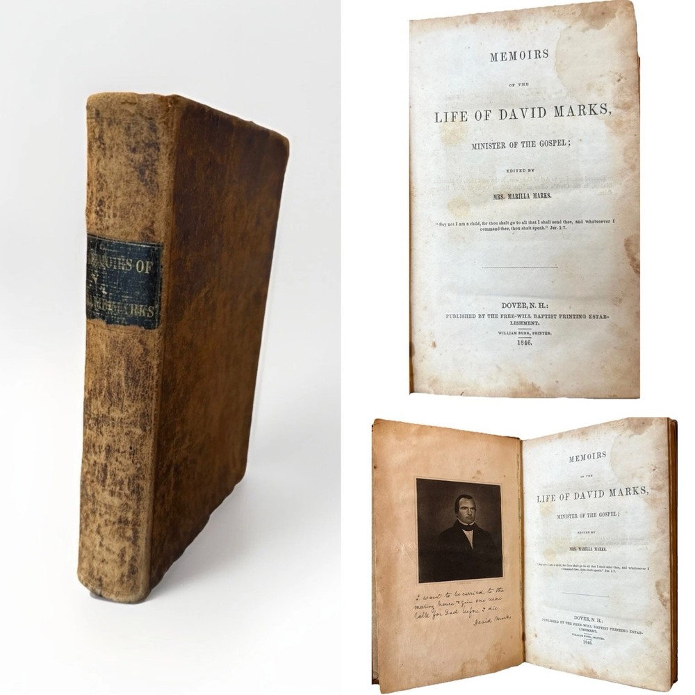 Memoirs of the Life of David Marks, Minister of the Gospel; edited by Mrs. Marilla Marks, published by the Free-Will Baptist Printing Establishment, William Burr, Printer, Dover, N.H., 1846. Octavo. First edition [1831] contains one of the earliest Book of Mormon references and this edition [1846, second], his introduction to the Book of Mormon can be found p. 236–38. Flake-Draper #5278. Good+. Normal rubbing and wear to the cover, edges and corners. Some scuff marks on cover rear. Title on spine is still relatively clear in gilt as well as faint gilt lines on spine. Head of spine is just beginning to separate at one corner. Inscriptions on front endpaper and flyleaf. Title page to about page 40 has damp staining to the upper right corner. There is some foxing to the pages and some pages are dog eared. Overall in great condition. Shipped with USPS Ground Advantage.
