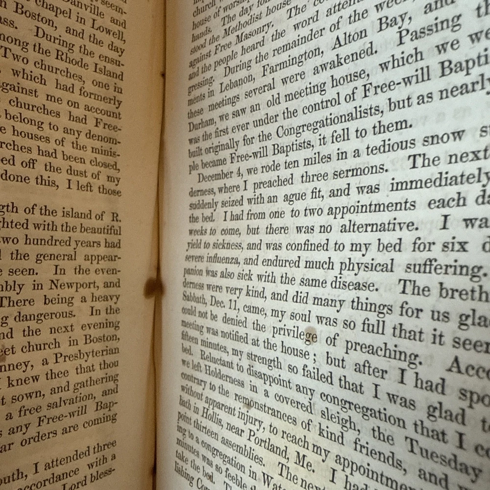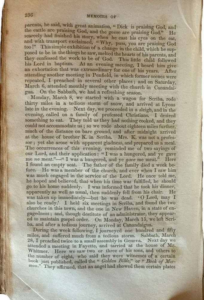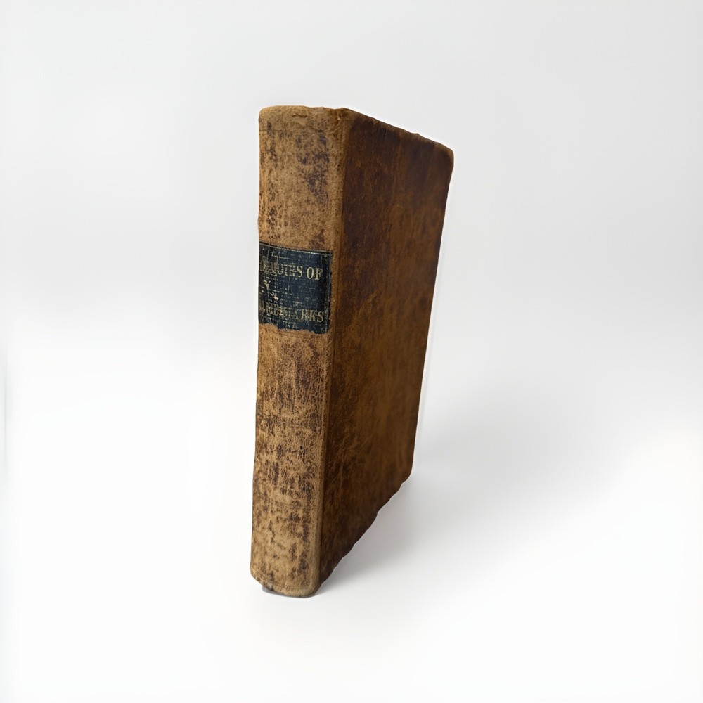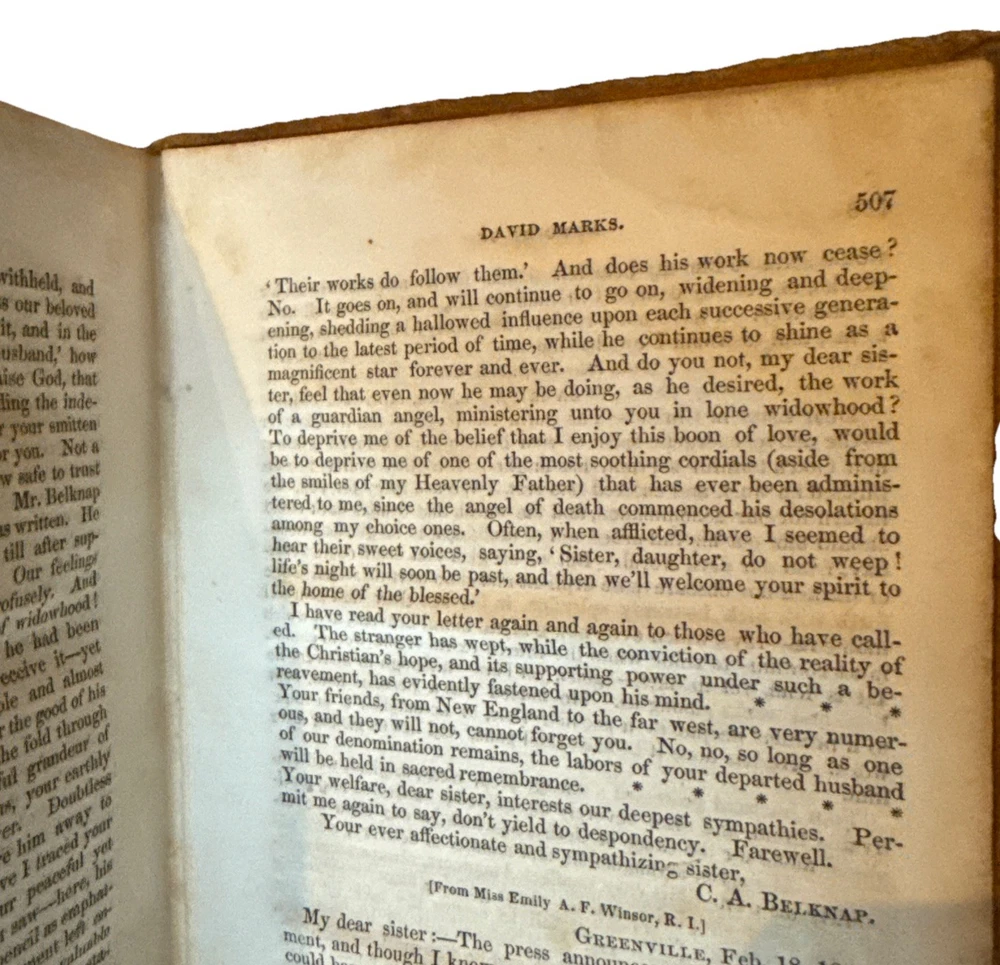Memoirs of the Life of David Marks, Minister of the Gospel; edited by Mrs. Marilla Marks, published by the Free-Will Baptist Printing Establishment, William Burr, Printer, Dover, N.H., 1846. Octavo. First edition [1831] contains one of the earliest Book of Mormon references and this edition [1846, second], his introduction to the Book of Mormon can be found p. 236–38. Flake-Draper #5278. Good+. Normal rubbing and wear to the cover, edges and corners. Some scuff marks on cover rear. Title on spine is still relatively clear in gilt as well as faint gilt lines on spine. Head of spine is just beginning to separate at one corner. Inscriptions on front endpaper and flyleaf. Title page to about page 40 has damp staining to the upper right corner. There is some foxing to the pages and some pages are dog eared. Overall in great condition. Shipped with USPS Ground Advantage.