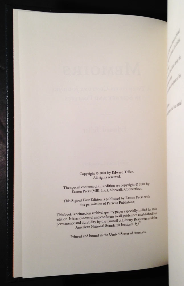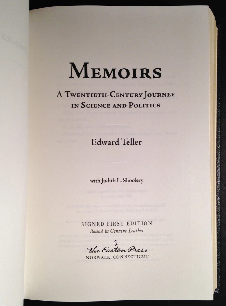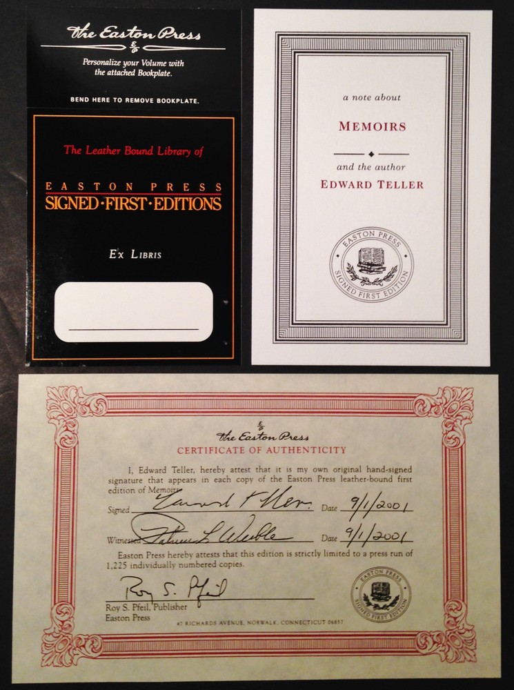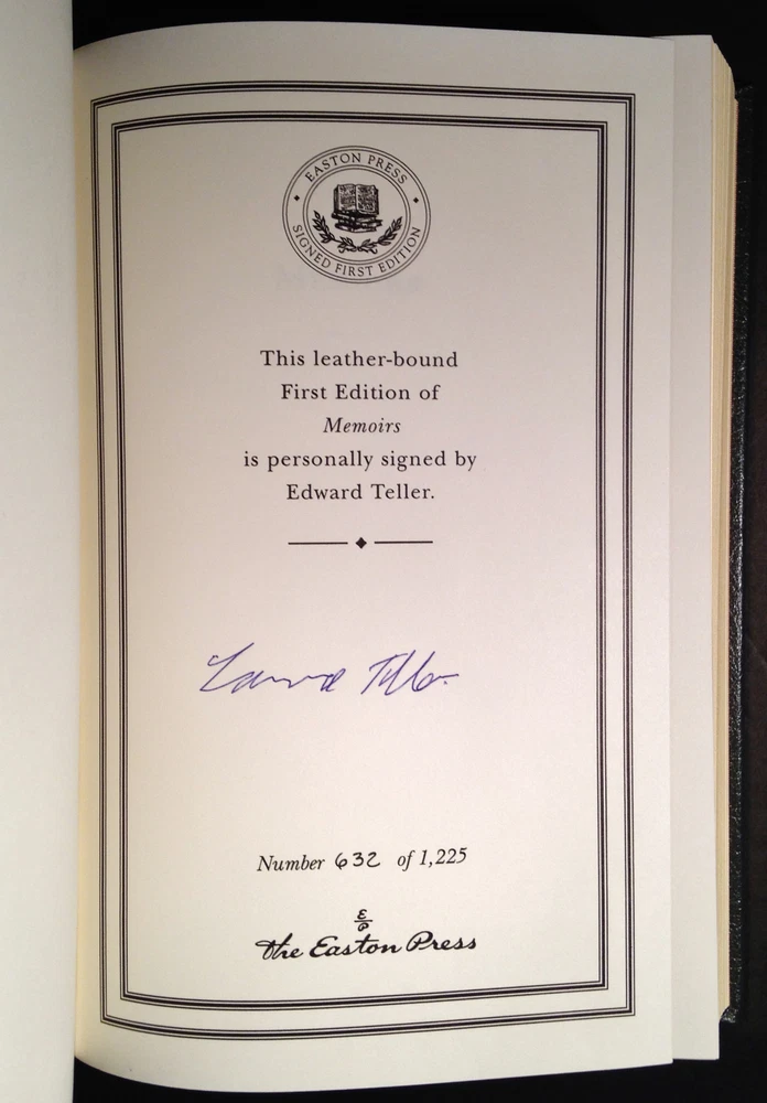 Memoirs by Edward Teller, Easton Press Signed First Edition, Leather, w COA Memoirs by Edward Teller, Easton Press Signed First Edition, Leather, w COA Memoirs: A Twentieth-Century Journey in Science and Politics by Edward Teller Easton Press Signed First Edition Leather Bound, with Certificate of Authenticity # 632 of 1225 This book is in excellent condition. Part of the SIGNED FIRST EDITIONS collection of The Easton Press, Norwalk, Connecticut, 2001. The Easton Press books are bound in genuine leather binding, with 22kt gold accents and hubbed spines, gilded page ends, acid-neutral paper, Moire fabric endsheets, and evocative illustrations and decorations. We will be happy to combine shipping, wherever possible. Some items cannot be combined because of their size, weight or because they are fragile. Please ask if you have any questions. Your order will ship by the next business day after receiving payment. All items are from a smoke-free environment. Thank you, and Happy Reading!
