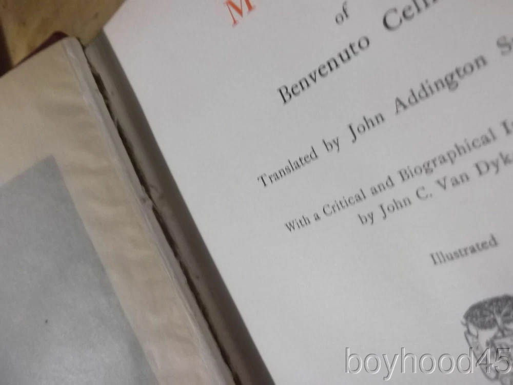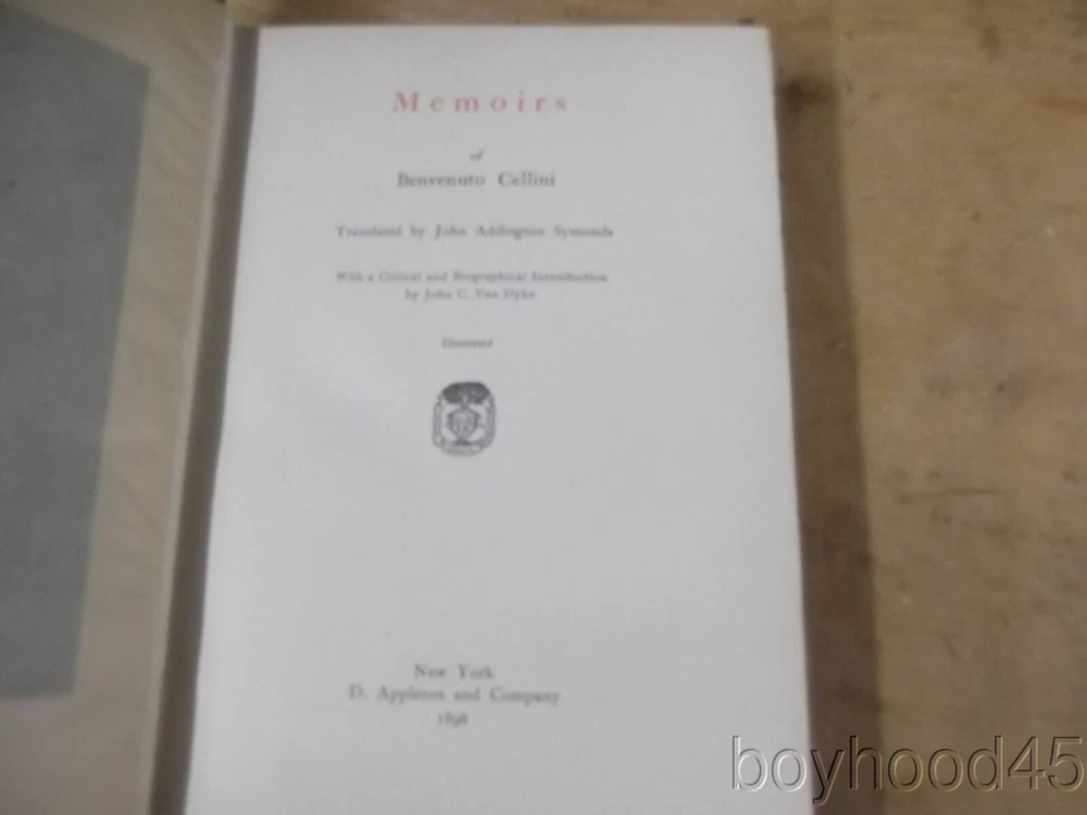 Memoirs of Benvenuto Cellini Trans. by J.A. Symonds-Leather-1898 Description Memoirs of Benvenuto Cellini Trans. by J.A. Symonds-Leather-1898 I am selling "Memoirs of Benvenuto Cellini" Translated by John Addington Symonds. Published by D. Appleton and Co., NY, 1898. Harcourt, Brace and Co., NY, 1928. First Edition. Bound in half leather. Shows very minimal wear. Clean and tight. A FINE copy!! Book measures 6 3/4 X 9 1/8, 417 pages. I will offer this lovely half leather book for only $65.00 plus $4.50 S&H in the US. Shipping costs to Canada will be considerably less than the general international rates quoted. Thanks for shopping mellowpagesrarebooks.com Payment I accept the following forms of payment: PayPal Shipping & Handling I will ship Priority for an additional fee upon request. PLEASE NOTE: SHIPPING COSTS FOR MULTI-VOLUME SETS OR OVERSIZED BOOKS WILL EXCEED THE STANDARD "US SHIPPING" ECONOMY RATE OF $5.00. COST OF SHIPPING OVERSIZED BOOKS OR MULTI-VOLUME SETS ARE SPECIFIED WITHIN THE TEXT OF THE LISTING. Canadian buyers are not subject to stated international shipping costs and will pay less than the amount stated. US Shipping $4.50 USPS Media Mail® International Shipping $44.00 USPS First-Class Mail International FREE scheduling, supersized images and templates. Get Vendio Sales Manager. FREE scheduling, supersized images and templates. Get Vendio Sales Manager. Condition Notes: A FINE copy of this lovely book!! Payment Payment Options: Paypal Shipping Shipping Options: Domestic shipping: Fixed Shipping Charges. International shipping: Fixed Shipping Charges. Shipping Carrier Domestic International Shipping Locations Usps Book Rate $4.50 - - Usps First-Class Intl - $44.00 Worldwide I will ship to: United States, Worldwide Vendio provides powerful selling automation for sellers of all sizes. Get business information that counts! - Vendio Counters are active content free.