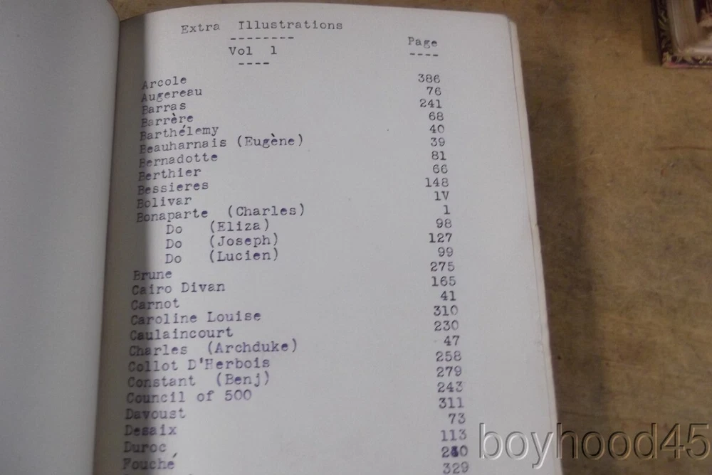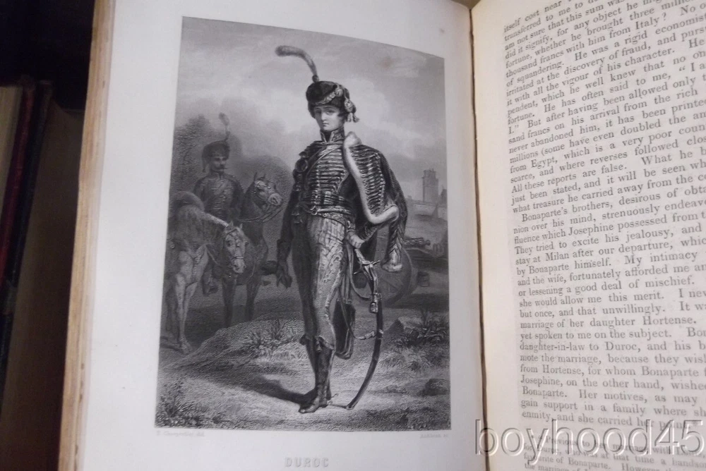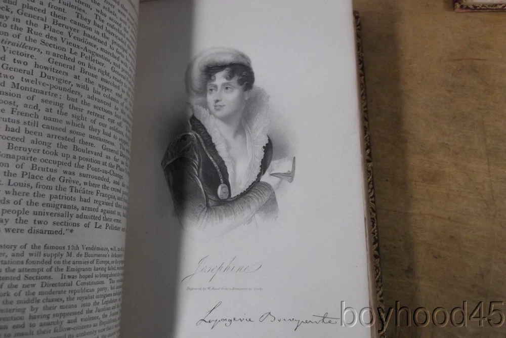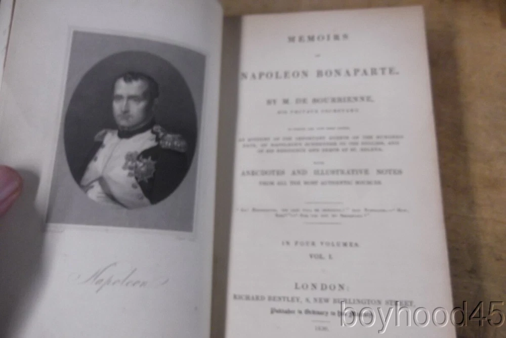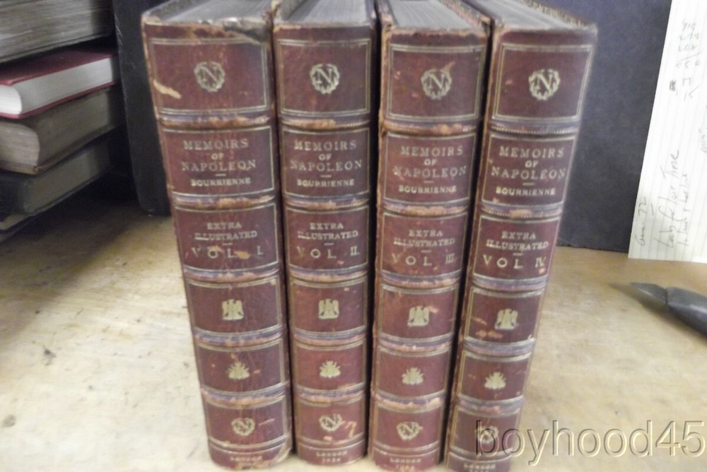 Memoirs of Napoleon Bonaparte by M. De Bourrienne-1836-4 Vols-EXTRA ILLUSTRATED Memoirs of Napoleon Bonaparte by M. De Bourrienne-1836-4 Vols-EXTRA ILLUSTRATED Click images to enlarge Description This is "Memoirs of Napoleon Bonaparte" by M. De Bourrienne, Napoeon's private secretary. Published by Richard Bentley, London, 1836. PLEASE NOTE THAT THIS IS THE EXTRA ILLUSTRATED EDITION WHICH CONTAINED 171 EXTRA PLATES and a listing of all of the extra plates is bound into the beginning of the first volume. First Edition. Complete in 4 volumes that were bound in fine, fll leather bindings by Morrell, London--spine lettering indicates that this is an extra illustrated edition and Napoleonic symbols appears on spine and covers. Unfortunately, the bindings are worn--covers have separated from the books on two of the volumes, there is wear/leather loss to spines and gutter wear/gutter cracking is present. The interior text blocks are clean, tight and complete. Personal bookplates are adhered to front endpapers. Interiors are very clean, tight. I will call the books Fair to Good. They measure 5 7/8 X 8 3/4. THESE WERE PREMIUM UPGRADED EDITIONS IN PREMIUM BINDINGS--THIS SET SHOULD BE PROFESSIONALLY RESTORED. A SCARCE FEW copies of this set can be found on other internet booksits for upwards of $400, while the extra illustrated sets are selling for $3000-$4500!!!!!! I will offer this PREMIUM, EXTRA ILLUSTRATED SET IN NEED OF RESTORATION for only $875.00 plus $11.00 S&H in the US. Shipping costs to Canada will be considerably less than the general international rate quoted. Condition Notes: Books show expected wear. Clean. This set should be professionally restored!!!! Payment Paypal Shipping Domestic shipping: Fixed Shipping Charges. International shipping: Fixed Shipping Charges. Shipping Carrier Domestic International Shipping Locations Usps Parcel Select $11.00 - - Usps Priority Intl - $83.65 Worldwide I will ship to: United States, Worldwide Vendio Images: More than just a pretty image. 250+ Mobile Responsive & Active Content Free Listing Templates with Vendio Sales Manager. Vendio provides powerful selling automation for sellers of all sizes. Get business information that counts! - Vendio Counters are active content free.