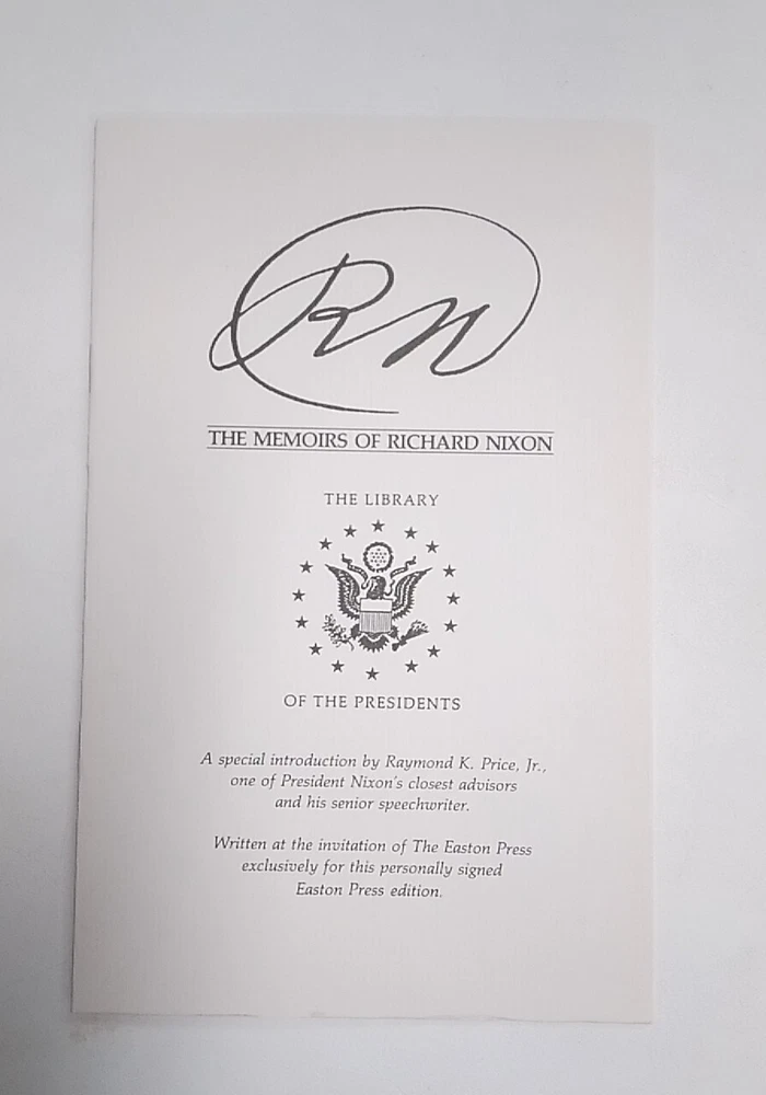 Memoirs of Richard Nixon: SIGNED. Limited Collector Edition by Easton Press. Includes special introduction by Raymond K. Price Jr., Nixon's special speechwriter. Leatherbound, black with gilt lettering, ribbon bookmark. Very Good condition, pristine. See photos for details.