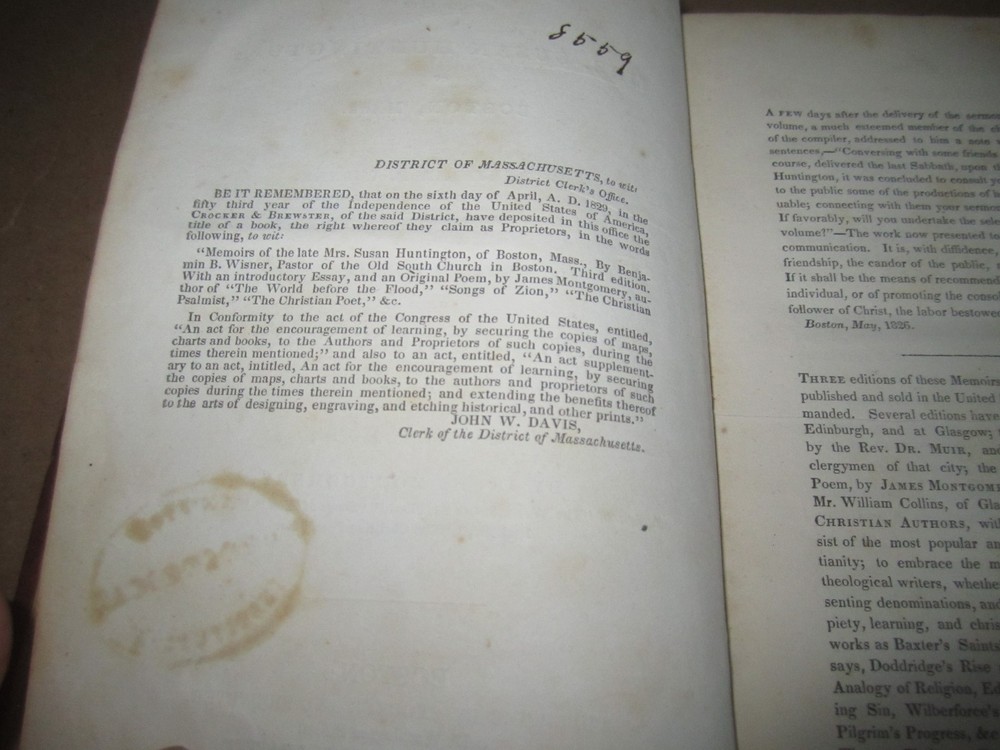 If you are using the Ebay APP and do not see the "Condition Description", please go to the "About this Item" section and hit the arrow to the right. This will lead you to the "Condition Description". Thank you! Memoirs of the Late Mrs. Susan Huntington of Boston, Mass. Wisner (1833) 4th edition. acceptable. ex. lib. of Newton Theological inst w/ labeling to spine, stamp to title,, scan tag to rear, etc. Detached front board that is holding by a thread that may soon be broke.. Scuffed leather. Bookplate to front inner board of a Daniel Sharp, founder of the Newton Theological Inst. Foxing throughout. See pics. At some point Ebay had a bug in their system, resulting in many of my items to lose their photos. Unfortunately, I have too many items to replace all the lost photos. If you are interested in an item that is lacking multiple photos, let me know and I will do my best to provide you with additional images.