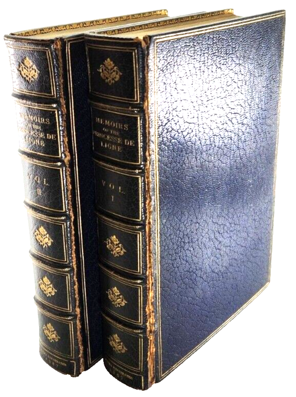 A. Parker's Books Offering antique books, vintage books, and rare books for over 43 years View our other listings: A.Parker's Books FIRST PRINTING, FIRST EDITION Memoirs of the Princesse de Ligne, Translated by Laura Ensor Perey, Lucien London: Richard Bentley & Son, 1887 Two volumes, 8v0. (5 3/4 by 8 1/4 inches). Blue full morrocco, five raised bands with gilt dentelles, titles, and decorations. Numerous b/w plates. Light toning to spine; splitting to hinge of volume 1; light foxing to edges of block. PH I4 JM 5/23 GVR