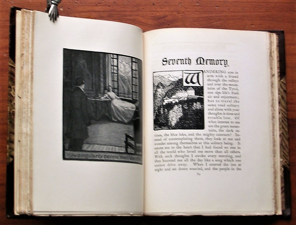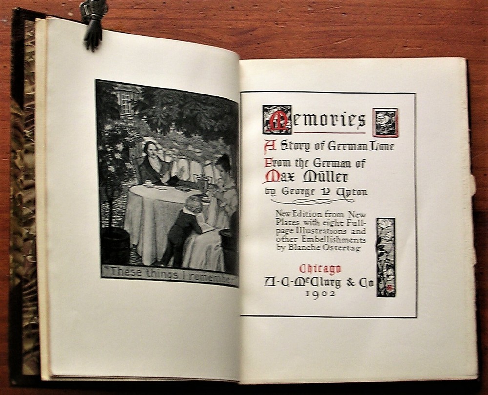 Memories: A Story of German Love , by Max Muller. Translated into English by George P. Upton. "New Edition from New Plates with eight Full-page Illustrations and other Embellishments by Blanche Ostertag. Published in 1902 by A. C. McClurg & Co., Chicago. Hardcover in 3/4 leather and marbled boards (and endpapers), top edge gilt. The author's reminiscences, with several black and white illustrations by Blanche Ostertag. Very good condition. Rubs and small nicks and dents along the leather edges and rub-throughs in the marbled paper along the bottom edge. Unmarked, complete and securely bound. Beautiful, gilt floral decorations along the banded spine. A handsome copy. FREE shipping in the USA. Thank you for looking! Location: leather volumes drawer #3.