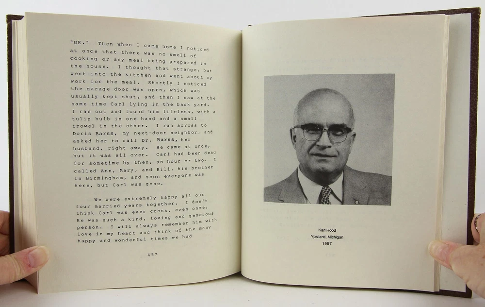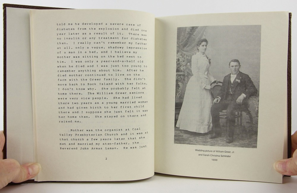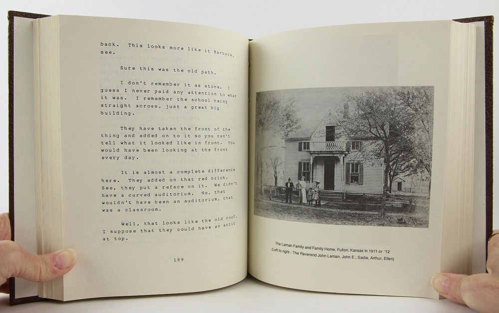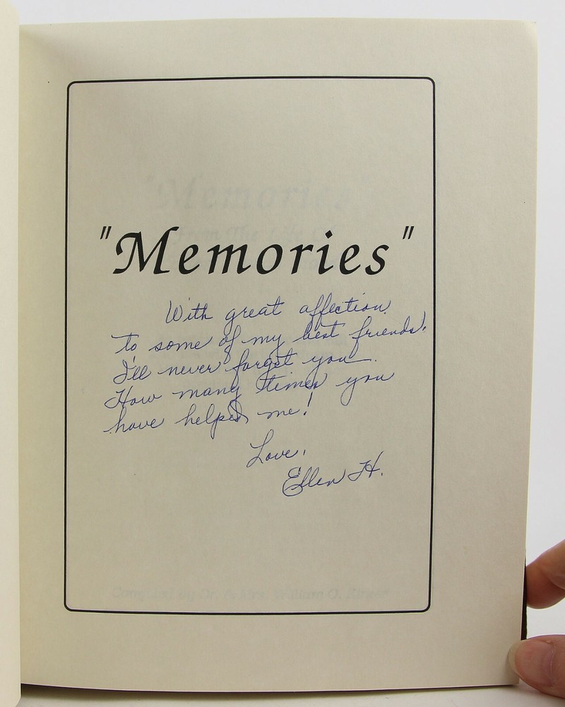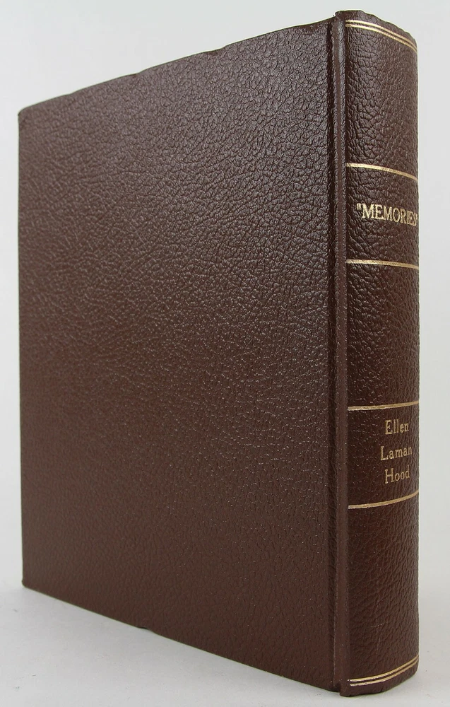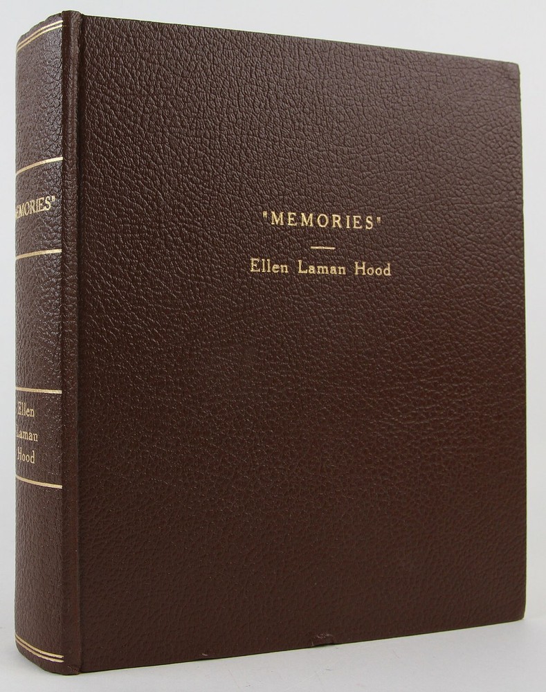 "Memories": From the life of Ellen Laman Hood By Ellen Laman Hood [1987] signed and inscribed first edition, W.O. Kirker (Cold Spring, Kentucky), 8 3/8 x 9 3/4 inches tall brown faux leather hardcover, no dust jacket (as issued), gilt lettering to front cover and spine, [14], 478, [4] pp. Very slight rubbing to covers, with slight bumping to the lower edge of the front cover, and both the upper and lower edges of the rear cover. Nicely inscribed and signed by the author on the half title page. Otherwise, a very good copy - clean, bright and unmarked - of this scarce memoir and family history. The memoirs of Ellen Laman Hood (1900-1995), 'as recounted to her son Bill and his wife Barbara during a 1984 journey to visit all her previous homesites.' Contents: Coal Valley, Illinois, 1900-1904 Braddock, North Dakota, 1904-1909 Walnut Valley, Kansas, 1909-1911 Fulton, Kansas, 1911-1914 Grand Haven, Michigan: The Laman Family Relations Tustin, Michigan, 1914-1916 McBain, Michigan, 1916-1926 Alma, Michigan, 1916-1923 Grand Ledge, Michigan, 1923-1926 Detroit, Michigan, 1926-1931 Marlette, Michigan Snover, Michigan, 1931-1936 Sandusky, Michigan, 1936-1953 Lexington, Michigan, 1940-1941 Mount Clemens, Michigan, 1953-1954 Dexter, Michigan, 1954-1955 Ypsilanti, Michigan, 1955-1984