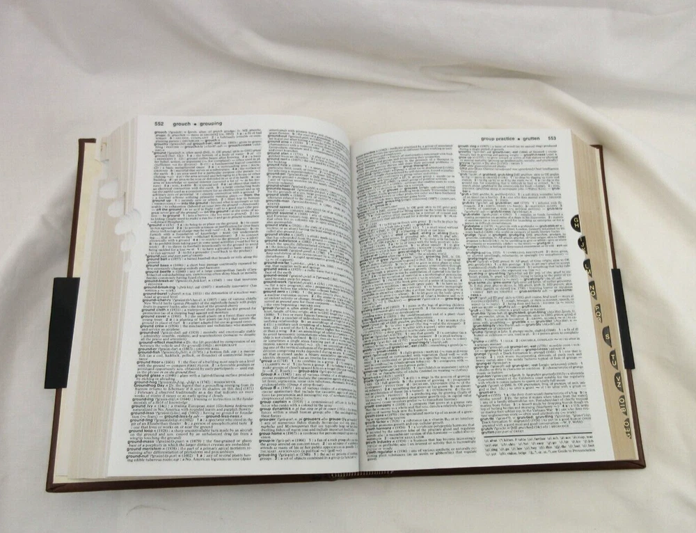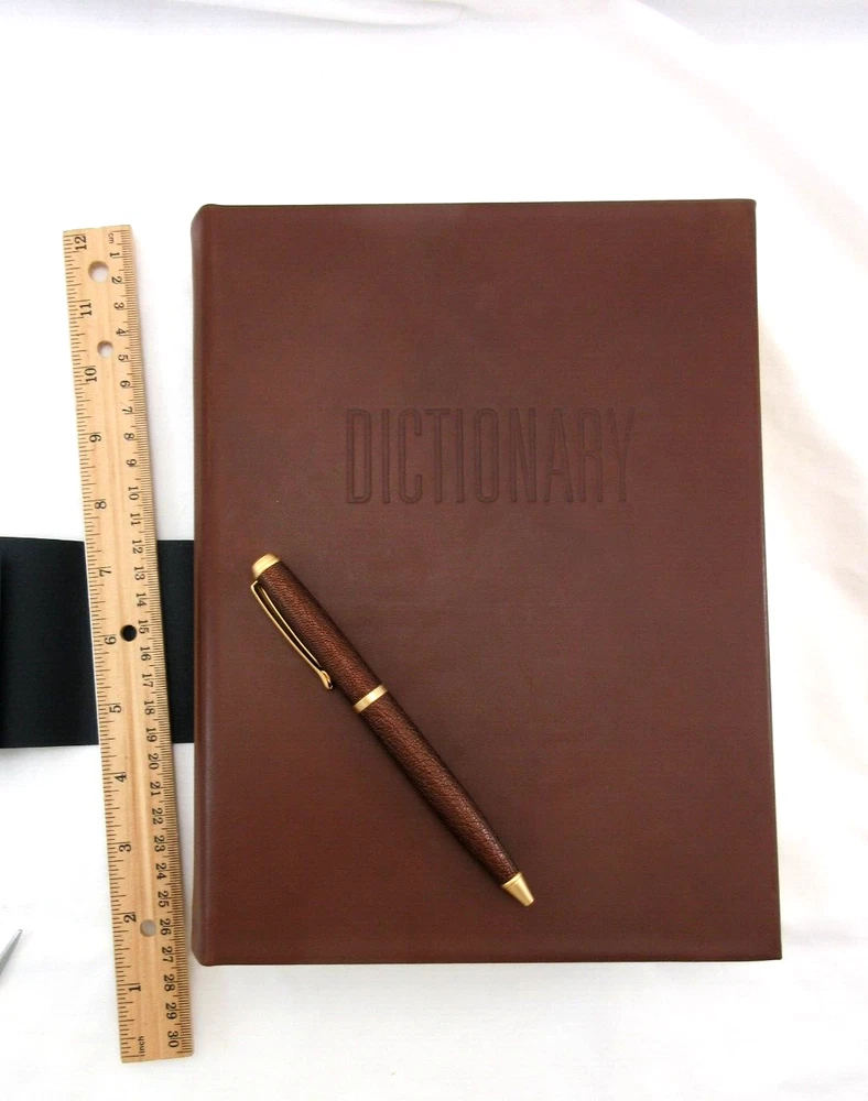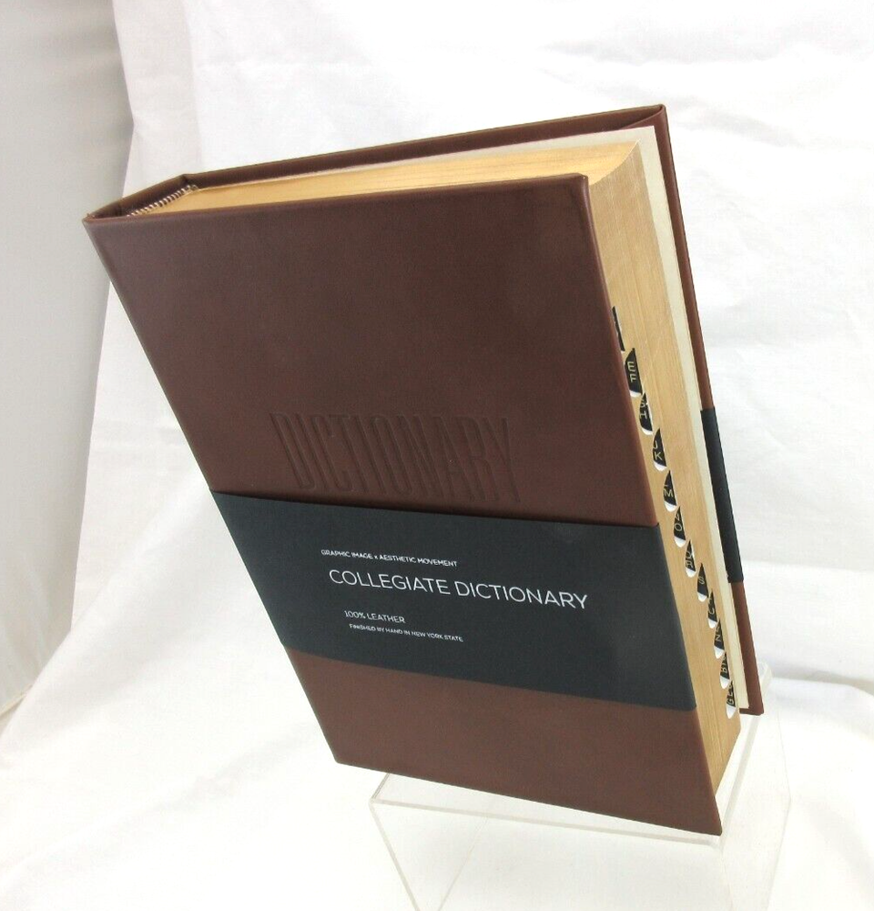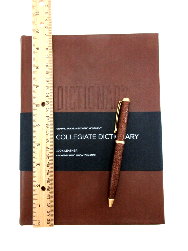 New Merriam-Webster's Collegiate Dictionary Eleventh Edition Smooth full-grain Leather Bound hardcover Handcrafted by Graphic Image in NY Blind embossed lettering on cover Measures : 6.5" W x 9.25" H