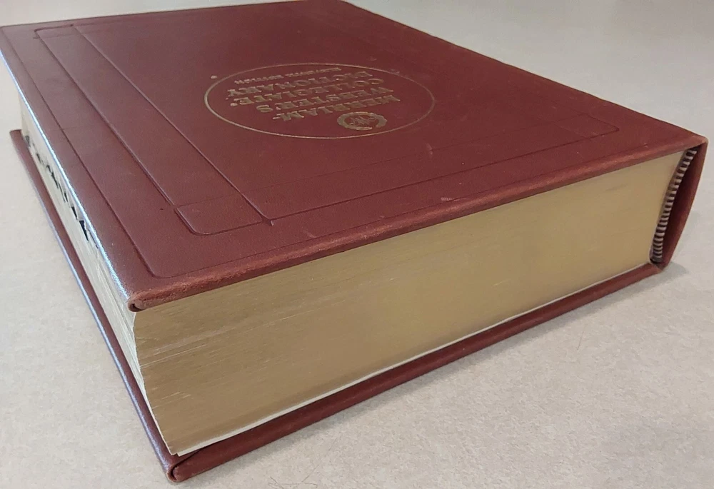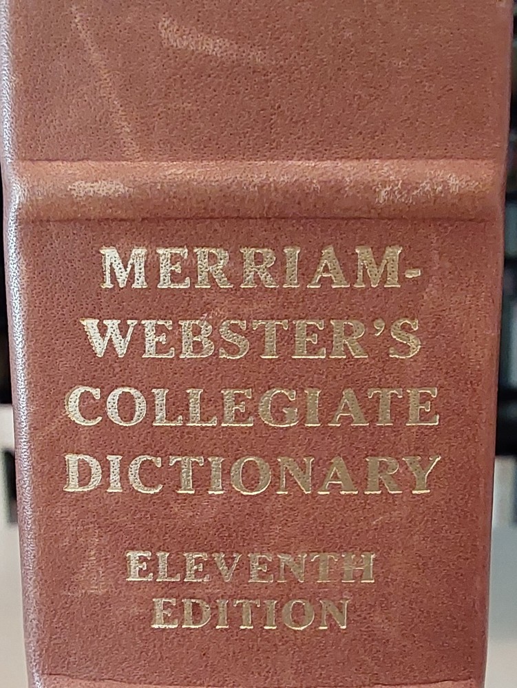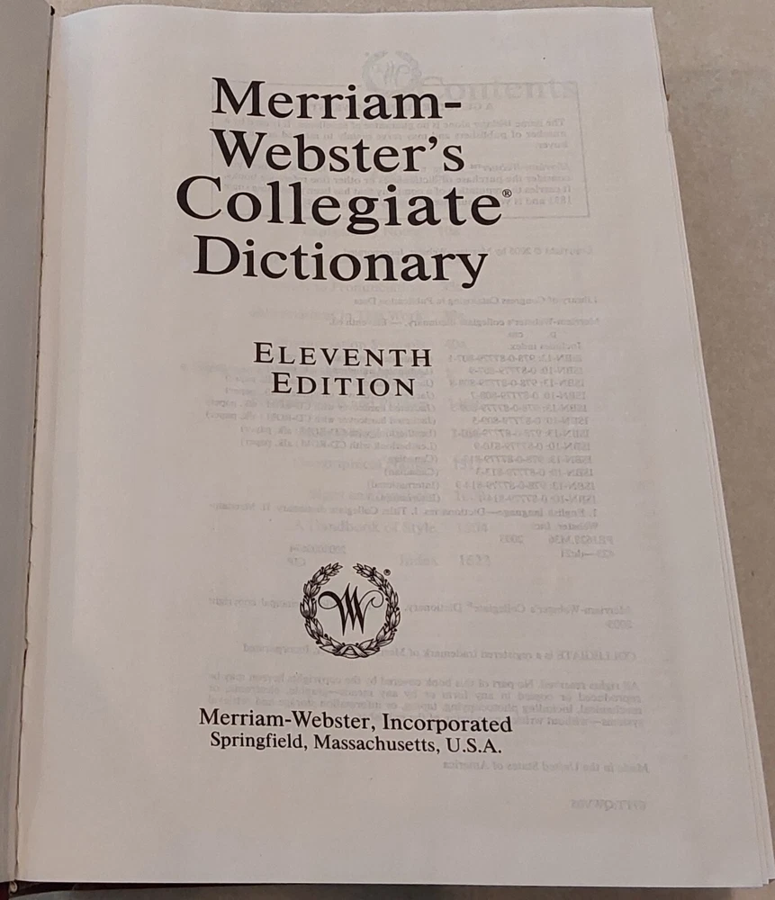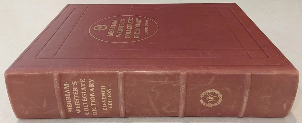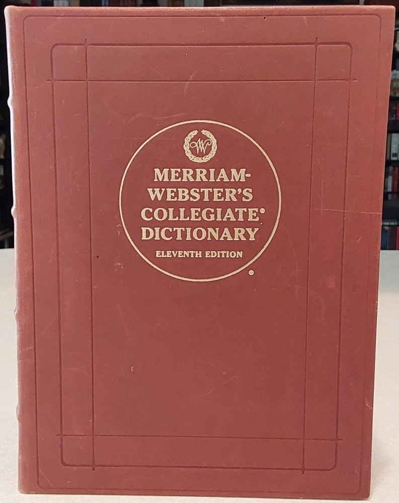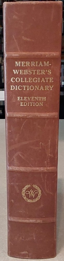 Merriam-Webster’s Collegiate Dictionary , Eleventh Edition. Springfield, MA: Merriam-Webster, 2005. Brown leather-like hardcover, with gilt lettering on cover and spine, 4 raised bands on spine, gilt-edged text blocks, Table of Contents, Index, 1622 pages. Measures about 7 ¼” x 9 ¾.” Weighs almost four pounds. Covers have some scuff wear, as seen in photos. No writing, marks, or tears to pages; has some light creases. Note that I have described the book as best as I can. Look at all photos closely for condition and details as they are also part of the description. Email with any questions.
