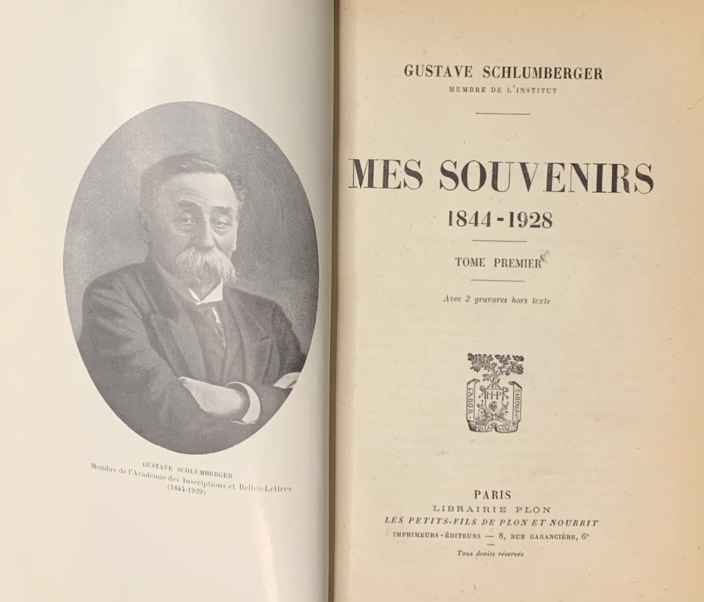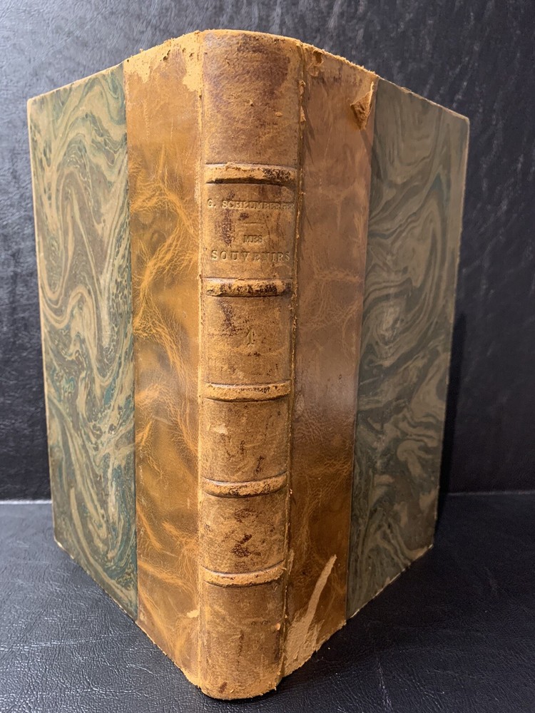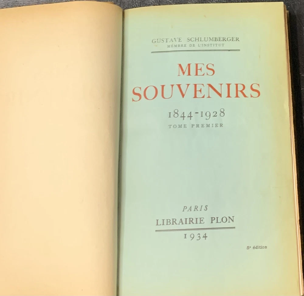 Mes Souvenirs 1844-1928 by Gustave Schlumberger (1934) in French Leon Gustave Schlumberger was a French historian and numismatist who specialized in the area of the crusades and the Byzantine Empire. 1934-Mes Souvenirs 1844-1928 (Plon, Paris) was posthumously published and are Schlumberger's recollections of life in the Third Republic. This book is fair condition. It has a strong leather bond spine with signs of wear. The pages have some discoloring due to age. This book comes from a smoke free home and is written in French. Point to note, this book is in vintage condition with some signs of wear ( please see pictures for further condition). Please contact me with any issues prior to leaving negative/neutral Feedback or low detail ratings, as I will always do my best to solve any problems that may come up! Thank you, -Socaloutpost