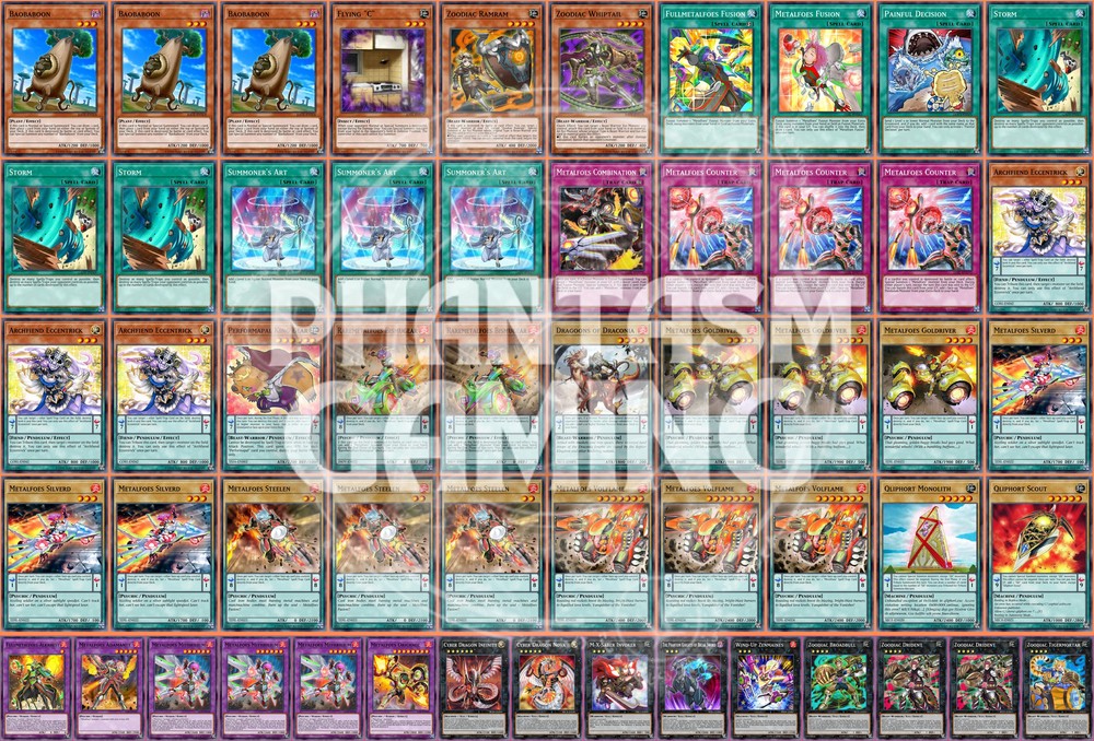 Deck Name: Metalfoes (Grass Zoo) (B) # Main Deck (40) 3 - Baobaboon 1 - Flying "C" 1 - Zoodiac Ramram 1 - Zoodiac Whiptail 1 - Fullmetalfoes Fusion 1 - Metalfoes Fusion 1 - Painful Decision 3 - Storm 3 - Summoner's Art 1 - Metalfoes Combination 3 - Metalfoes Counter 3 - Archfiend Eccentrick 1 - Performapal King Bear 2 - Raremetalfoes Bismugear 1 - Dragoons of Draconia 3 - Metalfoes Goldriver 3 - Metalfoes Silverd 3 - Metalfoes Steelen 3 - Metalfoes Volflame 1 - Qliphort Monolith 1 - Qliphort Scout # Extra Deck (15) 1 - Fullmetalfoes Alkahest 1 - Metalfoes Adamante 3 - Metalfoes Mithrilium 1 - Metalfoes Orichalc 1 - Cyber Dragon Infinity 1 - Cyber Dragon Nova 1 - M-X-Saber Invoker 1 - The Phantom Knights of Break Sword 1 - Wind-Up Zenmaines 1 - Zoodiac Broadbull 2 - Zoodiac Drident 1 - Zoodiac Tigermortar You will receive all of the following cards listed above. Most cards will will be in near mint condition. In the case of certain older cards we will do our best but some cards may be light or even moderatly played in extreme condtions. Those conditions being the card has not been reprinted in a number of years and con no longer be easily purchased in light or near mint condition. Set, Rarity, and Edition will vary and cannot be special requested. These lists are constructed with least expensive rarities we have available in stock. All cards are play legal copies. Note: If purchasing a Yugioh Deck all Speed duel cards are 100% legal at all levels of play. Store Policies Here at PMG_LLC , we pride ourselves on having the best customer service around. If you have any questions or can't seem to find something that you want please do not hesitate to contact us. We will do our best to respond to all questions within one business day. Hours of Operation: Monday-Friday: 2:30pm - 10:00pm Saturday- 10:00am - 8:00pm Sunday 11:00am - 5:30pm Note: We are closed all national holidays. Info: Thank you for choosing PMG_LLC . We appreciate your business. We ship Monday through Friday to make sure you get your deck as quickly as possible. All orders priority orders can use combined shipping. In order to use the combined shipping your whole purchase needs to be checked out as one order. We ship once we have received your payment and payment has cleared. As always if you have any questions or concerns please feel free to contact us via email. Shipping Information: We ship Monday through Friday, barring national holidays during which the United States Postal Service is closed. If you purchase a card on Friday or Saturday please bear in mind it will not ship until Monday. US Shipping: First Class Mail : Free. Comes with tracking information. Priority Mail with Delivery Confirmation : $9.99 All orders are shipped in appropriate protective material inside bubble mailers. International Shipping: We do not offer international Shipping Return Policy: You must return items sold and fulfilled by PMG_LLC within 30 days of delivery to be eligible for a refund. Returns which are damaged in the mail due to improper return packaging will receive partial refunds. We will process a full refund for all items returned in their original condition. In order for us to process your full refund you must include the full name associated with the order as well as the eBay order number inside the return packaging. We will not process returns which do not include the buyer's name and order number. Requirements: Please return items with the original plastic packaging. Failure to do so may result in a partial refund. Also you must inform us of any returns you may wish to process before sending them back. Any items simply send back to us without prior contact will not be eligible for refunds. Important Notes Remember that to benefit from our domestic combined shipping on priority orders you must to pay in a single payment. If you place two separate priority orders you will be charged the $7.50 shipping fee for both orders. If you place multiple orders for Priority shipping you will be charged the corresponding shipping costs for each order, even if you place the orders on the same day. We do not refund shipping costs as we tend to package orders throughout the day and may not notice that you would otherwise have qualified for combined shipping. We want to provide you with 5 Star service and earn your Positive Feedback, so if for any reason you are not happy with your transaction, contact us before leaving feedback. Business Day - Our business day runs from Monday to Friday from 9am to 4pm, excluding US national holidays. Any orders placed or payments cleared less than 4 hours before the close of business will be considered orders from the following business day.