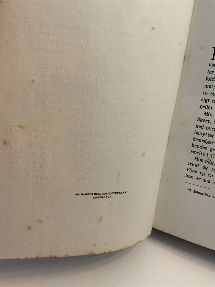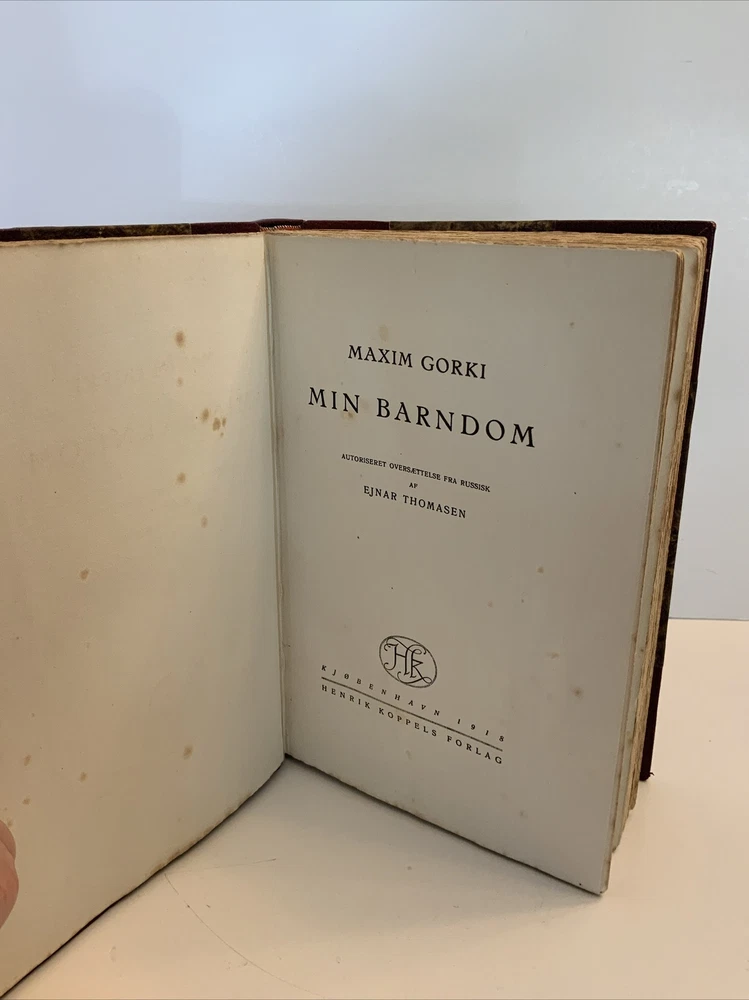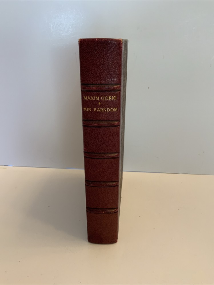 This rare and collectible book is a Swedish translation of Maxim Gorky's "My Childhood" titled "Min Barndom". Published in 1918, this original edition features a leather binding and was printed in Denmark. The book provides a riveting account of Gorky's early life in Russia and is a must-read for anyone interested in biographical and autobiographical literature. The language is in Swedish, making it a great addition to any foreign language collection. Ideal for collectors and enthusiasts of antiquarian books. This beautiful book is in amazing shape considering its age. It has foxing on the pages and worn corners. The binding is in excellent shape.