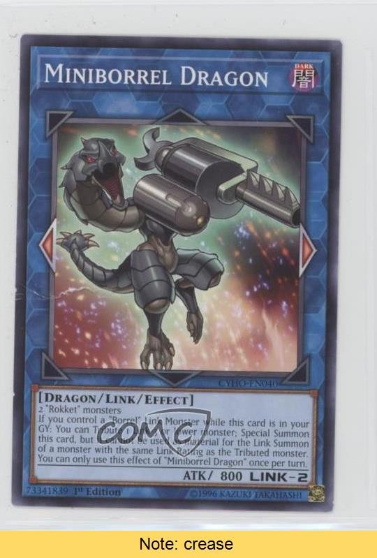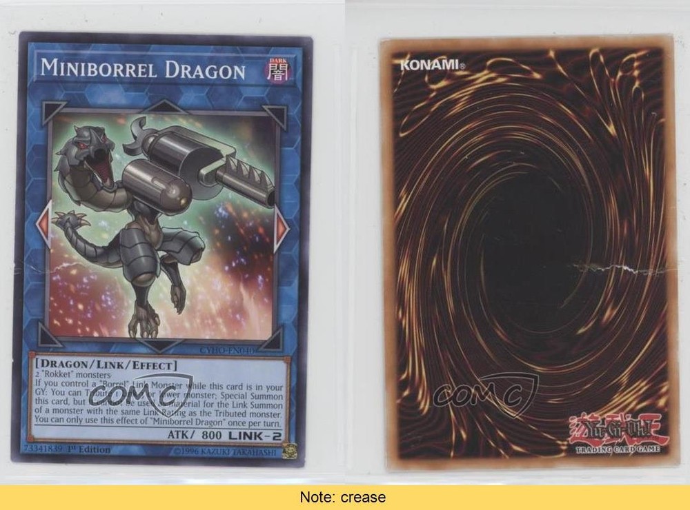 2018 Yu-Gi-Oh! Cybernetic Horizon - Booster Pack [Base] - 1st Edition #CYHO-EN040 Miniborrel Dragon COMC Item: 103564848 CONDITION NOTE: crease - YuGiOh Card Search for more: 2018 Yu-Gi-Oh! Cybernetic Horizon Search for more: 2018 Yu-Gi-Oh! Cybernetic Horizon - Booster Pack [Base] - 1st Edition View all of our Listings Auctions Buy It Now About Us Located in the beautiful Pacific Northwest, COMC (Check Out My Cards) is the world's largest consignment service for trading card singles. More than 10,000 people have used our consignment service to list over 50 million trading cards. Find out how we can help you consign your items on eBay by contacting us through eBay messaging. COMC -- "The Safe & Easy Way to Buy & Sell" Raw Condition for Modern Cards Unless otherwise noted, raw modern cards are listed in Near Mint-Mint condition or better. A NM-MT card appears to be Mint at first glance, but upon closer inspection, may exhibit some of the following: minor print defects (e.g. roller marks, print line, dimple), minor scratches, slight edge wear, and slight corner wear. Centering is clearly visible in the images provided and does not factor into our condition assessment. Raw Condition for Vintage Cards Unless otherwise noted, raw vintage cards are listed in Excellent condition or better. An EX card may exhibit some of the following: minor rounding of corners, surface wear, print defects, light scratches, and slight edge wear/chipping. Centering is clearly visible in the images provided and does not factor into our condition assessment. Domestic Shipping Combined shipping for multiple items is available. To receive combined shipping, please ensure all desired items are in your eBay shopping cart before proceeding to checkout. eBay limits orders to 40 items per order. We automatically combine multiple orders placed on the same day. If you place multiple orders on the same day, please contact us to request a refund of applicable shipping costs. Signature confirmation may be required on invoices over $400. All cards are protected and shipped securely. International Shipping COMC offers eBay's International Shipping (EIS) for international orders under $2,500* (see country exceptions below). All duties and import fees are paid at checkout; in the rare event that there are additional import fees upon delivery, these are borne by the buyer. EIS packages route through a shipping hub in Erlanger, KY before shipping to their final destination. Please note that EIS does not allow for combined shipments. The shipping rates are determined by eBay and cannot be adjusted. *Maximum sale price exceptions: Colombia, Kuwait ($2,000); Taiwan ($1,539); Chile, Costa Rica, Guatemala, Honduras, Trinidad and Tobago ($1,000); Antigua and Barbuda, Aruba, Belize, Dominica, Grenada, Philippines, Saint Kitts and Nevis, Saint Lucia, Montserrat, Turks and Caicos Islands ($500); Dominican Republic, El Salvador ($200). Please request a shipping quote through eBay messaging for orders that exceed the maximum sale price supported by eBay's International Shipping. You will be responsible for all duties and import fees for international orders shipped outside the EIS. All cards are protected and shipped securely. Payment COMC does not accept offers on our cards through our eBay storefront. COMC utilizes eBay’s managed payments system. If you are experiencing difficulties making a payment, please contact eBay for assistance. Return Policy Returns are only accepted on the rare occasion the item is not as described. If you are making a return, please initiate the return process through eBay so a mailing label can be provided for you. Prior to listing, our expert team carefully assessed this item to represent it accurately. Please review the description and high-definition images prior to purchasing to ensure this item meets your satisfaction. We welcome you to contact us if you have further questions about this item. Trust and Integrity COMC carefully assesses each item consigned to us to prevent fraudulent items from entering the marketplace. If you believe an item offered on COMC may be fraudulent, please contact us with details so we can investigate the issue. Items we determine are outside our supported items policy may be removed. Last Modified: 6/2/2025 10:04:47 PM PDT
