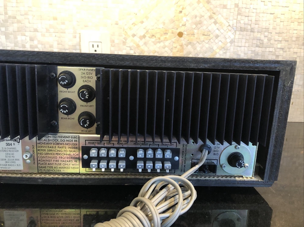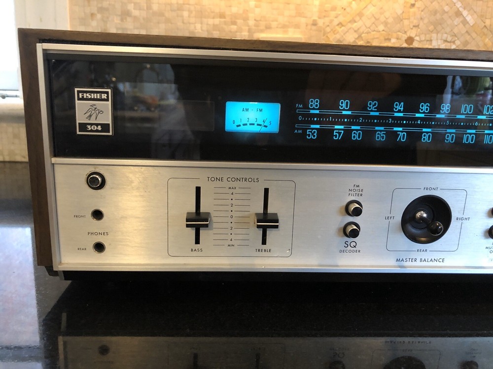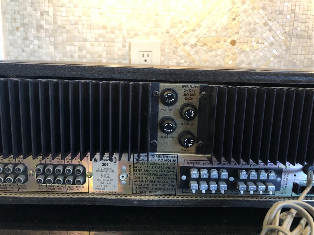 Fisher 304 2/4 Channel Stereo Receiver (1972-73) Specifications Tuning range: FM, MW Power output: 38W/ch (stereo), 15W/ch into 8Ω (quadraphonic) Frequency response: 20Hz to 20kHz Total harmonic distortion: 0.5% Damping factor: 30 Input sensitivity: 2.7mV (MM), 200mV (line) Signal to noise ratio: 56dB (MM), 65dB (line) Dimensions: 21-1/2 x 6-7/8 x 16-7/8 inches Weight: 39lbs Year: 1972