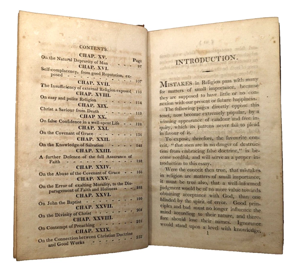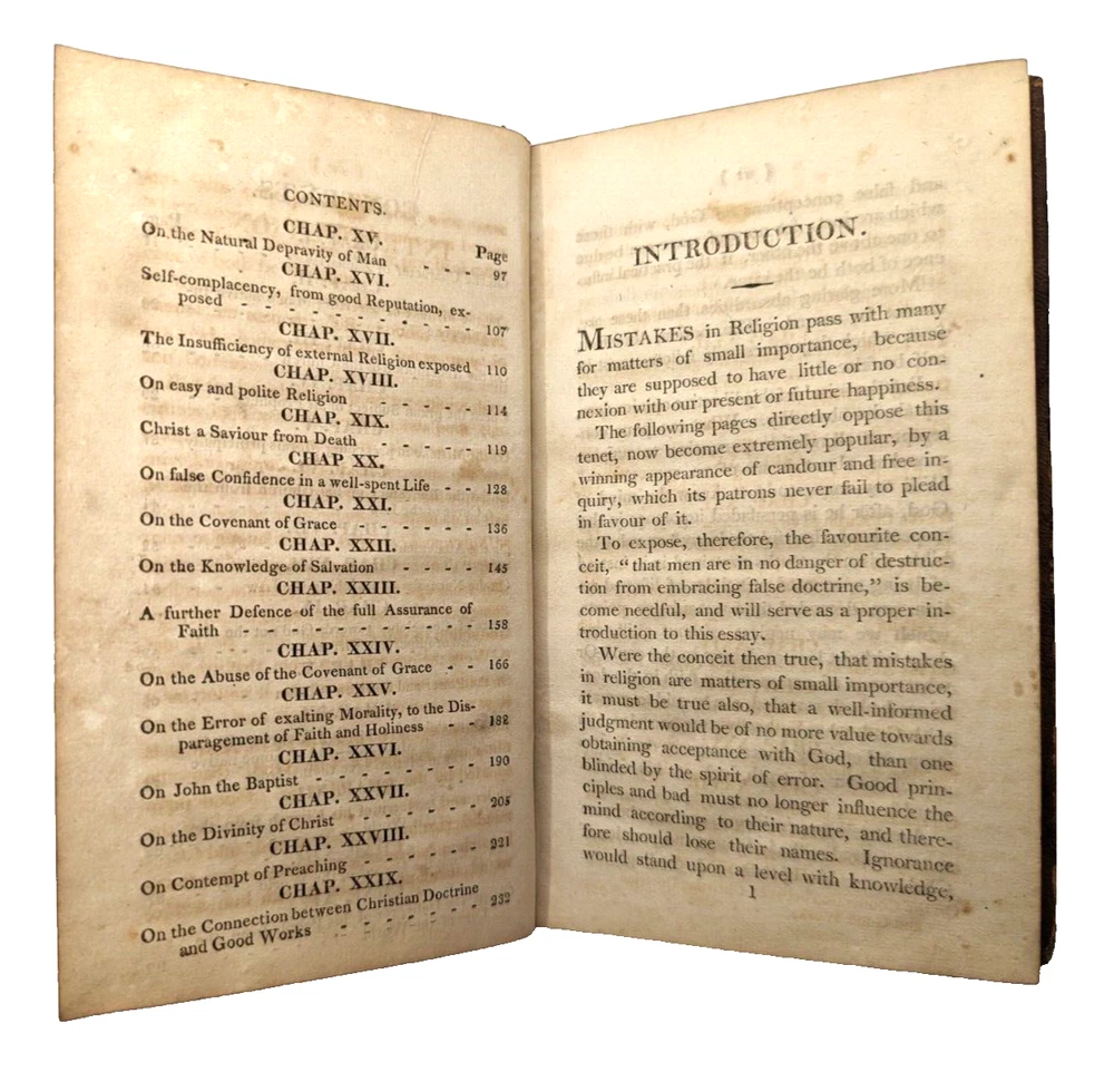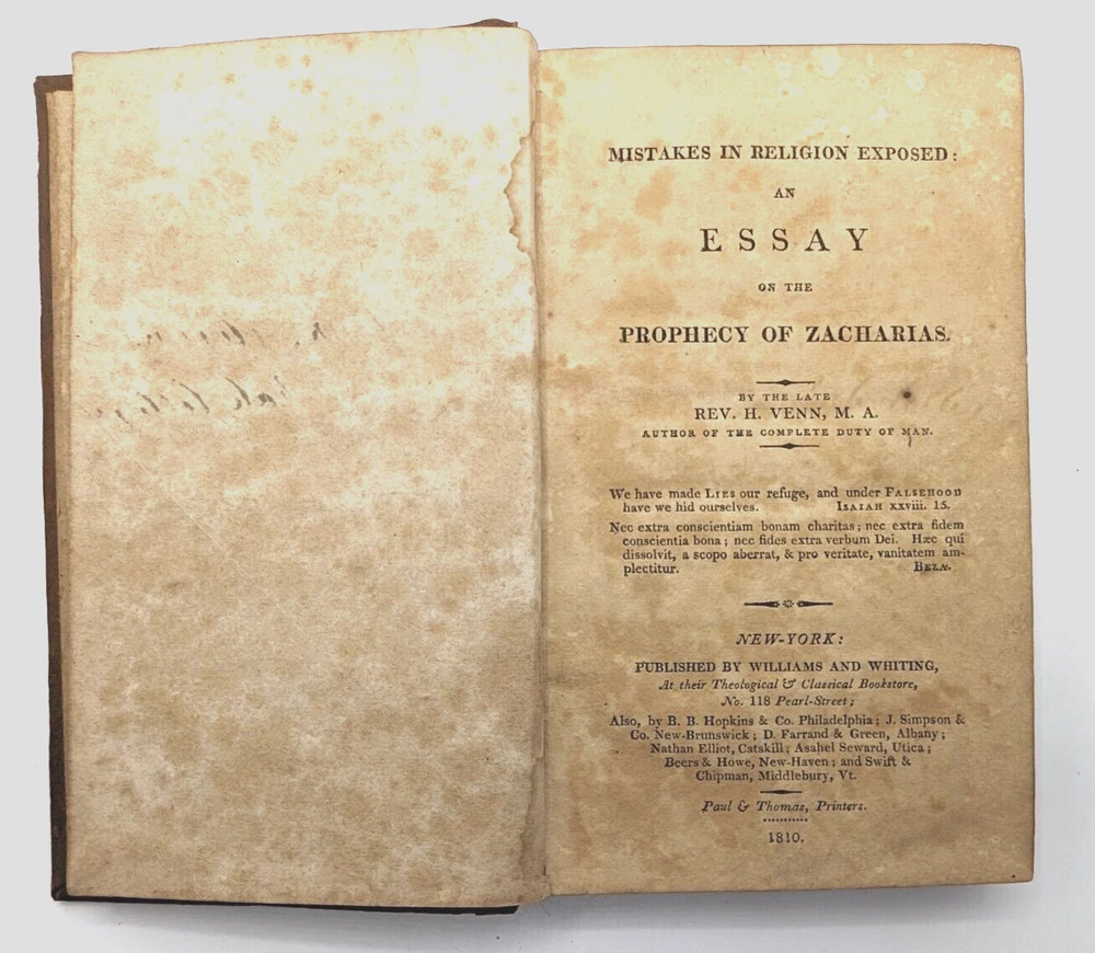 For your consideration is a rare example of "Mistakes In Religion Exposed: in an Essay on the Prophecy of Zacharias" by Rev Henry Venn. 1810 printing. Overall acceptable condition for being over 200 years old. All pages intact, binding is intact and original with no repairs. Leather hinge on the exterior is dried and split notable on the front cover and lesser on the rear cover. However, boards are well-attached as the binding and endpages have held together very well over the centuries. While far from perfect, due to the rarity it may well be one of the finest copies in on the market. 7.25" x 4.5", 266 pages. FREE shipping to the USA and we're happy to ship internationally at cost. Thanks for looking!