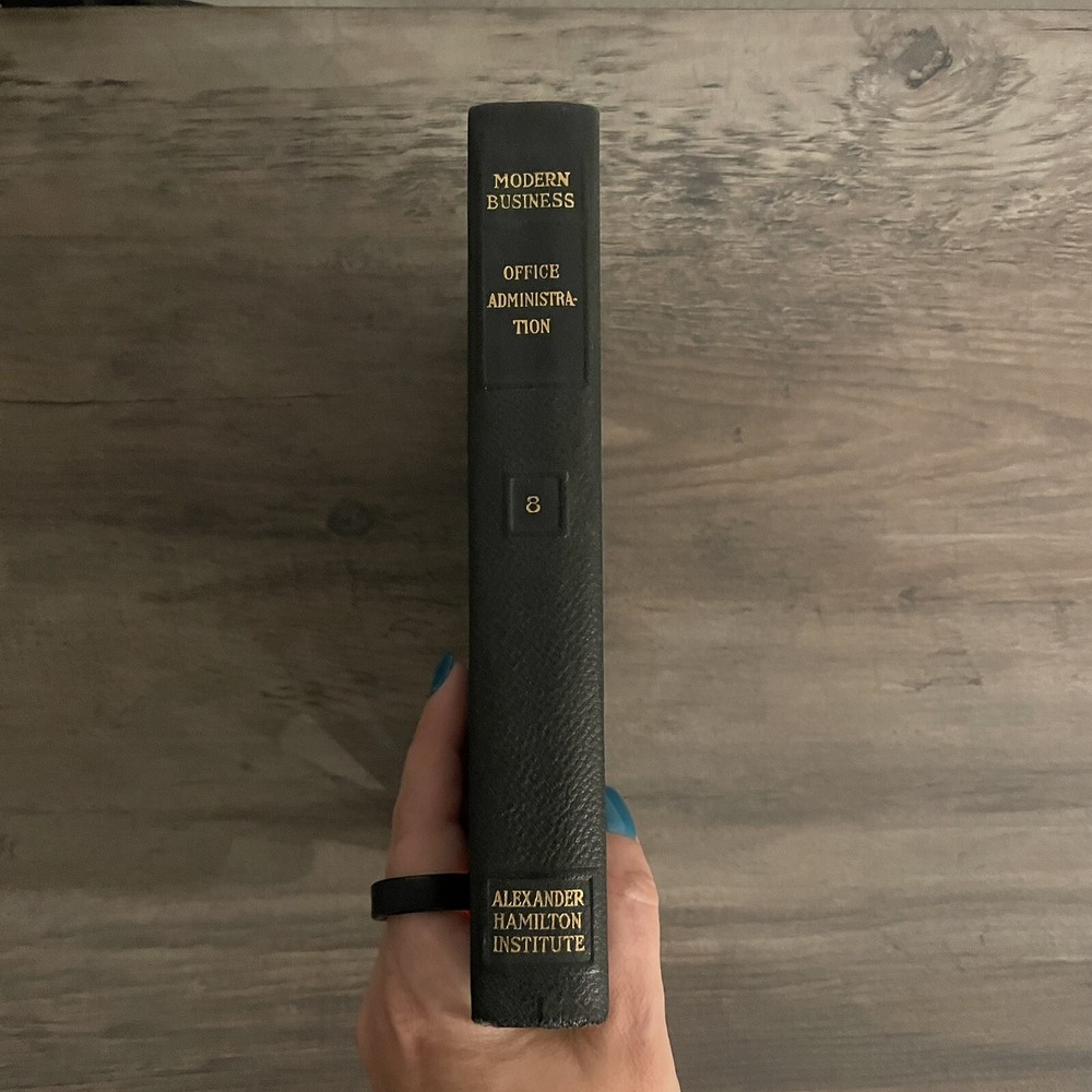 Modern Business Alexander Hamilton Institute Office Administration #8 Vtg 1921 Overall good condition for a pre-owned vintage book from 1921, BUT this one does have a tear on the inside front cover. However, since cover is a leather or leather-type material, the tear doesn’t go through to the front (see pics). See pics for full condition details. May have that “old book” smell. Questions, please ask before purchase.