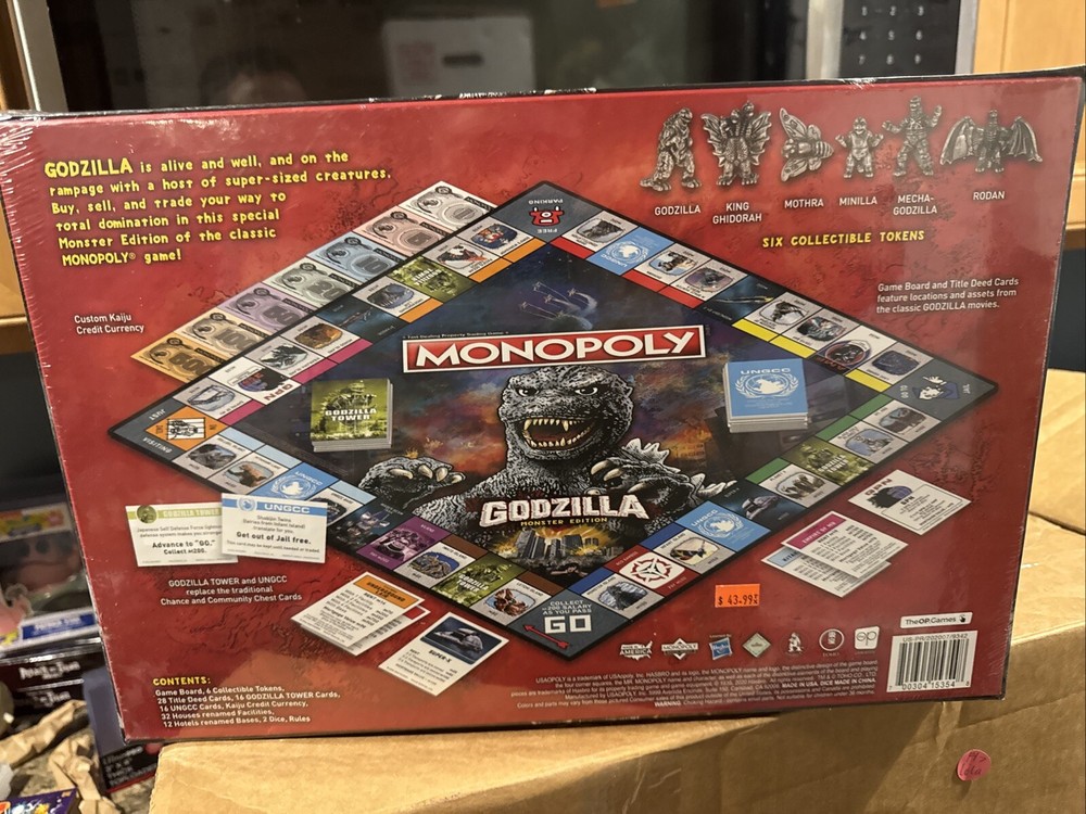 This is a USAopoly Monopoly board game with a Godzilla theme. The game features familiar locations and iconic Kaiju monsters. It is a board game designed for 2 or more players and suitable for ages 8 and up. The game title is Monopoly and it is officially licensed. The bundle description is none and the size is one size. The game type is a board game and it is categorized under Toys & Hobbies, Games, Board & Traditional Games, and Contemporary Manufacture.