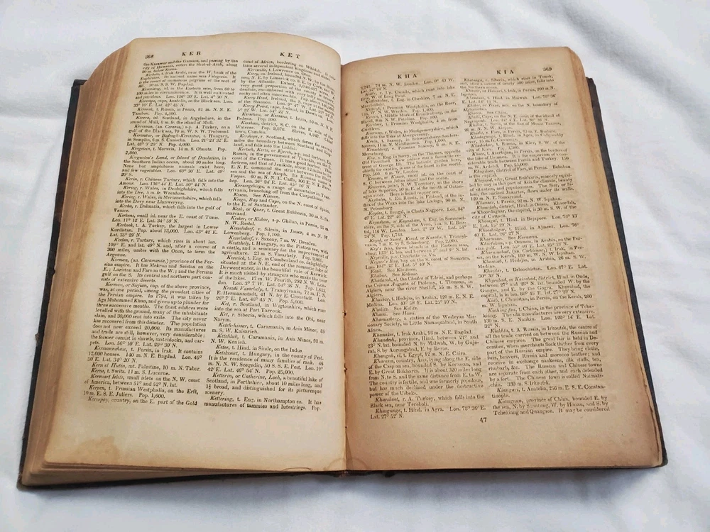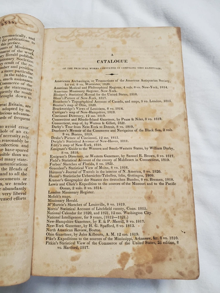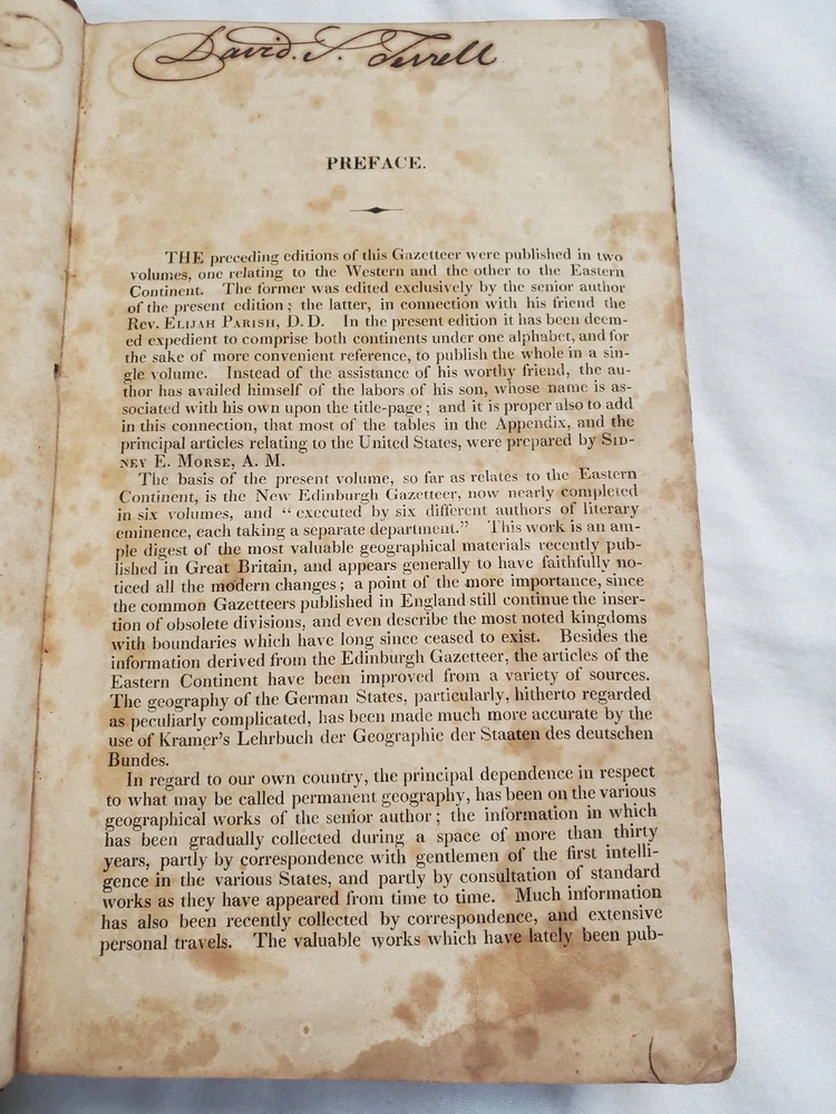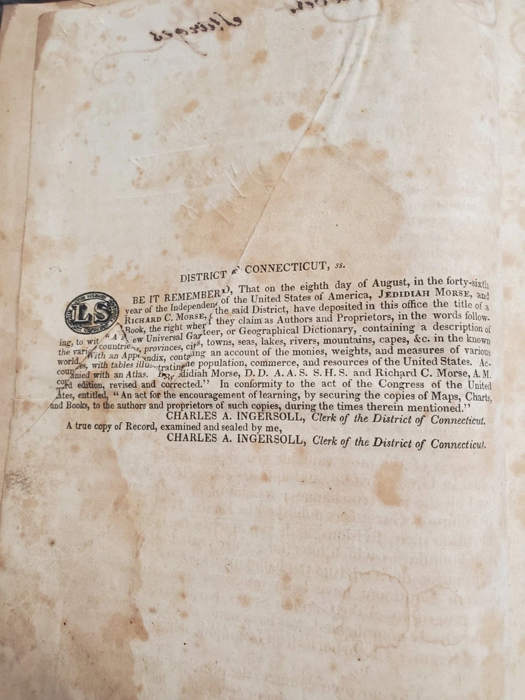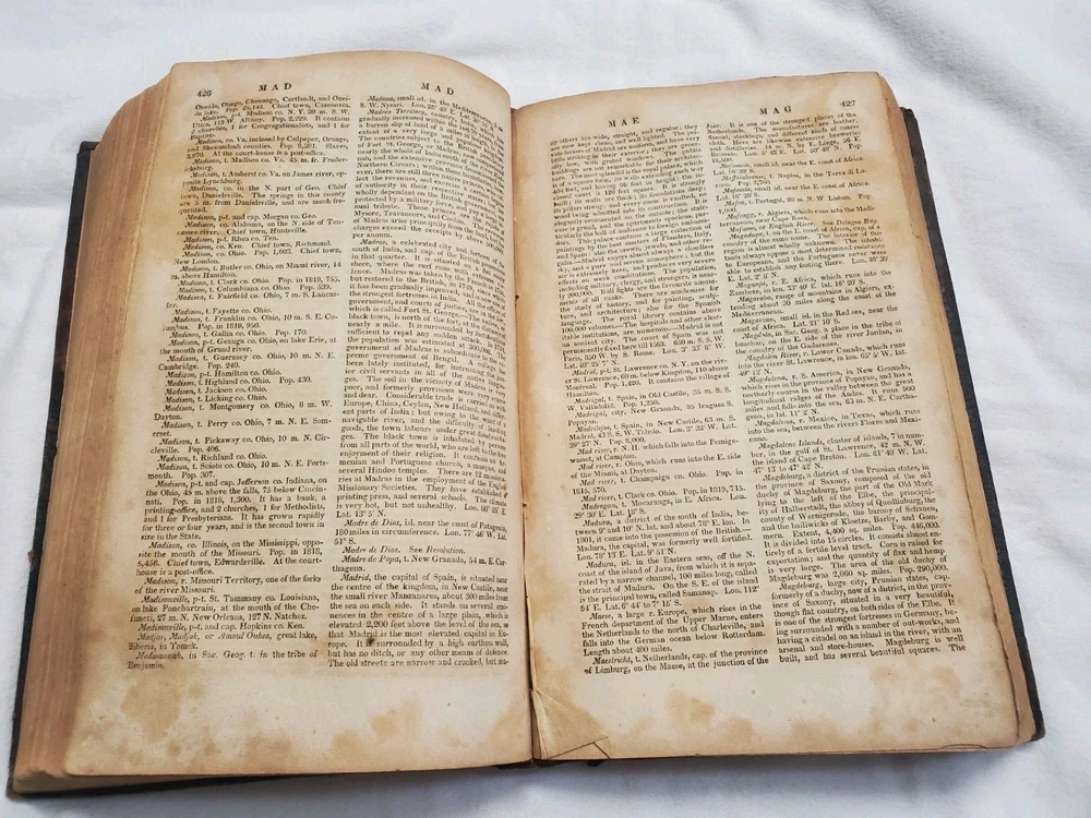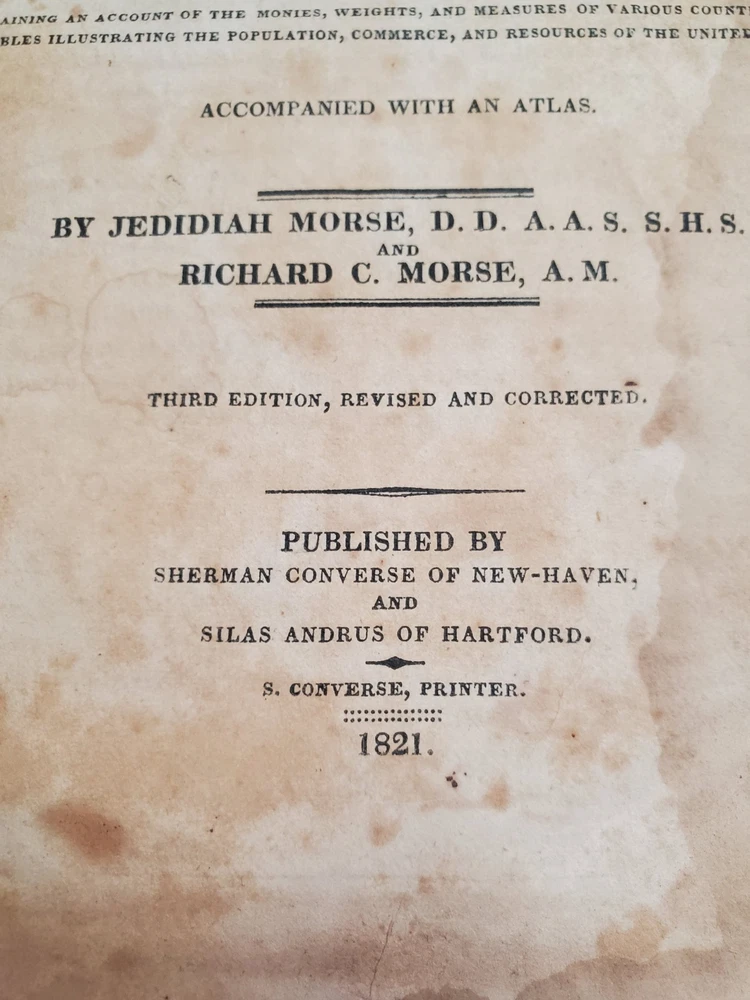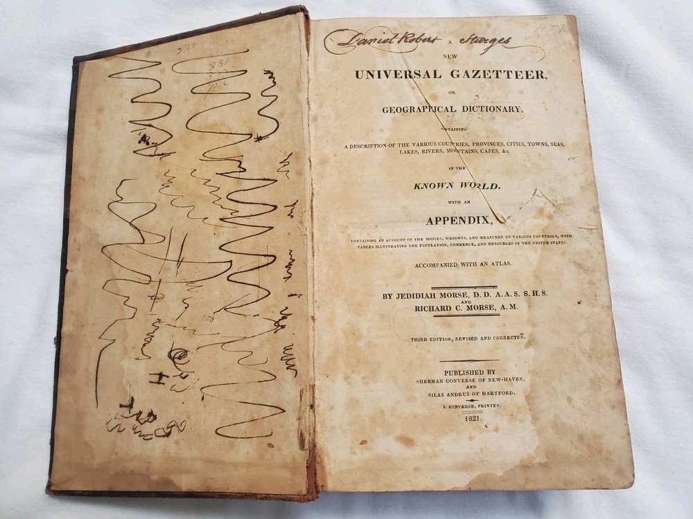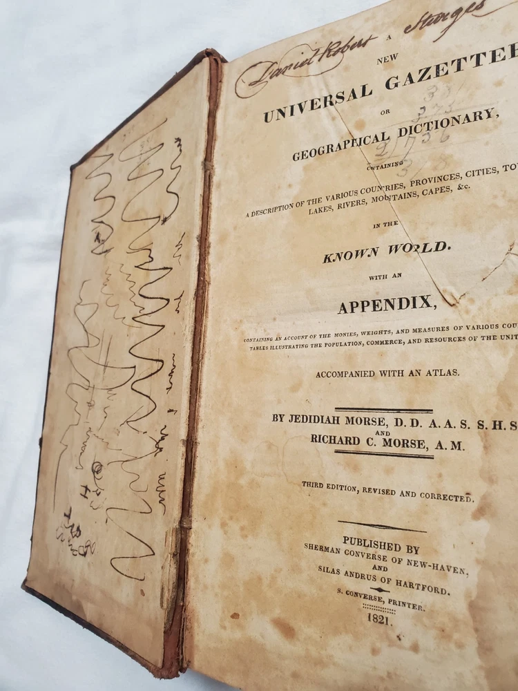 Book is in poor, rough condition. Pages are stained, some writing inside front cover and a name written inside. Cover is starting to separate from front and back cover, but most pages seem to be attached well. Please look closely at pictures! Book is 1821!!! This is a rare copy of Morse's New Universal Gazetteer of the known world, published by S. Converse in 1821. This third edition contains valuable information on geography and reference, and is written in English. The binding is made of leather and the book is in its original form. The authors, Jedidiah and Richard Morse, were well-known for their work in geography and cartography. This book is a must-have for collectors and enthusiasts of antique books.