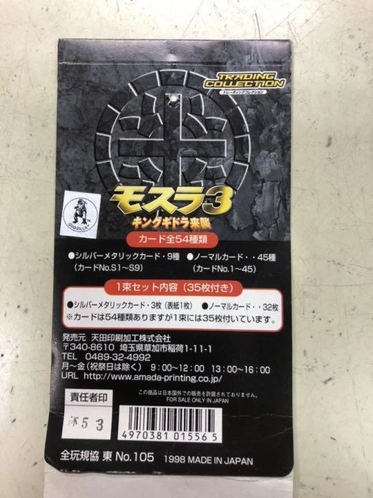 Item Title Mothra 3 Trading Card Complete 54 Sheets Payment Supports managed payments Please pay within 5 days after auction is finished. About Us We are located in Japan. It's our pleasure to make you happy by proposing our recommend item. If you have any questions or request about items, please feel free to ask us. International Buyers - Please Note: -Import duties, taxes, and charges are not included in the item price or shipping charges. These charges are the buyer's responsibility. -Please check with your country's customs office to determine what these additional costs will be prior to bidding/buying. -These charges are normally collected by the delivering freight (shipping) company or when you pick the item up - do not confuse them for additional shipping charges. -We do not mark merchandise values below value or mark items as - gifts - The US and International government regulations prohibit such behavior. Thank you for your understanding.