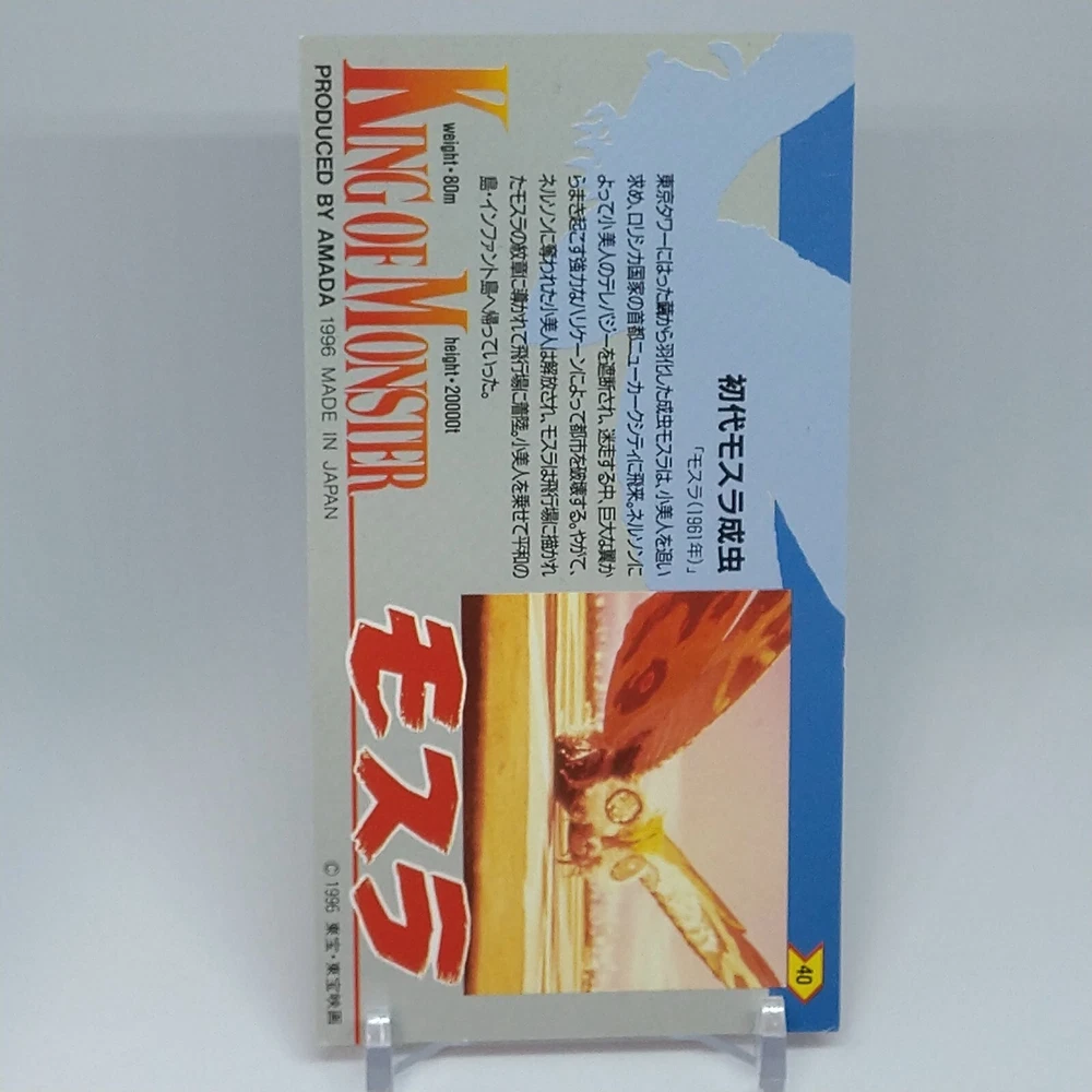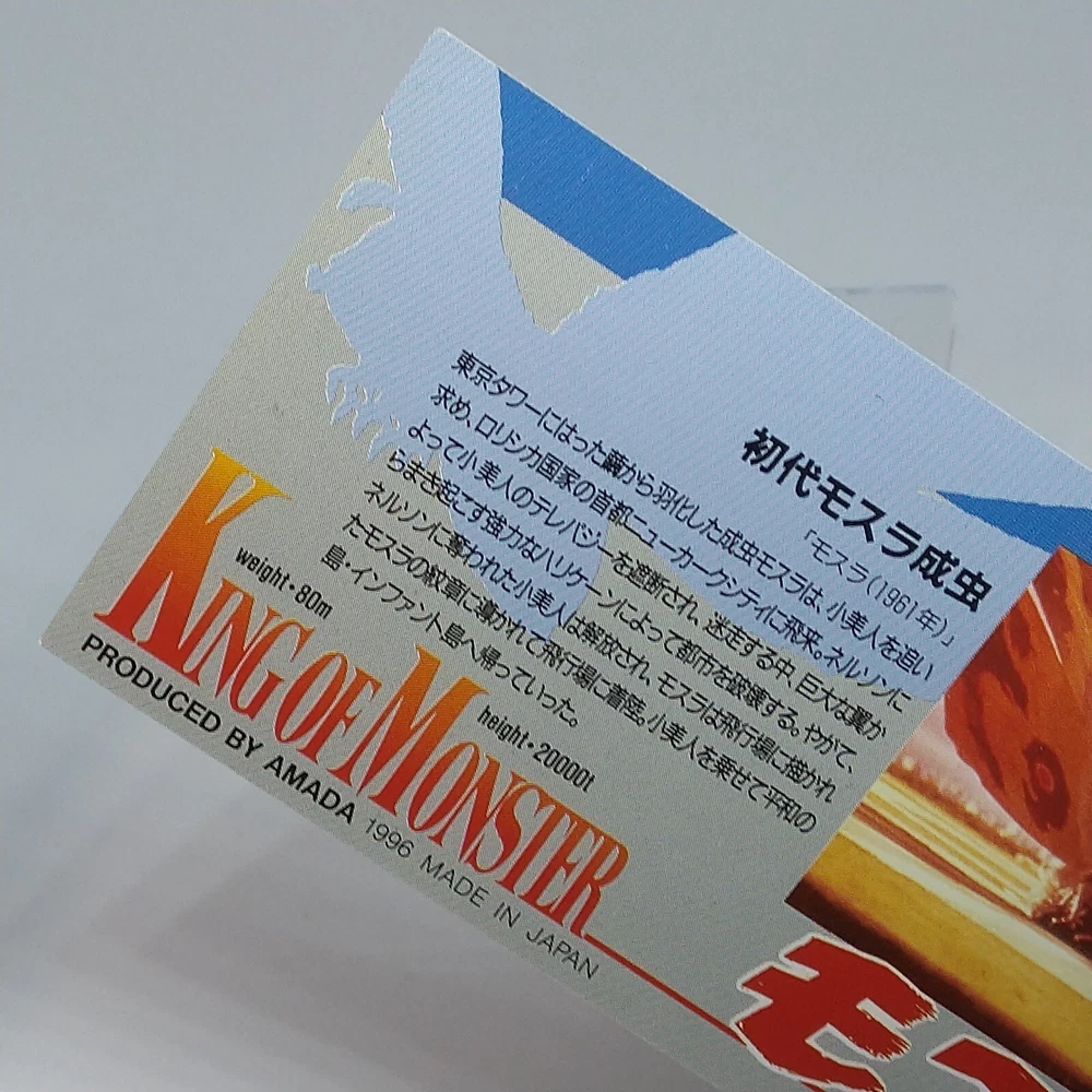 Mothra Adult Insect King of Monster Amada Wide Collection Card No.40 1996 Description Please see the picture for the details of damages and dirt or ask us before your purchase. 100% Authentic or Money Back Guaranteed. (Do not worry you are protected by eBay and eBay Managed Payments) See the pictures for more details. If you have any question about the condition, accessories, or anything about the product, please feel free to message us. We are glad to answer all your concerns. Payment Same as ebay payment method. Shipping Economy shipping: Delivery time will be about 11 - 23 days. Standard shipping: Delivery time will be about 5 - 10 days. Expedited shipping: Delivery time will be about 1 - 4 days. Terms of Sale Money back guarantee within 30 days if returned by customer. We would not be able to accept your bid if you; 1) Don't have a PayPal account. 2) Have unpaid items reported. 3) Have a primary shipping address in countries you don't ship to. 4) Have reportedly violated eBay policies. 5) Have a Feedback score lower than the number you specify. International Buyers - Please Note: Import duties, taxes and charges are not included in the item price or shipping charges. These charges are the buyer's responsibility. Please check with your country's customs office to determine what these additional costs will be prior to bidding/buying. These charges are normally collected by the delivering freight (shipping) company or when you pick the item up - do not confuse them for additional shipping charges.