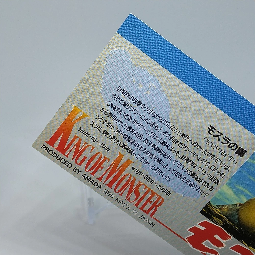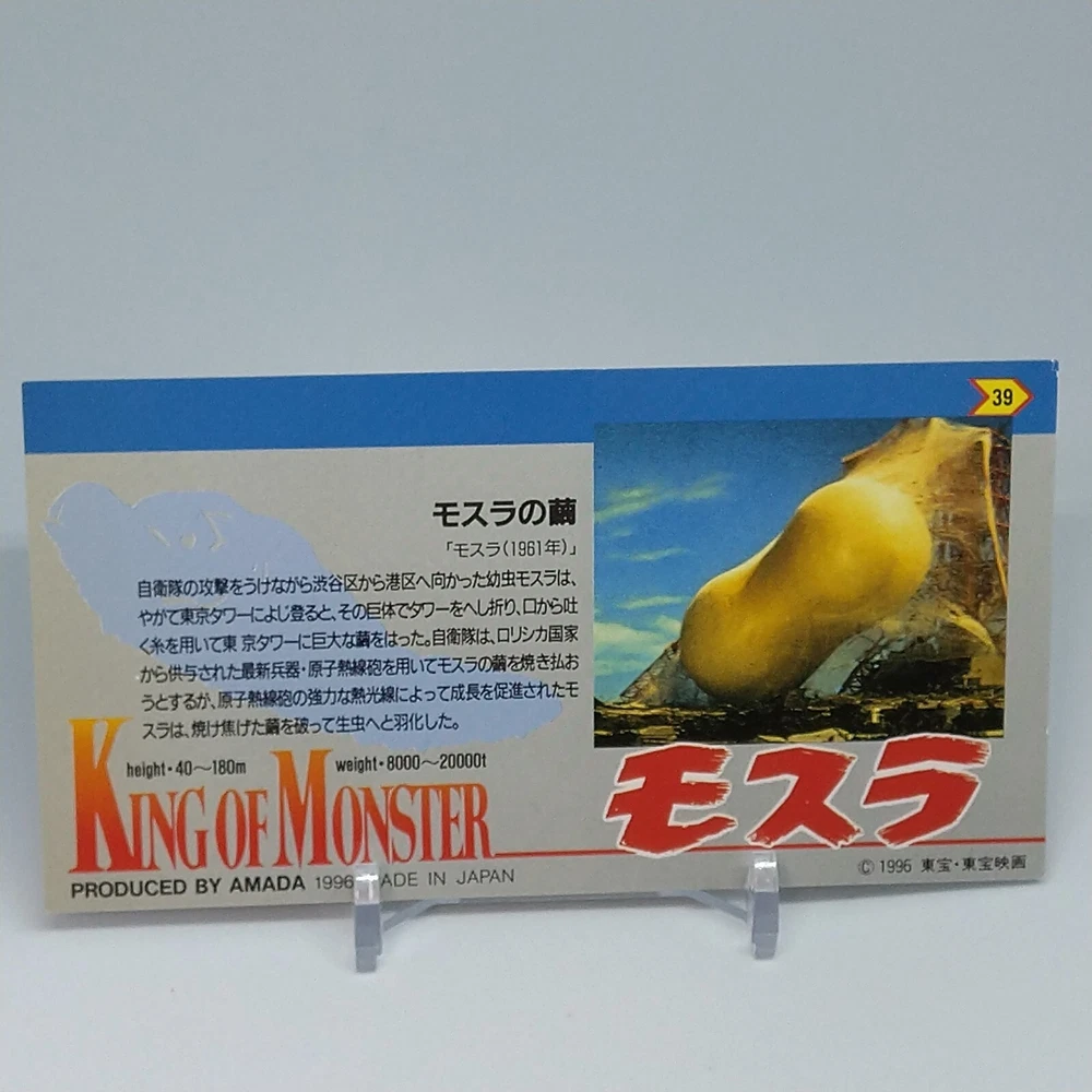 Mothra Cocoon King of Monster Amada Wide Collection Trading Card No.39 1996 Description Please see the picture for the details of damages and dirt or ask us before your purchase. 100% Authentic or Money Back Guaranteed. (Do not worry you are protected by eBay and eBay Managed Payments) See the pictures for more details. If you have any question about the condition, accessories, or anything about the product, please feel free to message us. We are glad to answer all your concerns. Payment Same as ebay payment method. Shipping Economy shipping: Delivery time will be about 11 - 23 days. Standard shipping: Delivery time will be about 5 - 10 days. Expedited shipping: Delivery time will be about 1 - 4 days. Terms of Sale Money back guarantee within 30 days if returned by customer. We would not be able to accept your bid if you; 1) Don't have a PayPal account. 2) Have unpaid items reported. 3) Have a primary shipping address in countries you don't ship to. 4) Have reportedly violated eBay policies. 5) Have a Feedback score lower than the number you specify. International Buyers - Please Note: Import duties, taxes and charges are not included in the item price or shipping charges. These charges are the buyer's responsibility. Please check with your country's customs office to determine what these additional costs will be prior to bidding/buying. These charges are normally collected by the delivering freight (shipping) company or when you pick the item up - do not confuse them for additional shipping charges.
