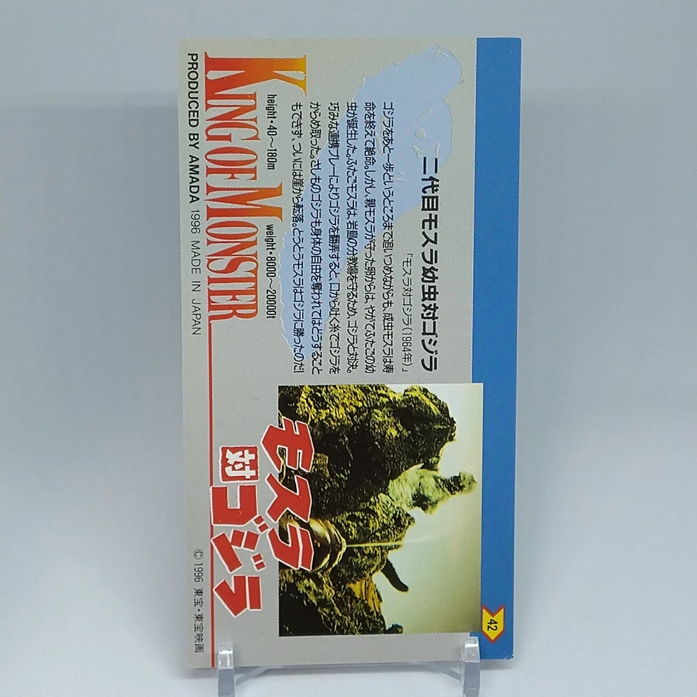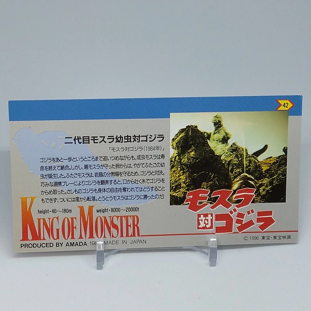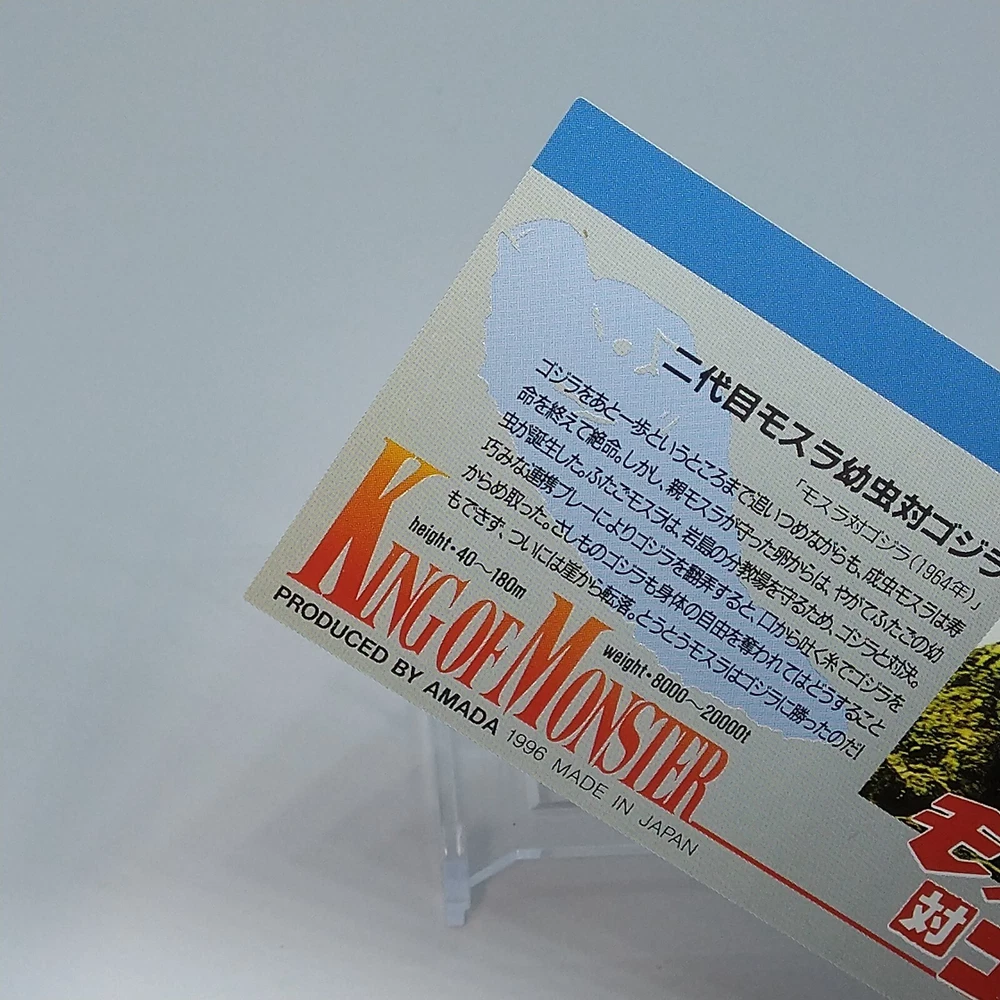 Mothra Godzilla King of Monster Amada Wide Collection Trading Card No.42 1996 Description Please see the picture for the details of damages and dirt or ask us before your purchase. 100% Authentic or Money Back Guaranteed. (Do not worry you are protected by eBay and eBay Managed Payments) See the pictures for more details. If you have any question about the condition, accessories, or anything about the product, please feel free to message us. We are glad to answer all your concerns. Payment Same as ebay payment method. Shipping Economy shipping: Delivery time will be about 11 - 23 days. Standard shipping: Delivery time will be about 5 - 10 days. Expedited shipping: Delivery time will be about 1 - 4 days. Terms of Sale Money back guarantee within 30 days if returned by customer. We would not be able to accept your bid if you; 1) Don't have a PayPal account. 2) Have unpaid items reported. 3) Have a primary shipping address in countries you don't ship to. 4) Have reportedly violated eBay policies. 5) Have a Feedback score lower than the number you specify. International Buyers - Please Note: Import duties, taxes and charges are not included in the item price or shipping charges. These charges are the buyer's responsibility. Please check with your country's customs office to determine what these additional costs will be prior to bidding/buying. These charges are normally collected by the delivering freight (shipping) company or when you pick the item up - do not confuse them for additional shipping charges.