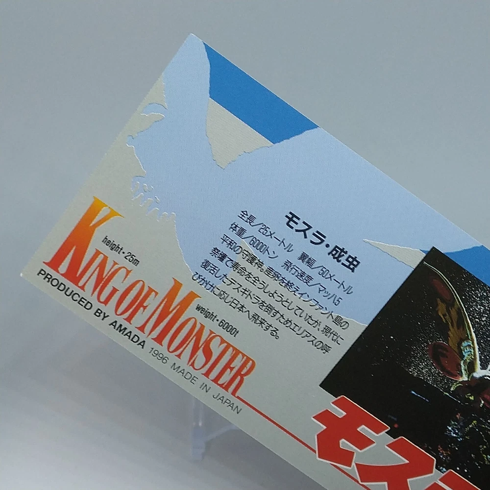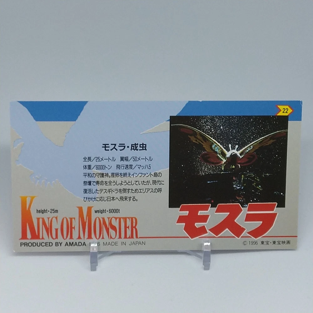 Mothra King of Monster Amada Wide Collection Trading Card No.22 Japanese 1996 Description Please see the picture for the details of damages and dirt or ask us before your purchase. 100% Authentic or Money Back Guaranteed. (Do not worry you are protected by eBay and eBay Managed Payments) See the pictures for more details. If you have any question about the condition, accessories, or anything about the product, please feel free to message us. We are glad to answer all your concerns. Payment Same as ebay payment method. Shipping Economy shipping: Delivery time will be about 11 - 23 days. Standard shipping: Delivery time will be about 5 - 10 days. Expedited shipping: Delivery time will be about 1 - 4 days. Terms of Sale Money back guarantee within 30 days if returned by customer. We would not be able to accept your bid if you; 1) Don't have a PayPal account. 2) Have unpaid items reported. 3) Have a primary shipping address in countries you don't ship to. 4) Have reportedly violated eBay policies. 5) Have a Feedback score lower than the number you specify. International Buyers - Please Note: Import duties, taxes and charges are not included in the item price or shipping charges. These charges are the buyer's responsibility. Please check with your country's customs office to determine what these additional costs will be prior to bidding/buying. These charges are normally collected by the delivering freight (shipping) company or when you pick the item up - do not confuse them for additional shipping charges.