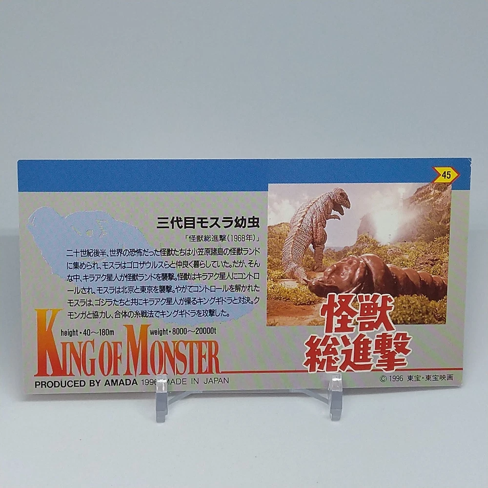 Mothra Larva King of Monster Amada Wide Collection Trading Card No.45 1996 Description Please see the picture for the details of damages and dirt or ask us before your purchase. 100% Authentic or Money Back Guaranteed. (Do not worry you are protected by eBay and eBay Managed Payments) See the pictures for more details. If you have any question about the condition, accessories, or anything about the product, please feel free to message us. We are glad to answer all your concerns. Payment Same as ebay payment method. Shipping Economy shipping: Delivery time will be about 11 - 23 days. Standard shipping: Delivery time will be about 5 - 10 days. Expedited shipping: Delivery time will be about 1 - 4 days. Terms of Sale Money back guarantee within 30 days if returned by customer. We would not be able to accept your bid if you; 1) Don't have a PayPal account. 2) Have unpaid items reported. 3) Have a primary shipping address in countries you don't ship to. 4) Have reportedly violated eBay policies. 5) Have a Feedback score lower than the number you specify. International Buyers - Please Note: Import duties, taxes and charges are not included in the item price or shipping charges. These charges are the buyer's responsibility. Please check with your country's customs office to determine what these additional costs will be prior to bidding/buying. These charges are normally collected by the delivering freight (shipping) company or when you pick the item up - do not confuse them for additional shipping charges.