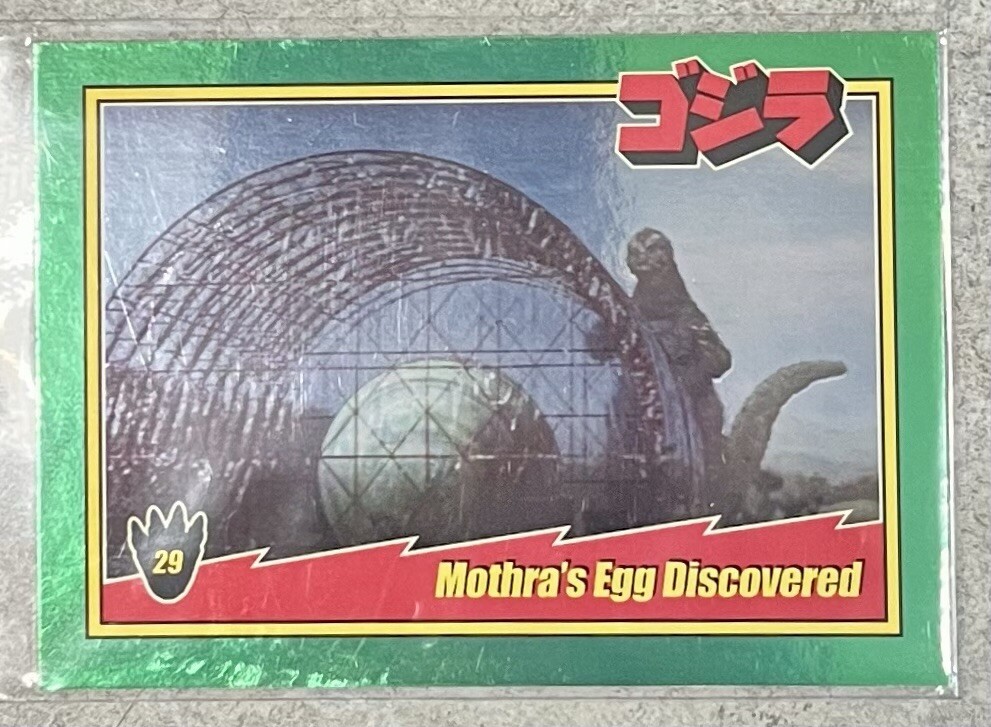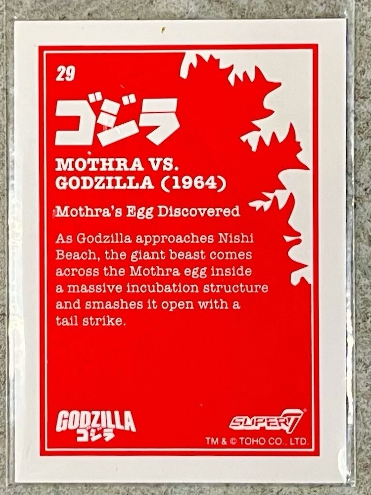 Delve into the world of classic sci-fi with the "Mothra's Egg Discovered 2024" collectible from the SUPER 7 GODZILLA Toho Showa Series 1 #29. This non-sport trading card captures the iconic moment from the 1964 film "Mothra Vs. Godzilla," featuring the legendary creature, Godzilla, in all his glory. A must-have for fans and collectors, the card boasts rich detailing and vibrant colors that bring the epic battle to life. Celebrate the enduring legacy of the Godzilla franchise with this exquisite piece of memorabilia that pays homage to one of the most beloved chapters in the series.